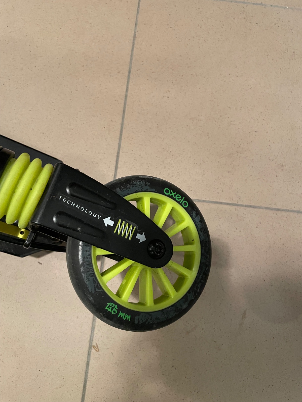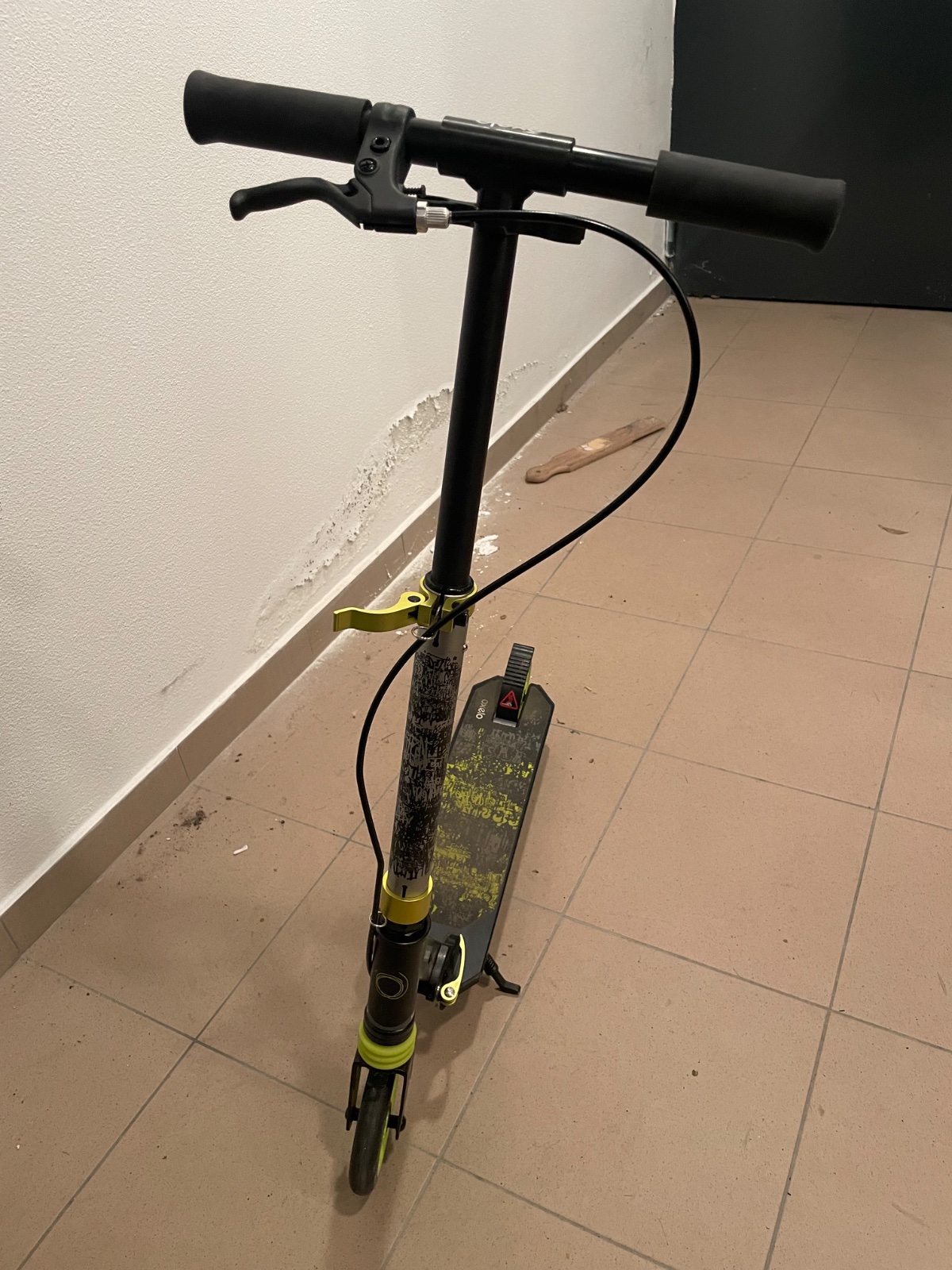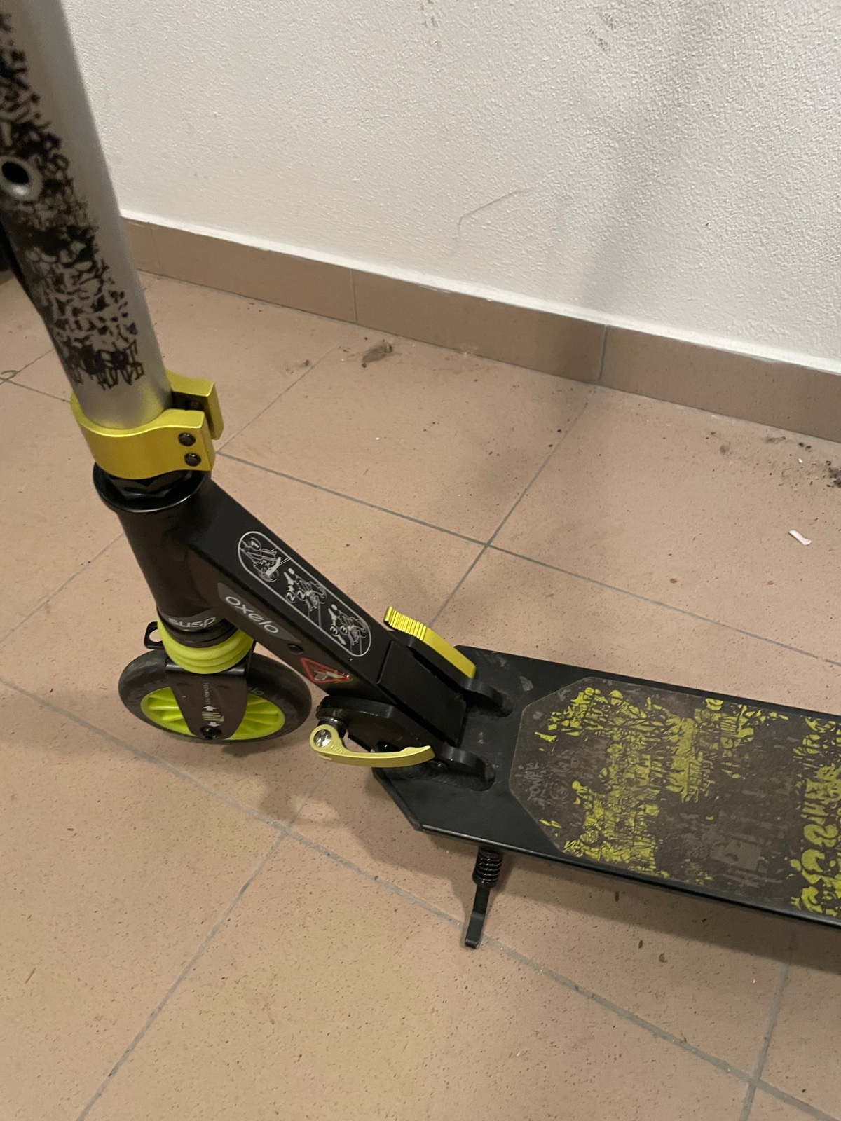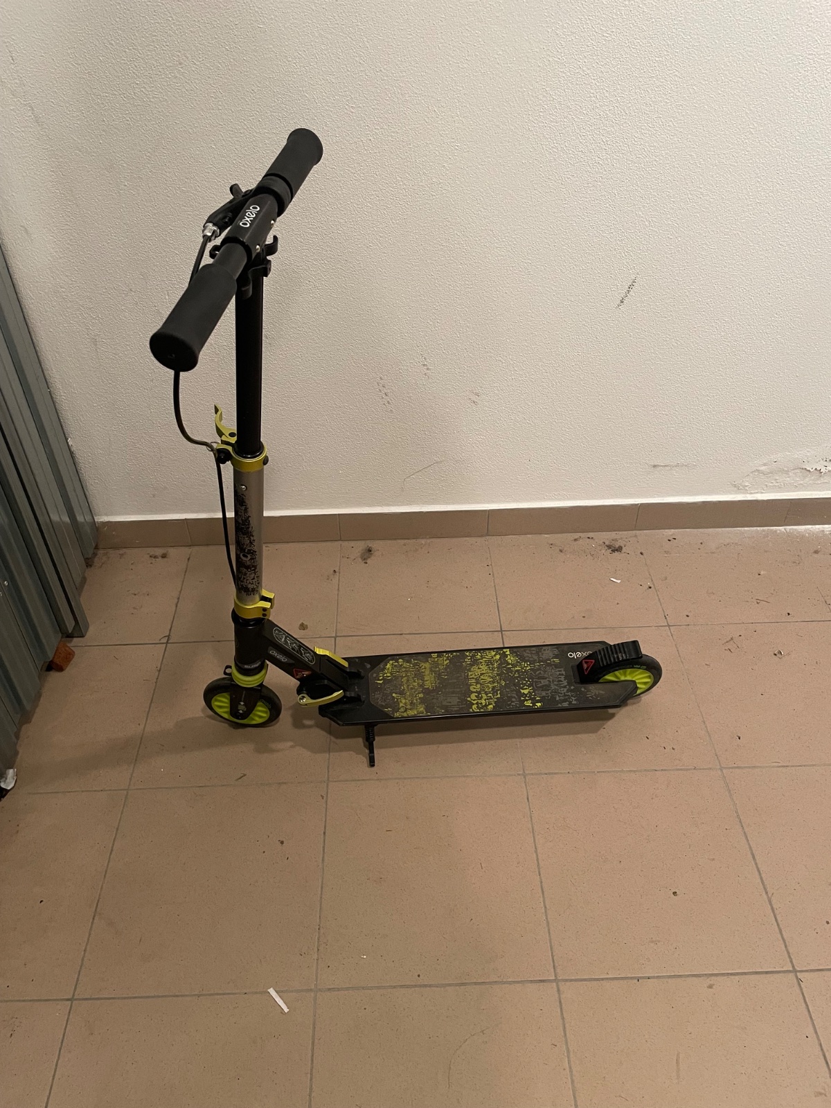 Detska kolobežka Oxelo Mid 5 v čierno-zelenom prevedení. Je vybavená ručnou brzdou na riadidlách a zadnou nášľapnou brzdou pre lepšiu kontrolu.