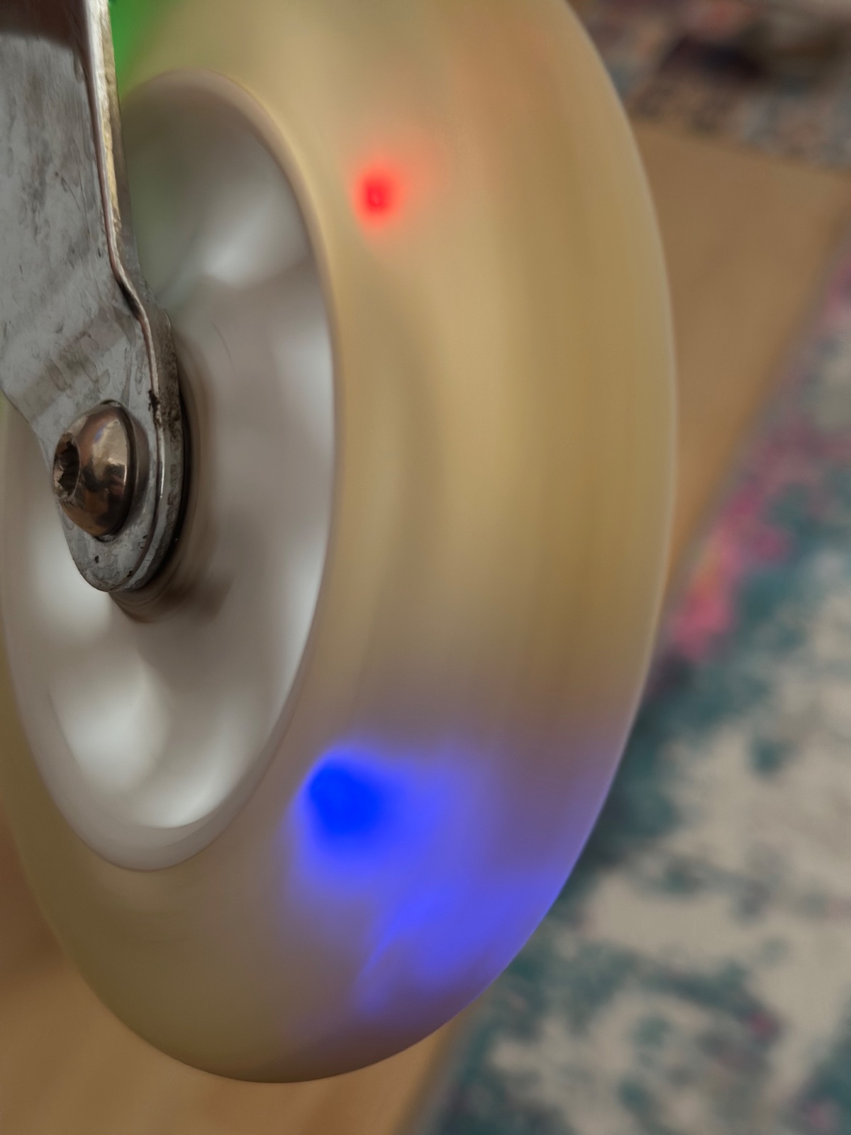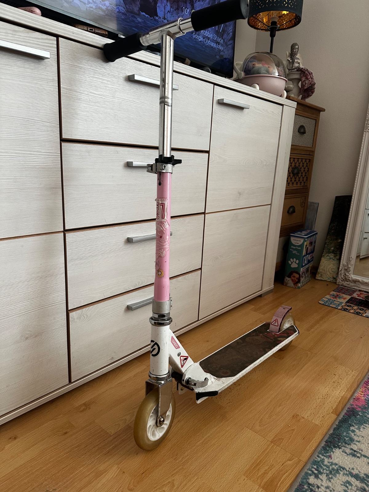 Perfektná kolobežka z Decathlonu. Má dokúpené svietiace kolieska takže večer krásne vidno svetielka. Používaná od 5 do 8 rokov
