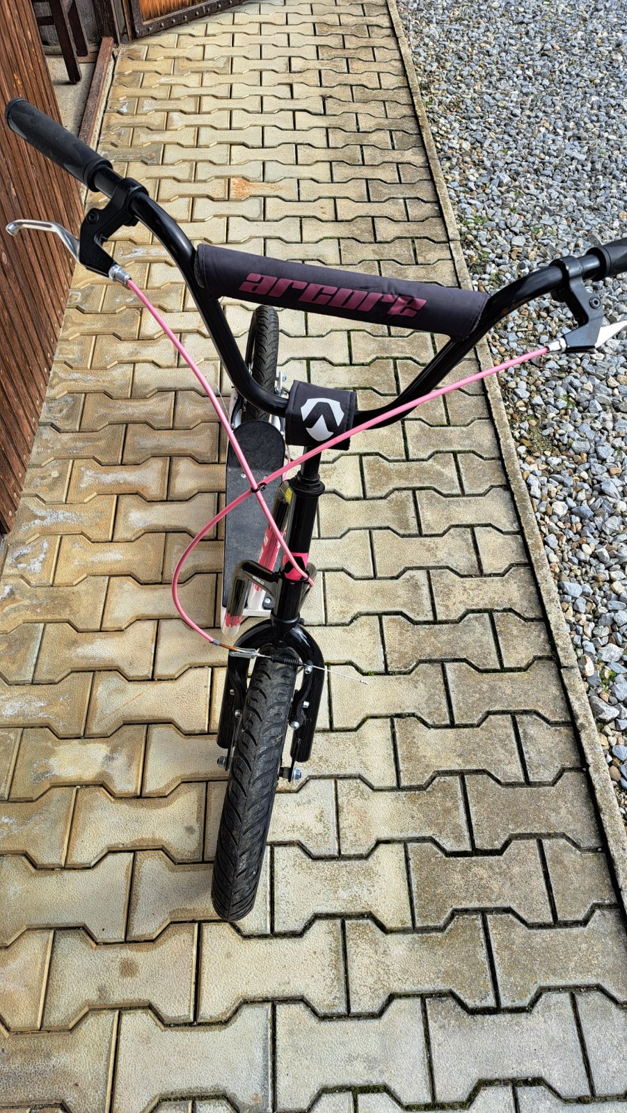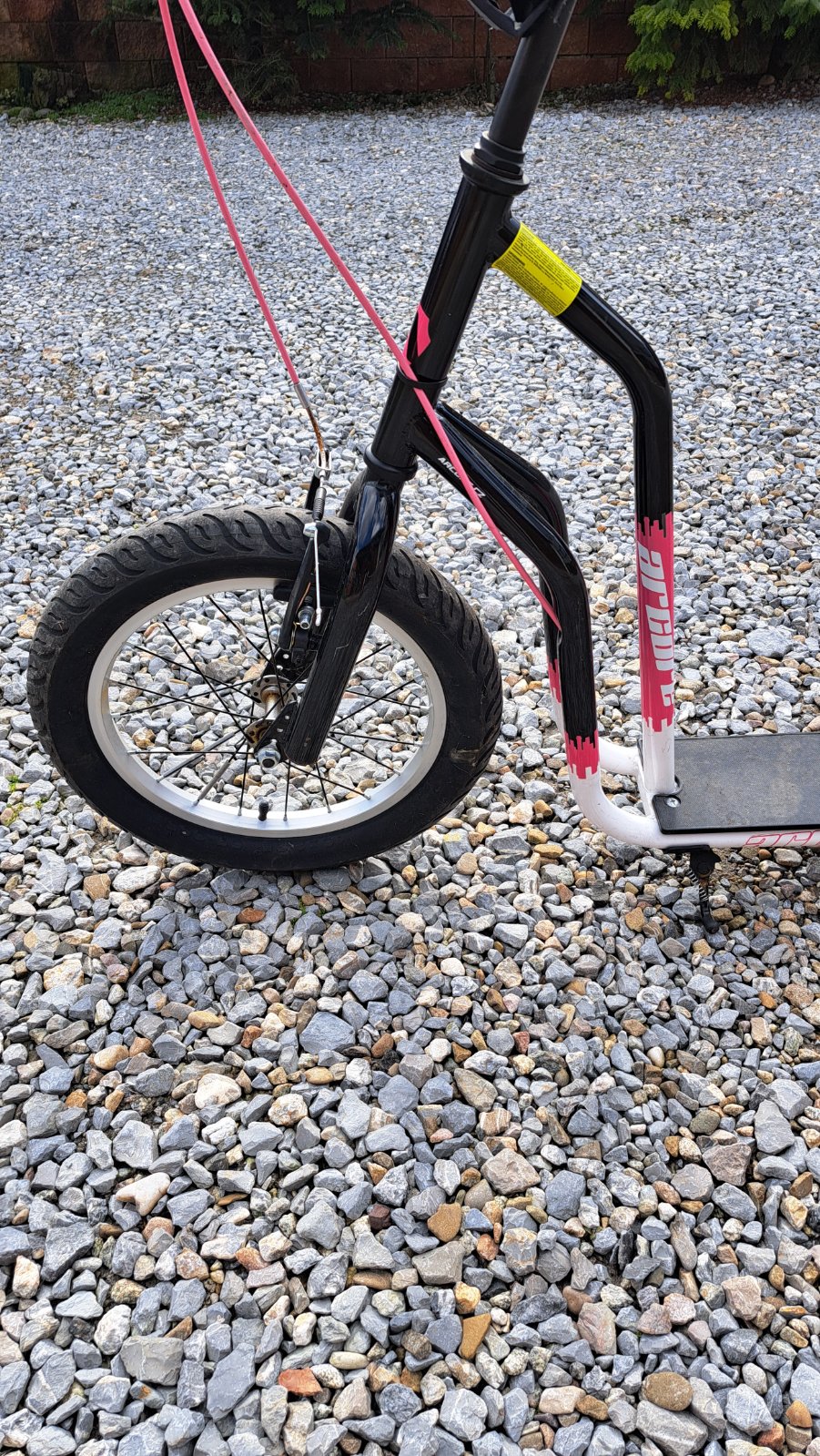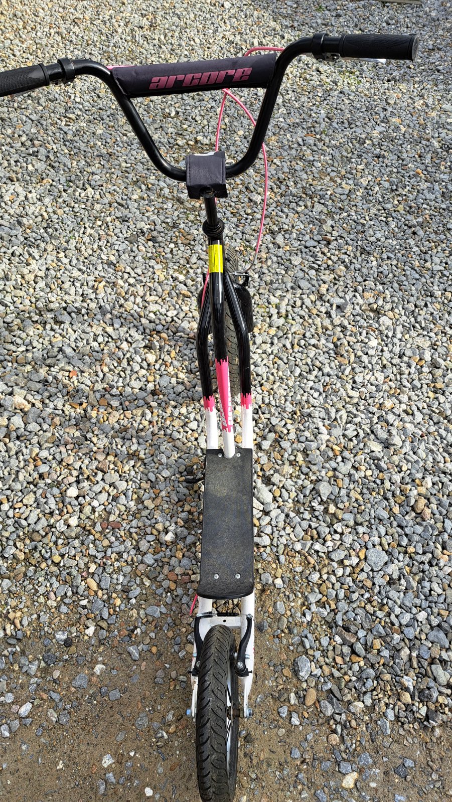 Predám kolobežku pre dievča čierno-ružovej farby, zn.Arcore shorty, predné koleso väčšie 16" (priemer 40 cm), zadné 12" priemer 30 cm, s ručnou brzdou a stojanom. Kúpená v športovom obchode.