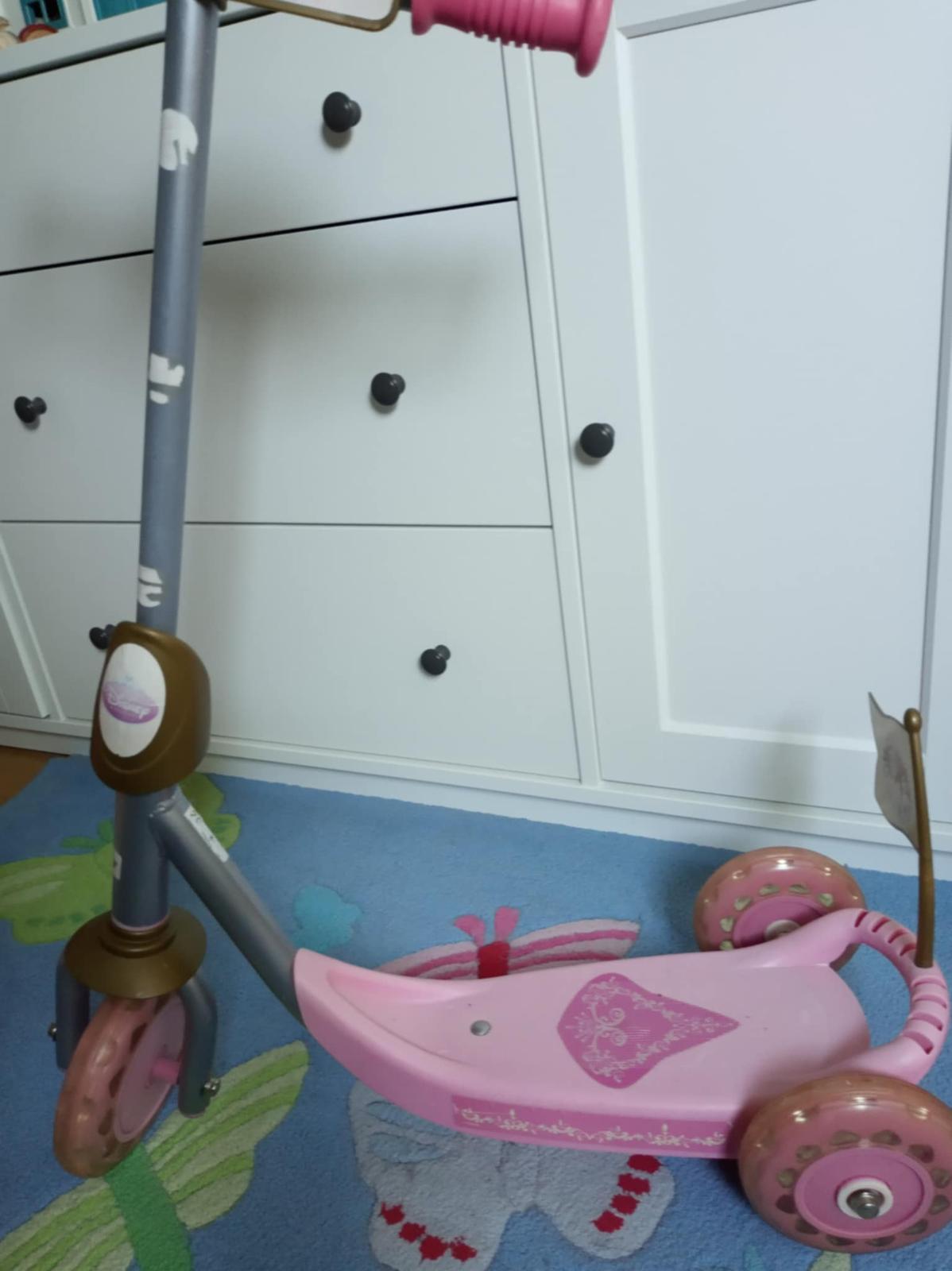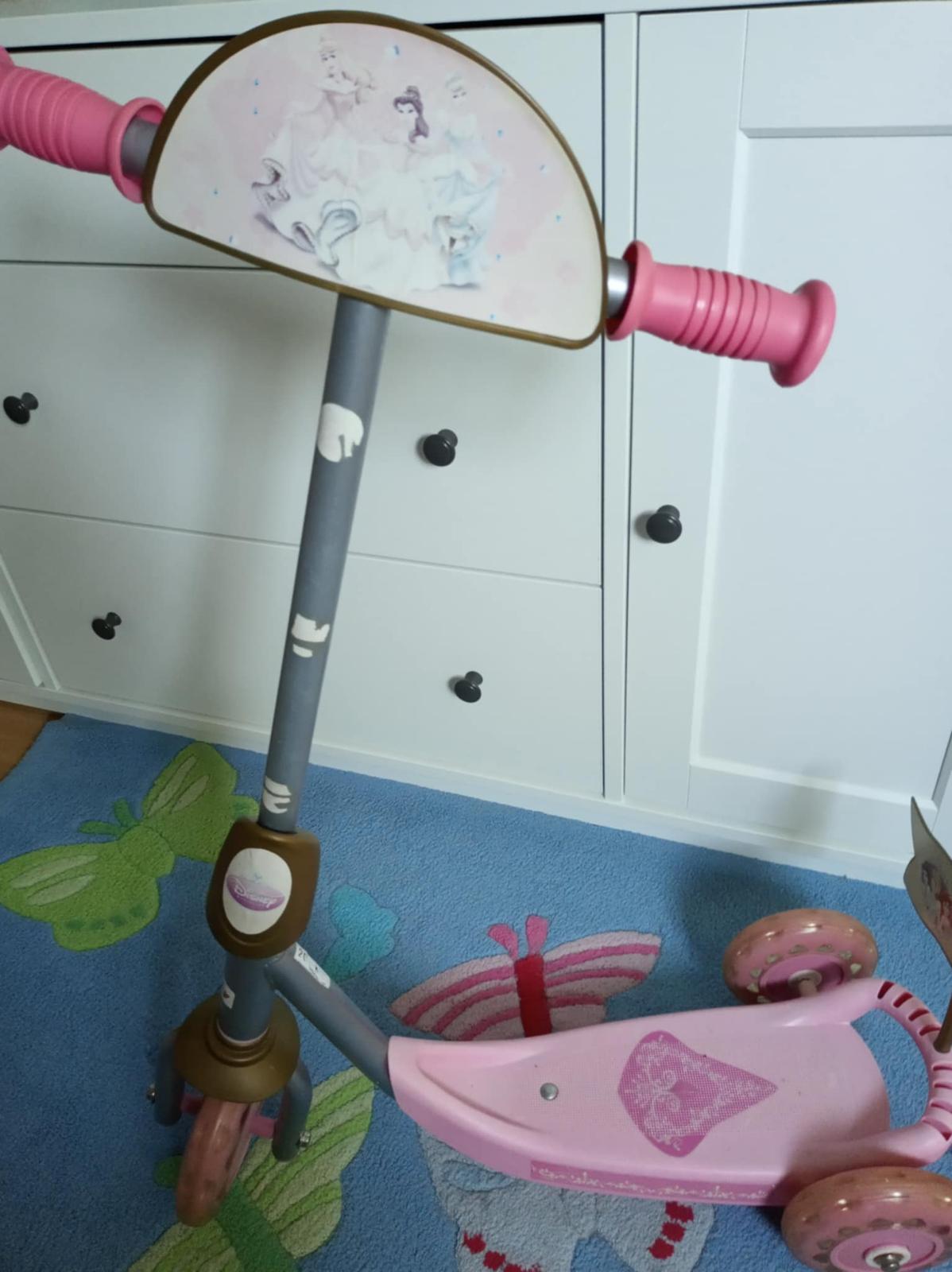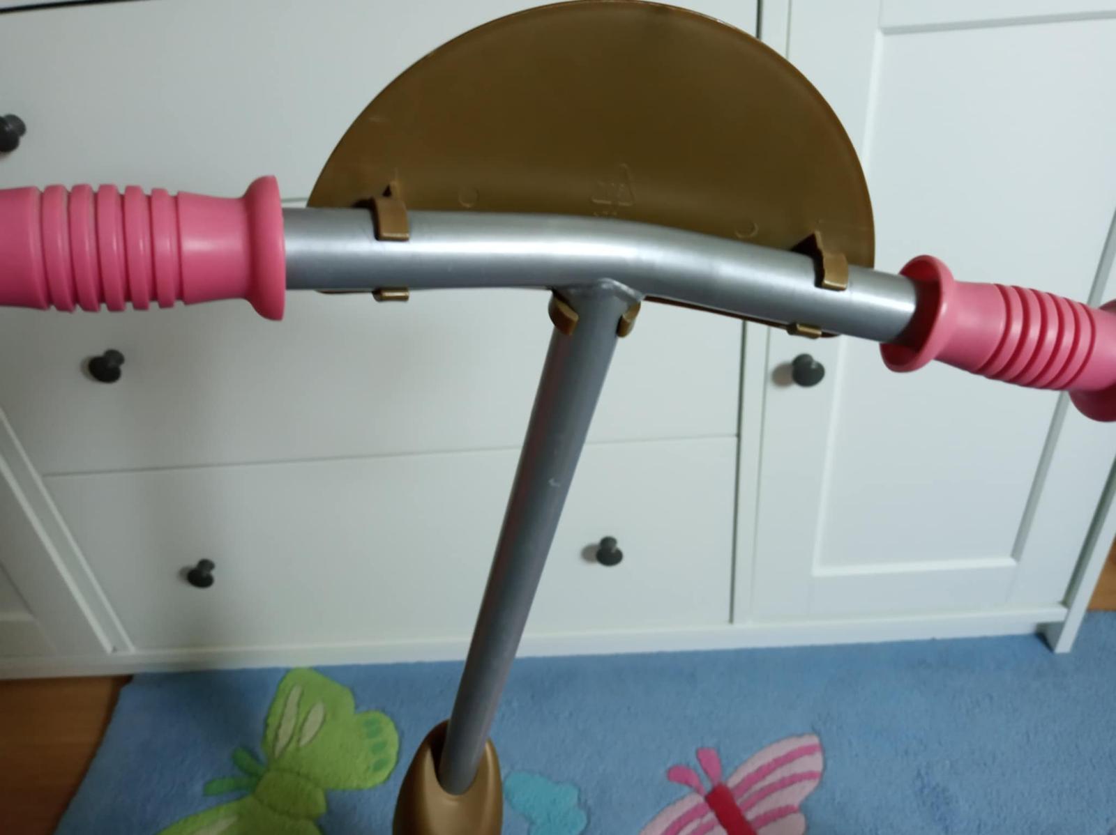 Trojkolesová kolobežka Smoby. Používaná v interiéri. Nesie známky používania (plasty na kovovej konštrukcii pri kolienkach odlomené), ale stále funkčná.