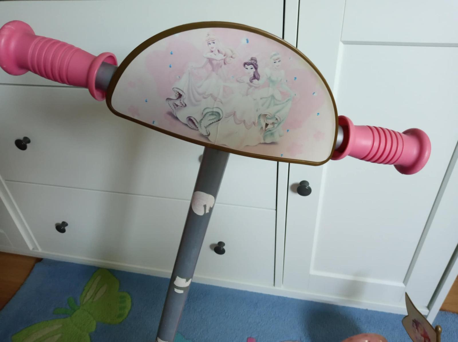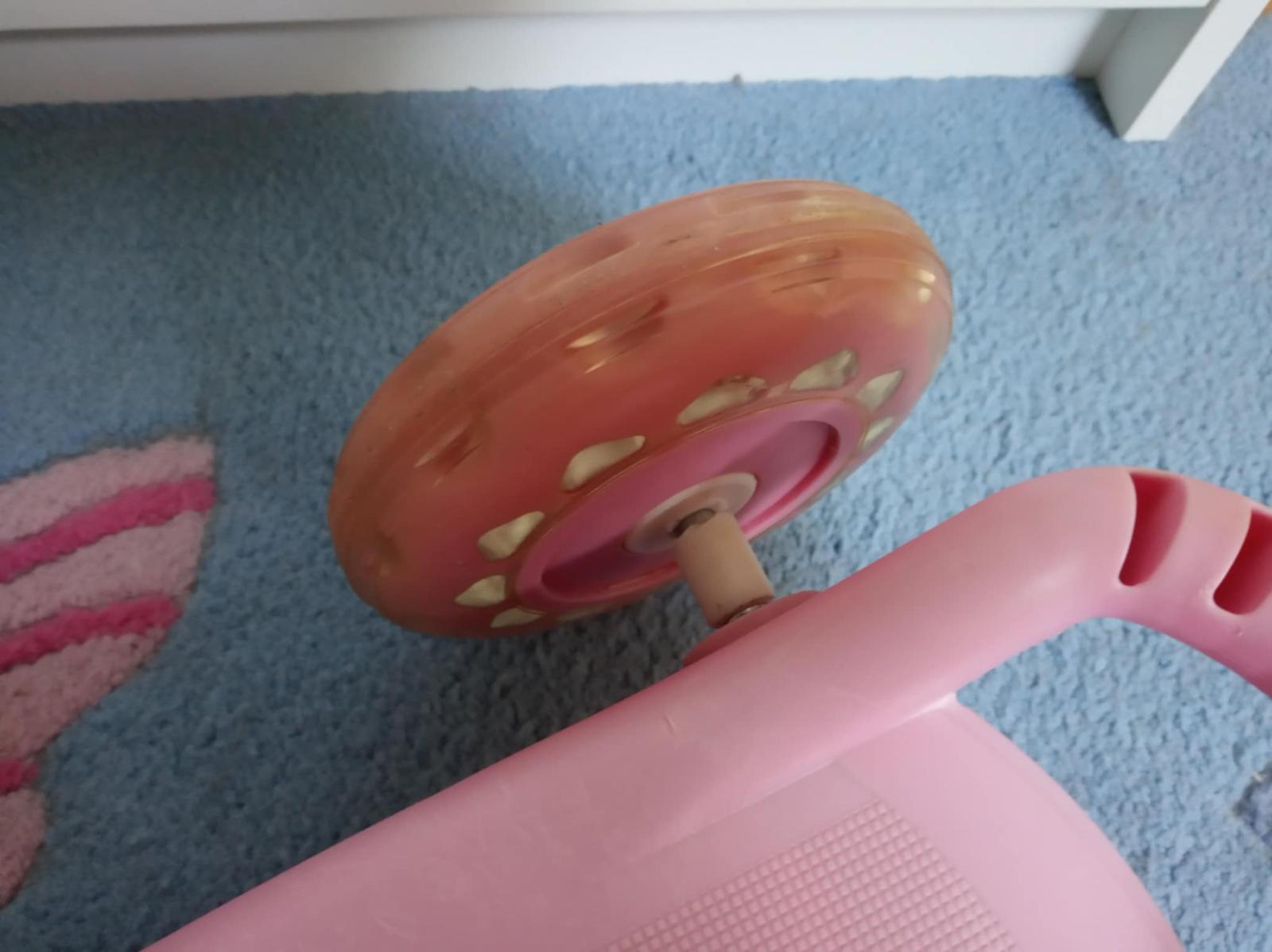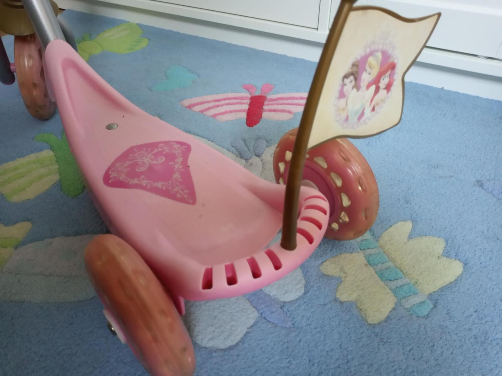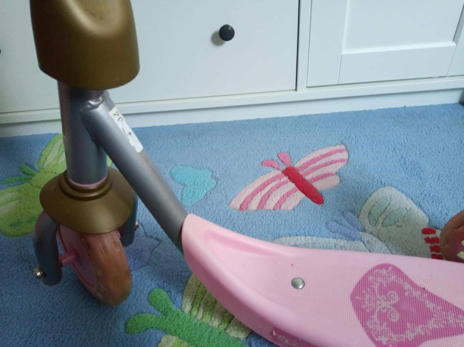 Trojkolesová kolobežka Smoby. Používaná v interiéri. Nesie známky používania (plasty na kovovej konštrukcii pri kolienkach odlomené), ale stále funkčná.