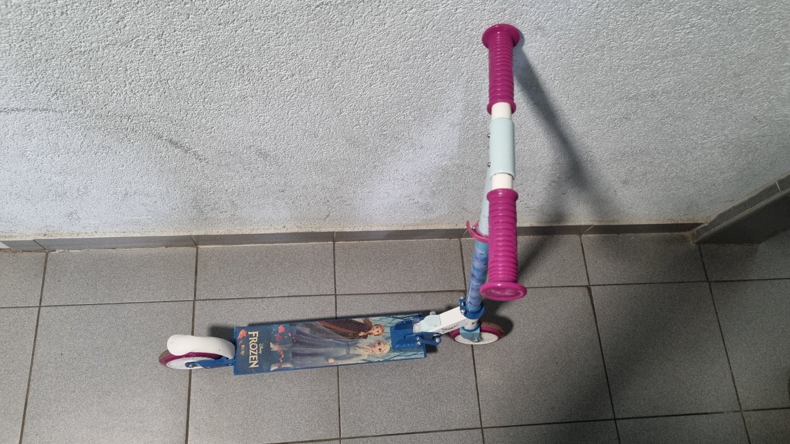 Stav ako na foto. Kolobezka stále super jazdi. Kolieska sú vymenené za svietiace, ale mám aj povodne,