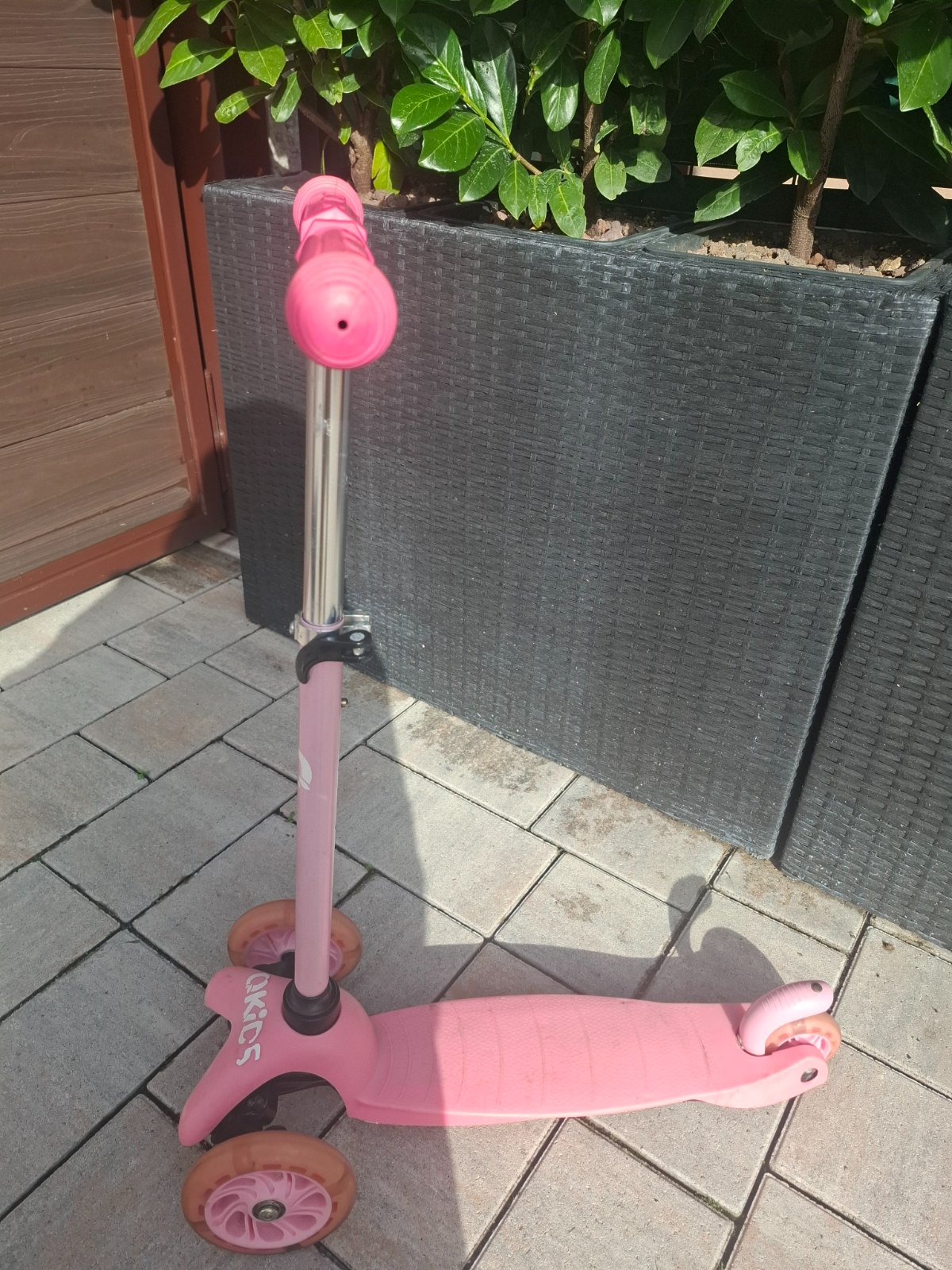 Predám detskú kolobežku vhodnú cca do 4 rokov. Je v dobrom stave, kolieska pri pohybe v tme svietia, volant sa dá nastaviť. Brzda na zadných kolieskach je funkčná.