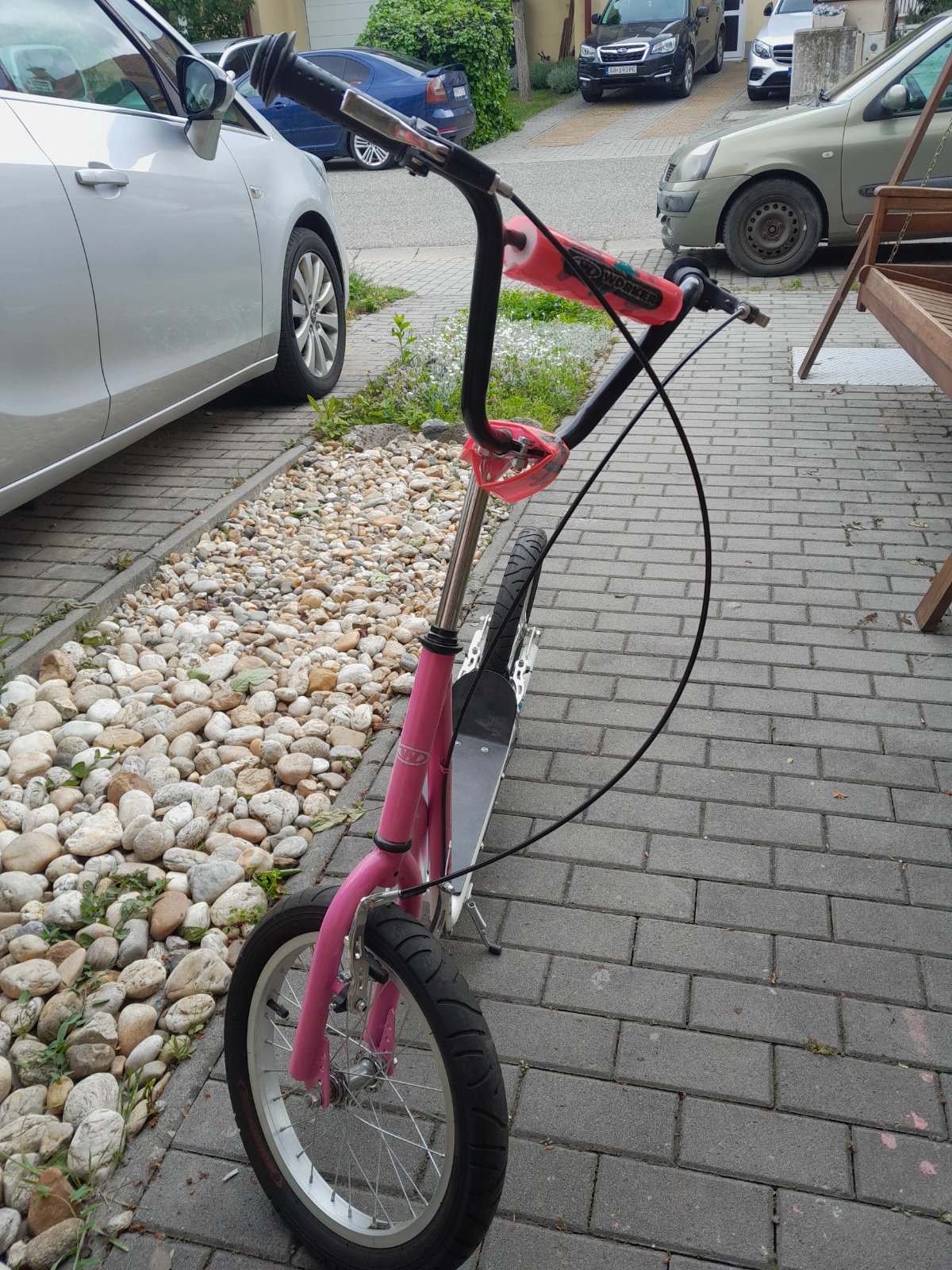 Kolobežka pre aj dospelých pre dievčatá a dámy. Veľké kolesá na nafukovanie. Brzdy na rúčke. Málo používaná, nebaví ma to.