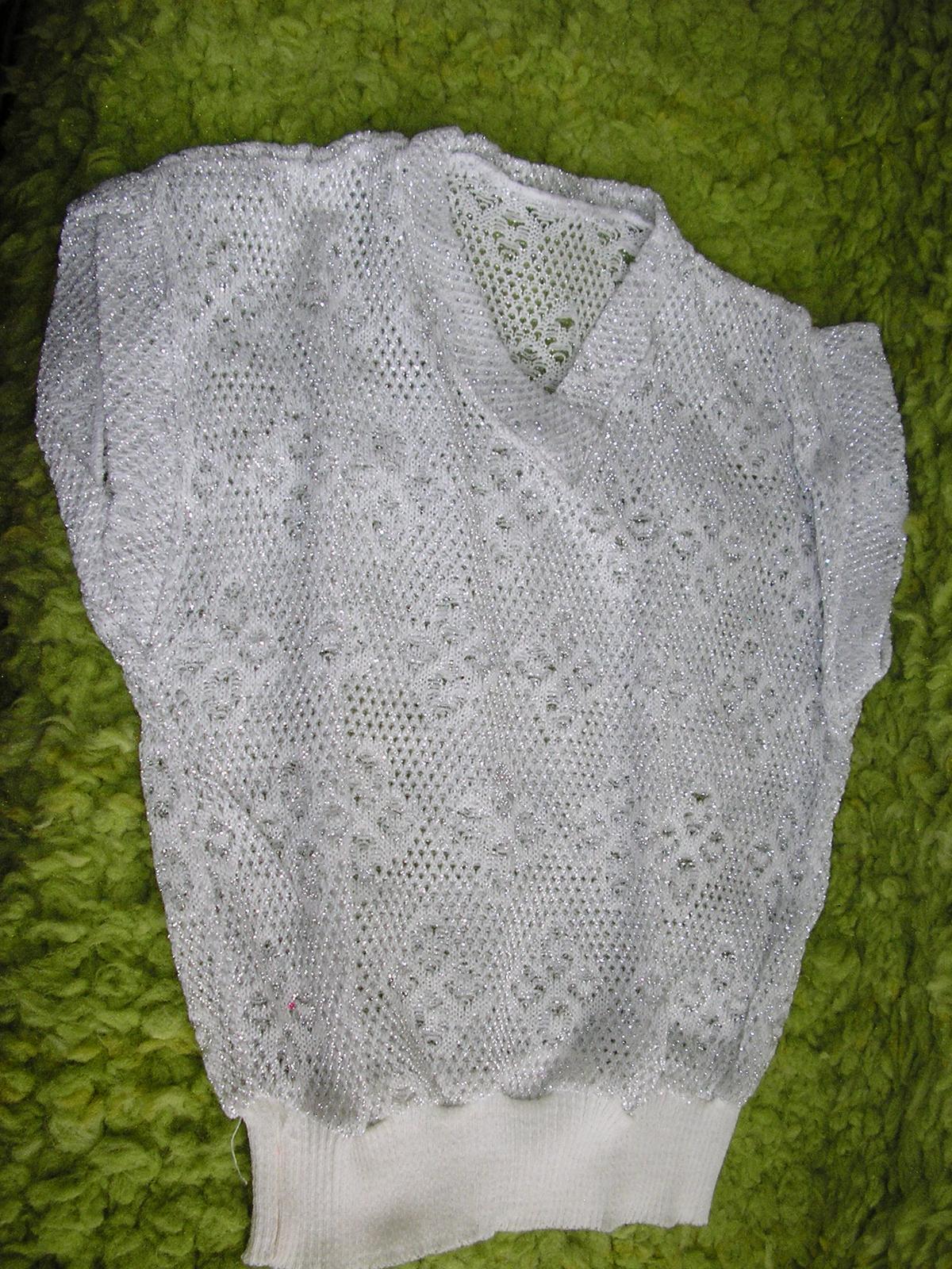 2. Tričko s trblietavými nitkami je moderné, elegantné, nenosené. Výstrih do „V“, rovný dolný okraj dokončený s pružným patentom.
