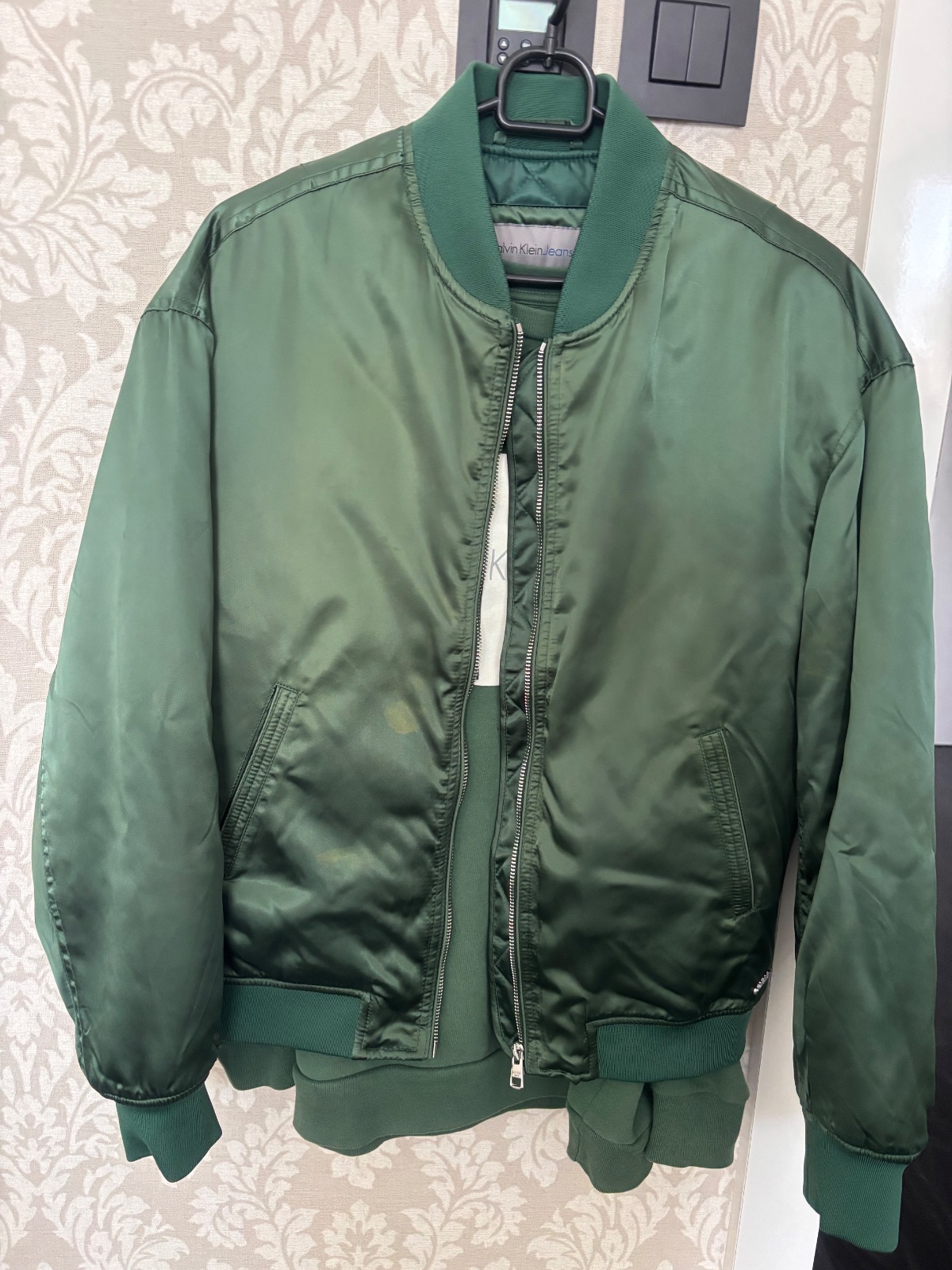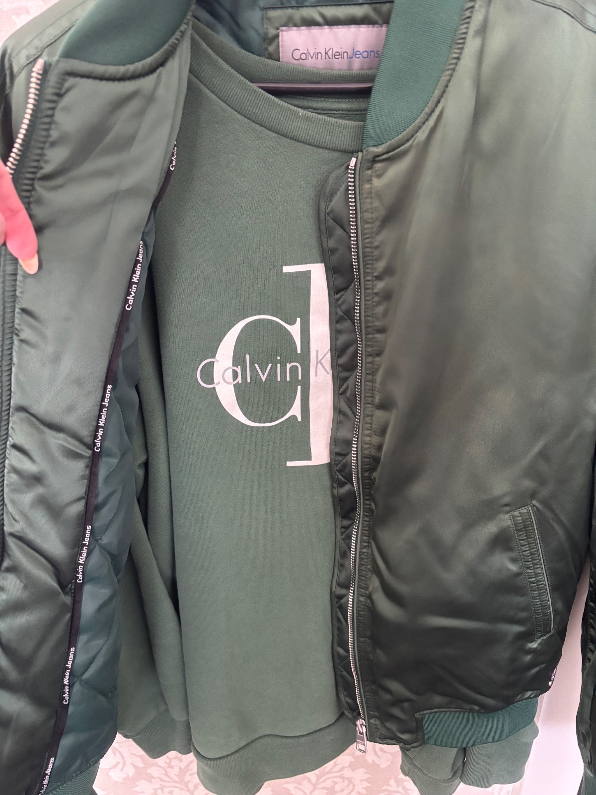 Predám bundu + mikinu Calvin Klein.Predavam spolu za zlomok pôvodnej ceny,nakoľko na bunde sú fľaky- sú vidno na foto ,iné žiadne sú tam už neni .Netusim od čoho sú ,lebo bunda bola tak 2-3 krát oblečená .Neskusala som ich však čistiť .Mikina bez poskodenia ,minimálne oblečená .