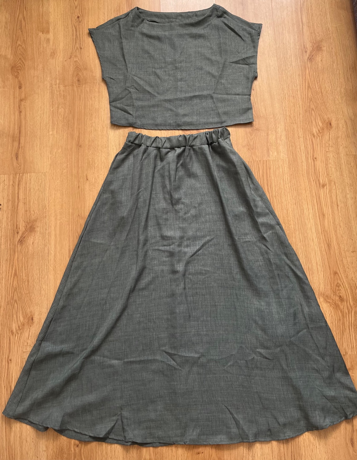 Suprava uplne nova, len odskusana, nevhodny darcek. Na mna top moc kratky, ked dam hore ruky odkryje brucho. Premerane vid foto. V pripade zaujmu premeriam viac, sukňa má dve vrecká, prijemný materiál. Na stránkach uvádzajú farbu ako vojensku zelenú. Predám aj s poštou za 10€.