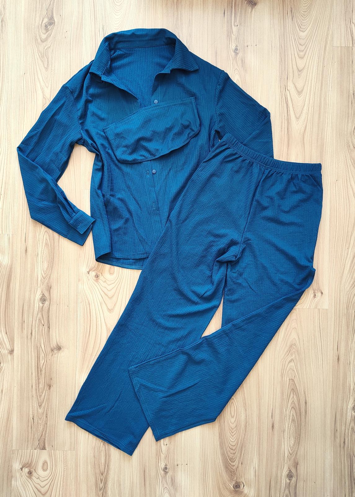 Krásna, voľnočasová súprava v tyrkysovo zelenej farbe. Skladá sa z bandeau topu, voľnej košeľe a širokých nohavíc, v páse na gumu. Dajú sa vytvárať rôzne kombinácie. Veľkosť S, rozmery: