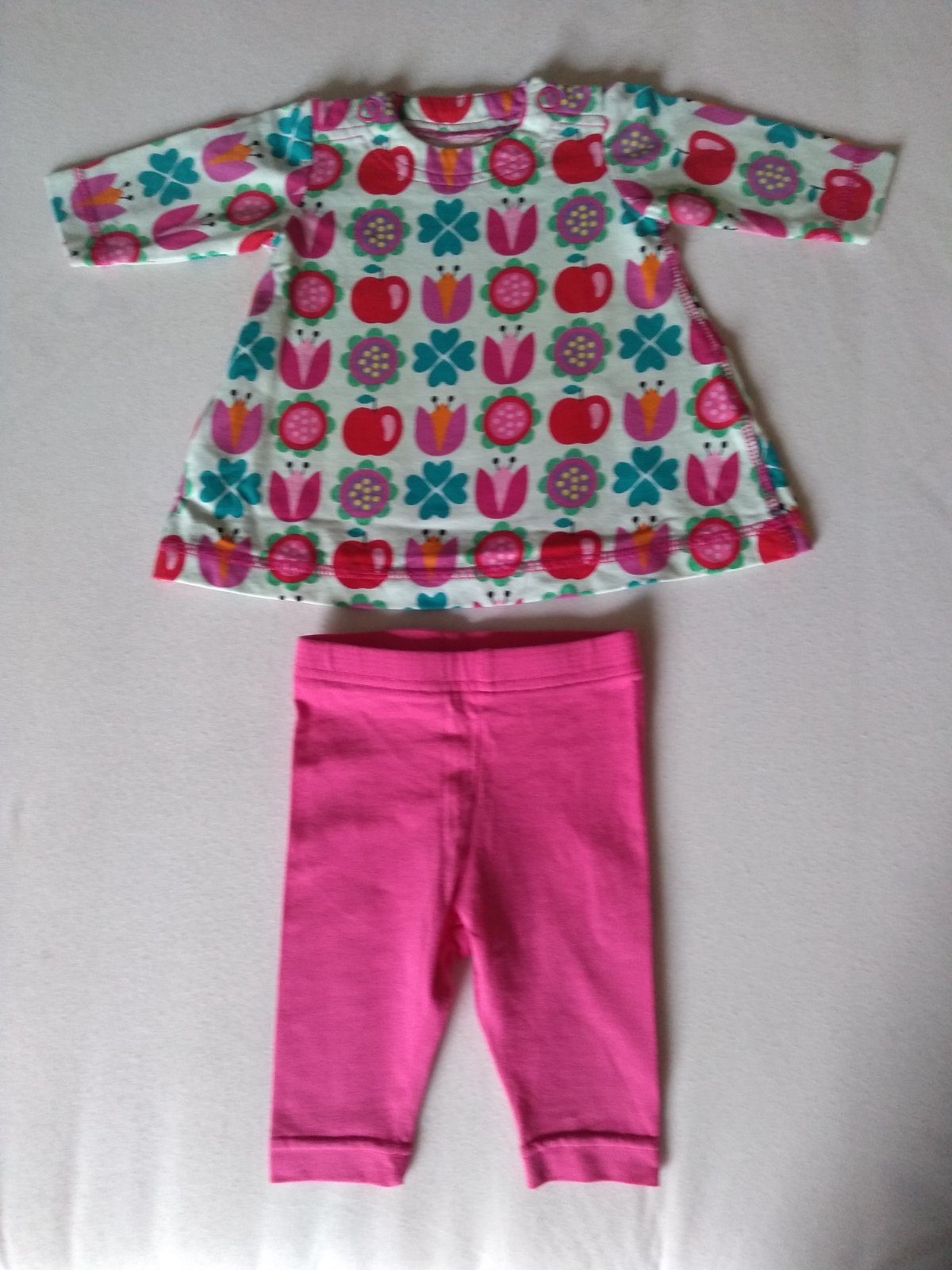 Predám súpravu,farba vrch jemne mentolková,strih do A.Pri krku z oboch strán cvoky.Šírka pazuchy 23 cm.Celková dĺžka 30 cm.Dĺžka rukáva od krku 22 cm.Legínky pás v kľude 2 krát 19 cm.Celková dĺžka 28 cm.Dĺžka od rozkroku 13,5 cm.Výborný stav, legíny nenosené.Cena 10€ plus poštovné.