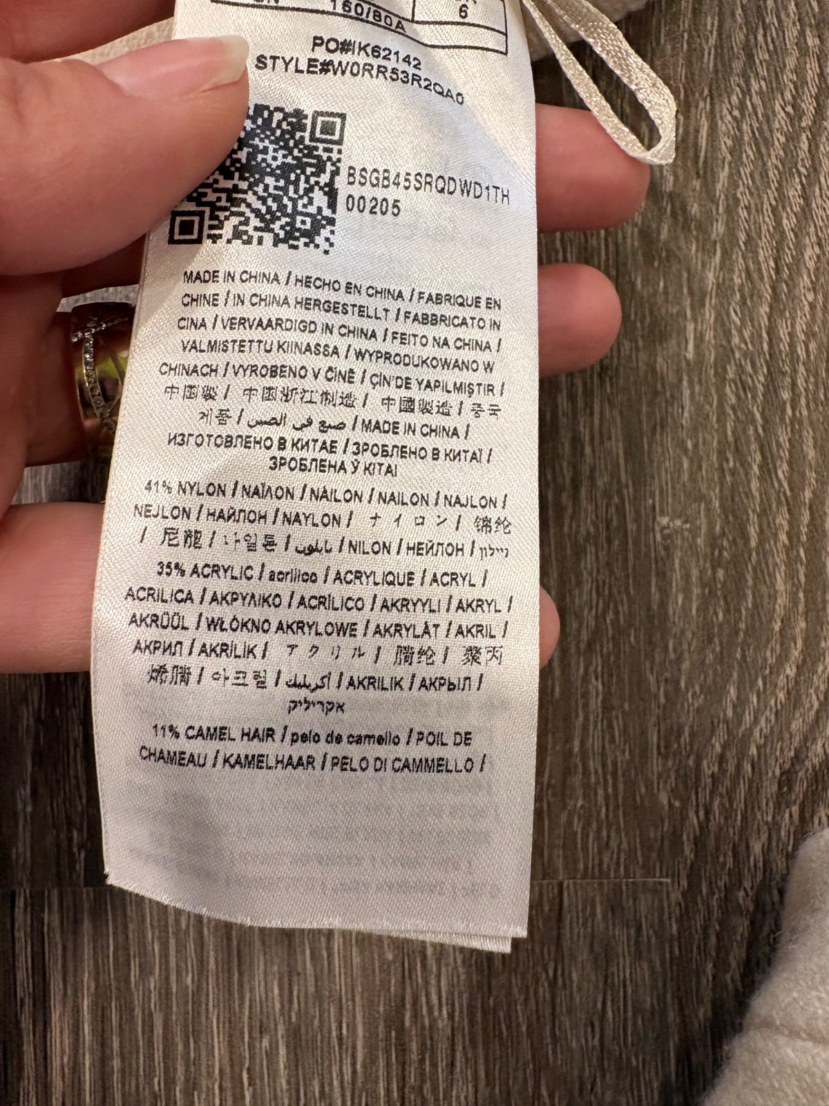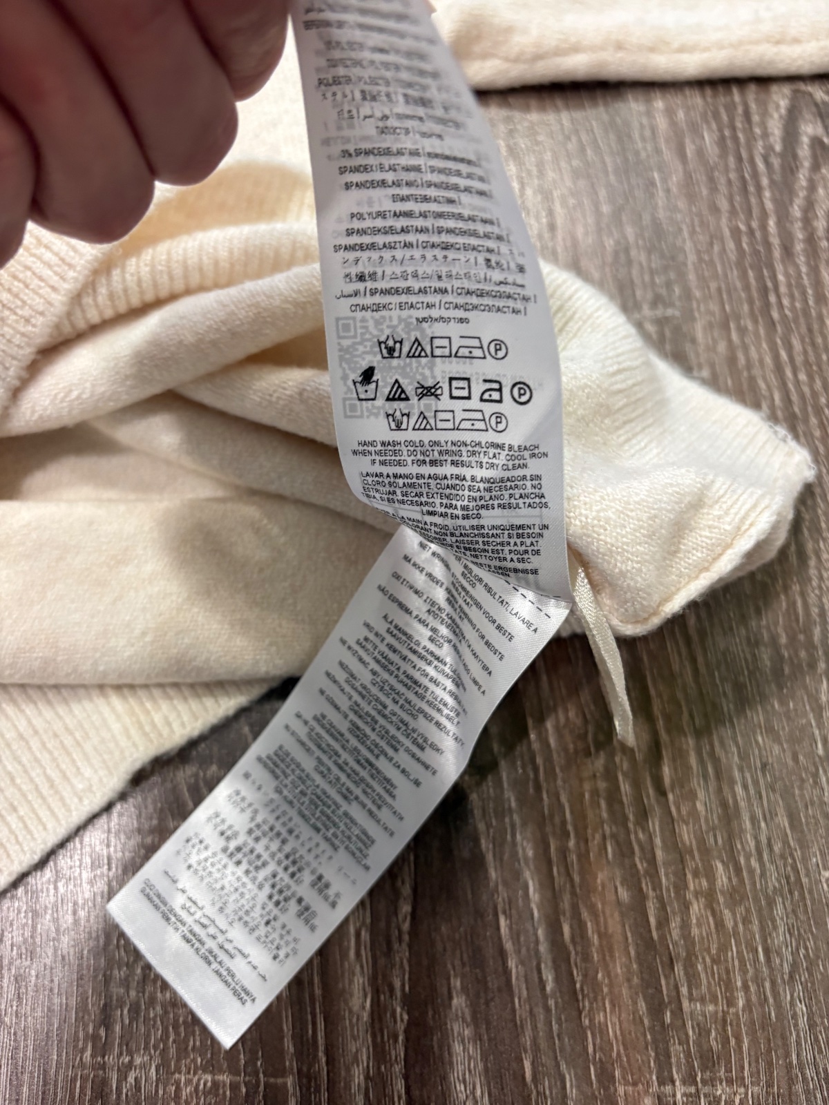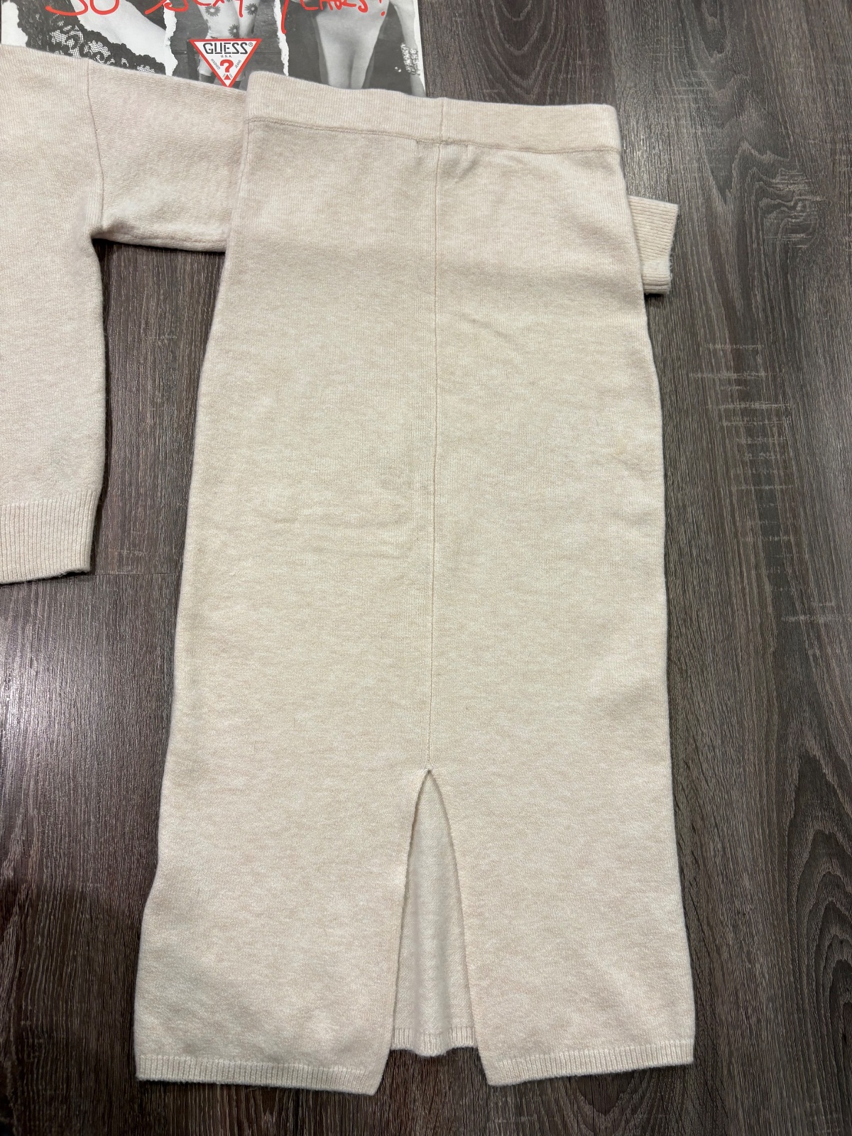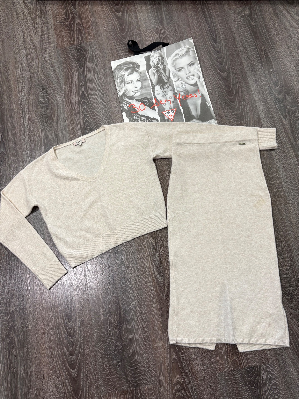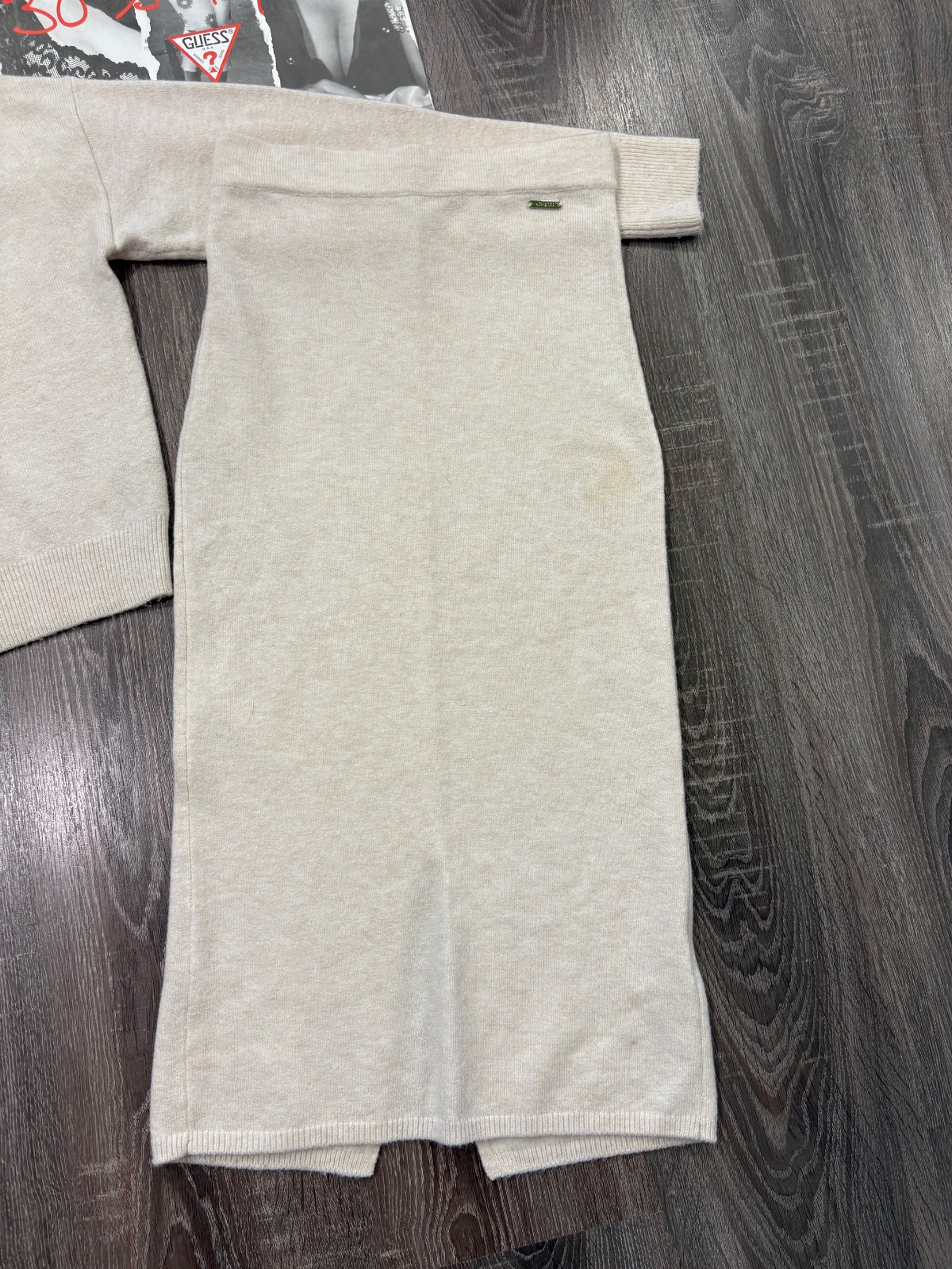 20.Guess krasny damsky svetlobéžový kompletík,velkost S.Svetrik je dlhy 49cm,dlzka rukava od krku je 68cm a sirka v podpazusi je od 50x2cm do 56x2cm.Prijemny teply,elasticky material.Sukna je velkost XS ale nosila som to spolu so svetrikom nakolko je elasticka a v pase na gumku.Dlzka je 75cm a sirka v pase je od 33x2cm do 50x2cm