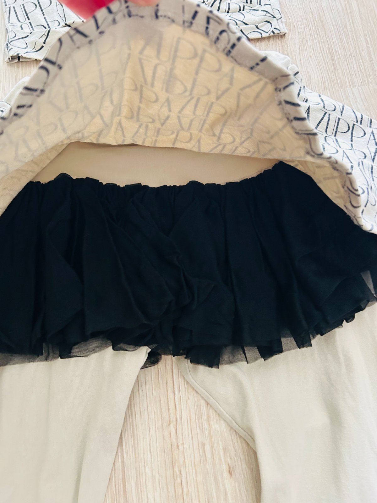 Sukňolegíny sú vo veľkosti 134/140, celková dĺžka: 80cm. Je to praktický kúsok, ktorý spája legíny a sukňu v jednom. Sukňová časť je z jemného čierneho tylu spolu s kruhovou sukničkou a logom ZUPPA. Zloženie: 92% bavlna, 8% elastan, tylová časť: 100% polyester.