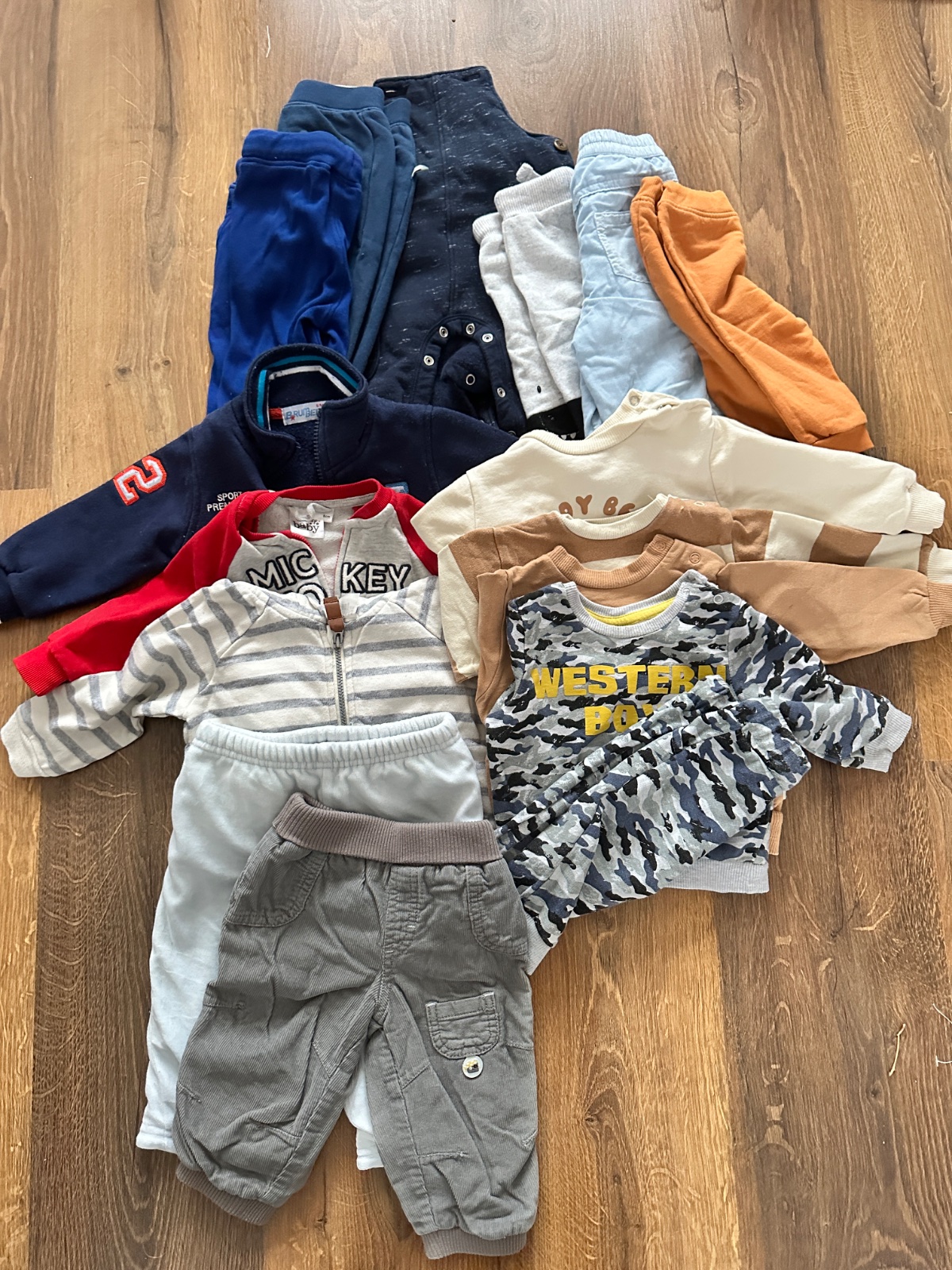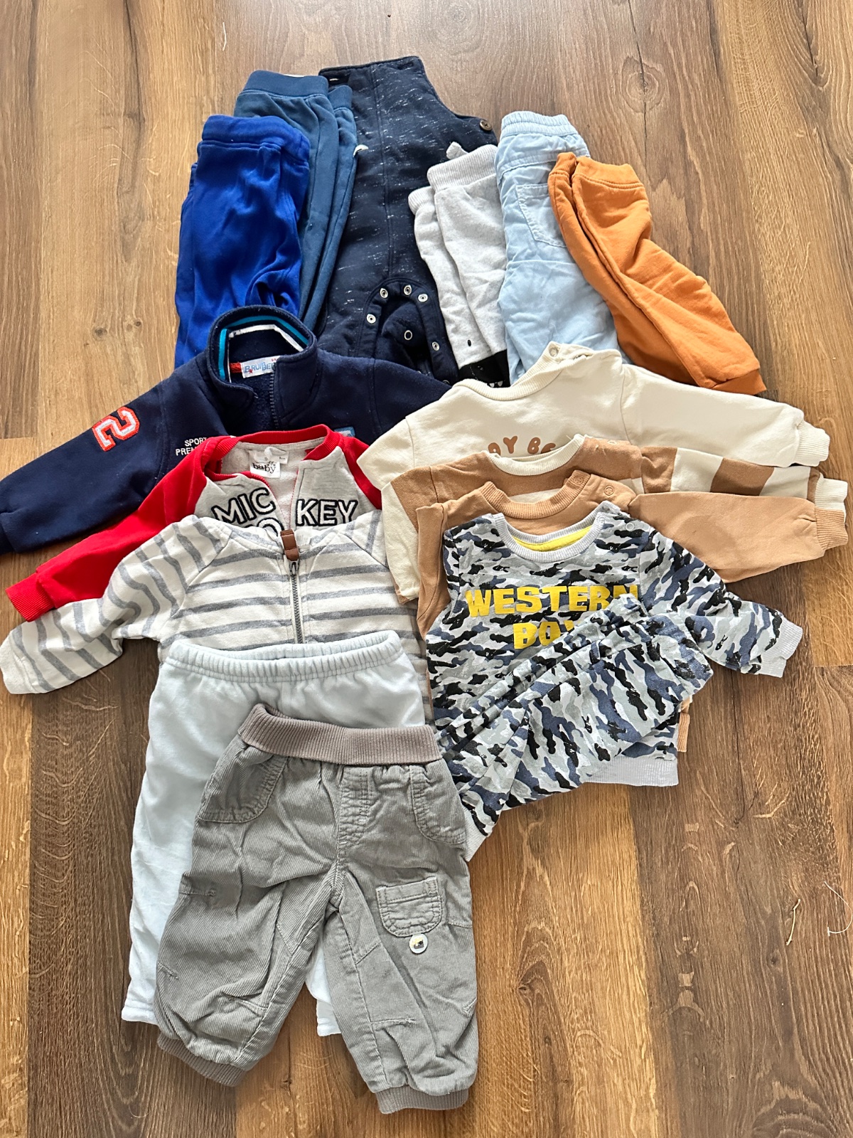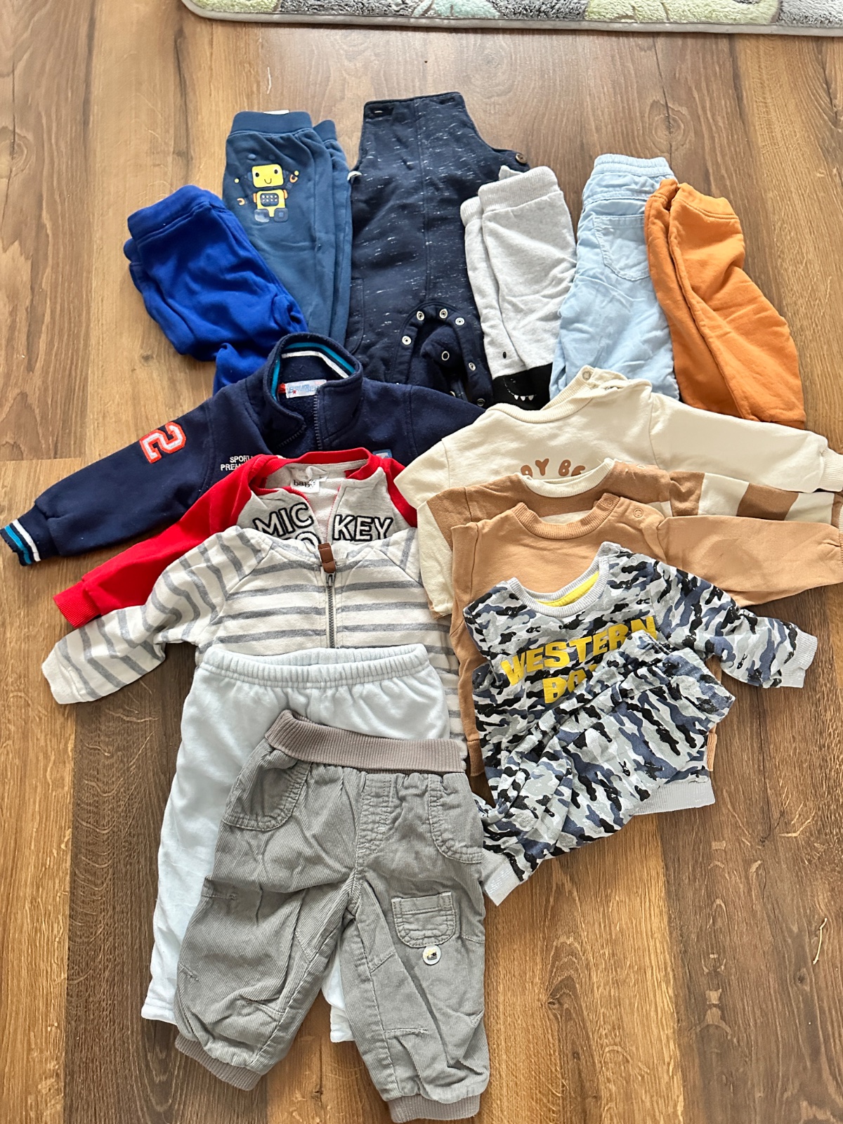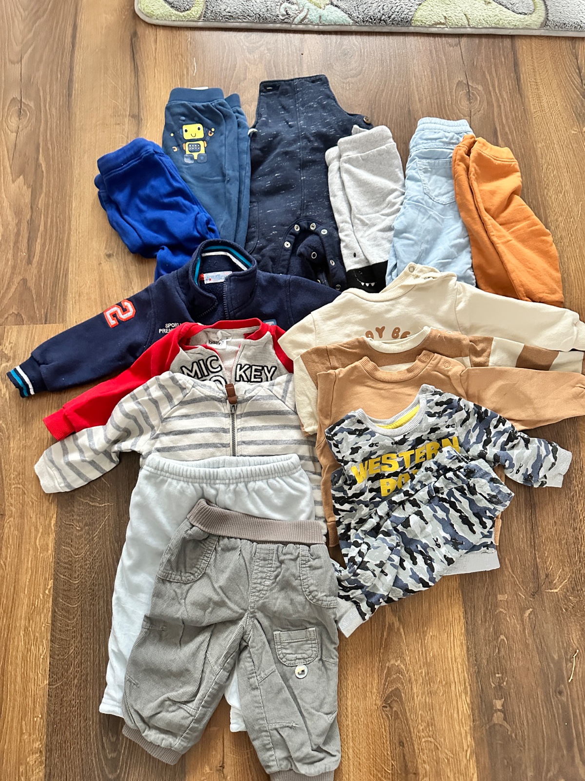 Balík oblečenia pre chlapca, veľkosť 62-68. Balenie obsahuje 3 svetre na zips, 4 pulóvre, 1 montérky a 8 nohavíc. Ideálne na chladnejšie dni
