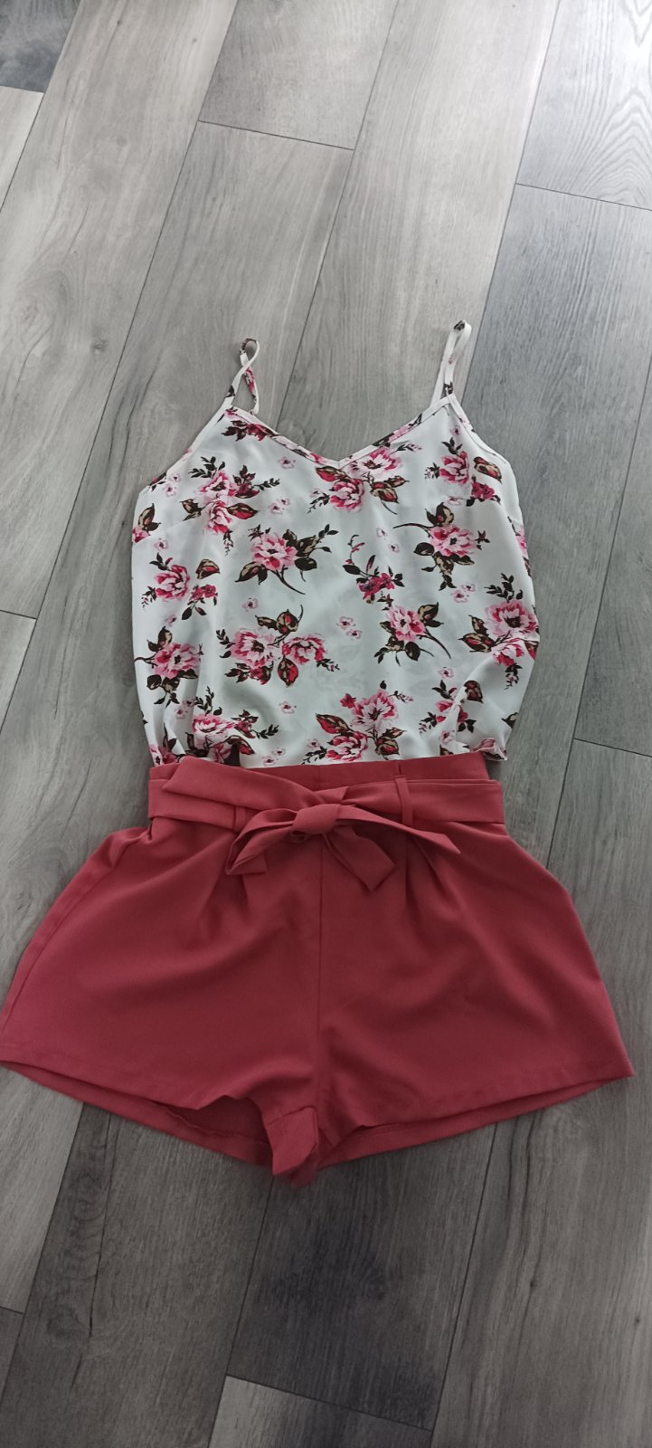 Kvalitný letný komplet, v športovo-elegantnom štýle, v peknom ružovom odtieni, materiál - kvalitná 100% bavlna - balónovina. Nosený, v perfektnom stave. Blúza je bez rukávov, s golierom, zapínanie ...