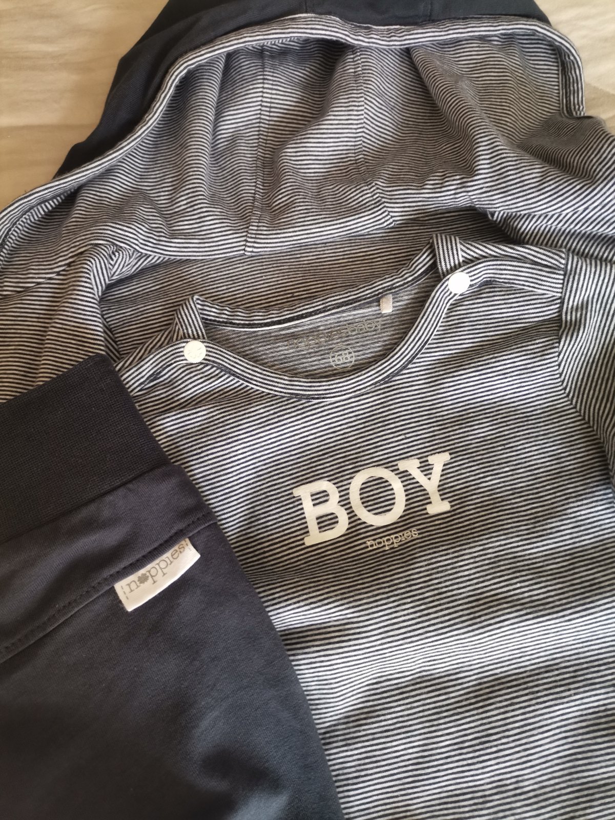 Veľmi pekná súprava, málinko nosená. Ako nová, kvalitný elasticky materiál. Nohavice slim, ako legíny. Bundička obojstranná, tricko s nápisom Boy.