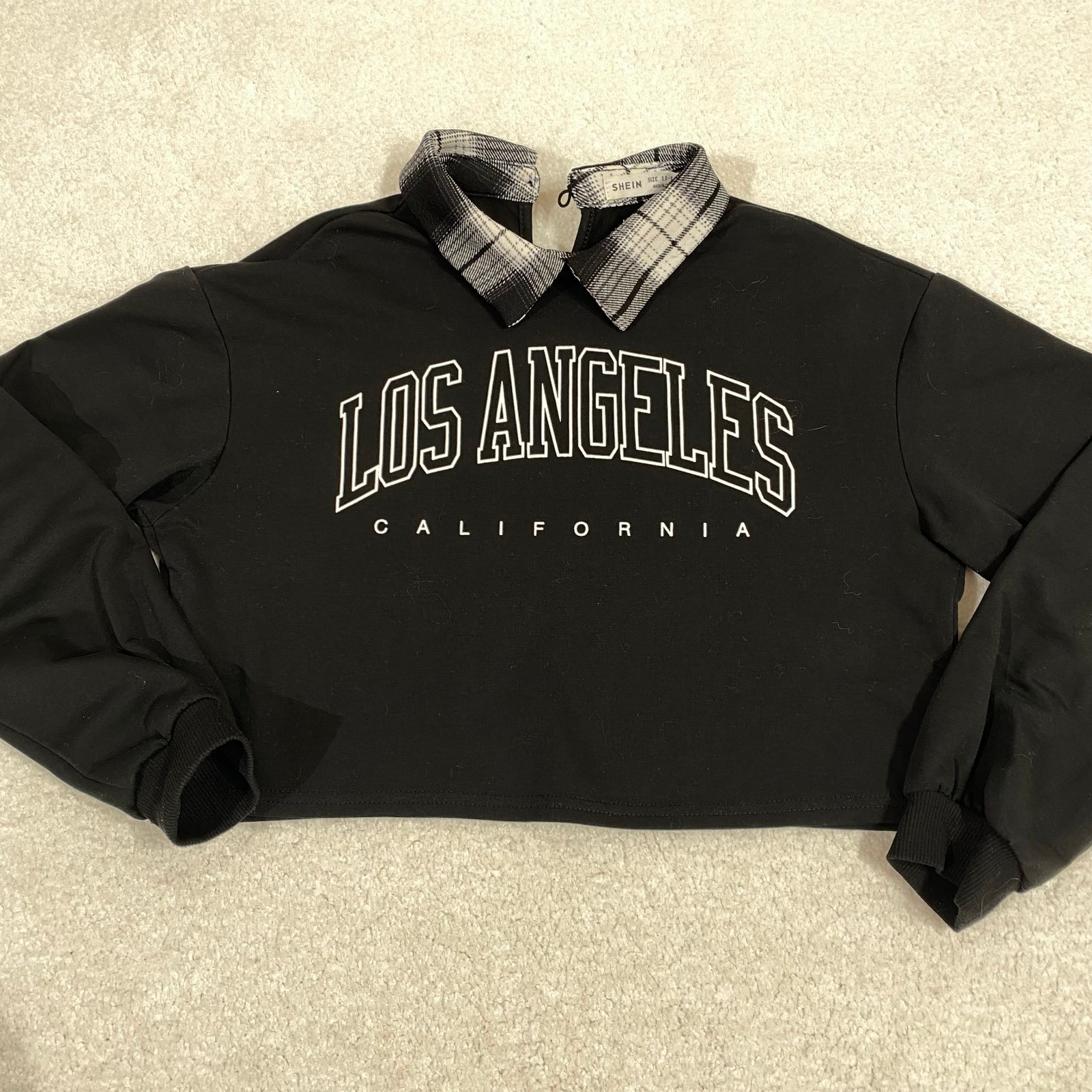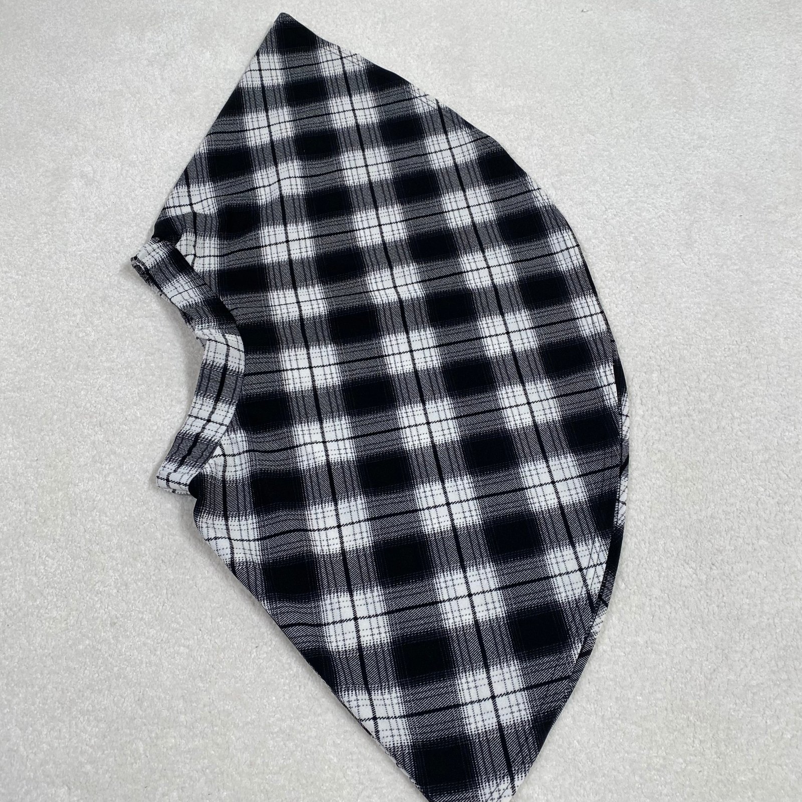 Komplet - Čierny crop top s nápisom a límcom, zapínanie vzadu na gombík. Dĺžka je 39cm, šírka je 46cm, dĺžka rukáva 48cm. Károvaná zvonová suknička, pás na gumu 30-35cm. V dobrom stave.