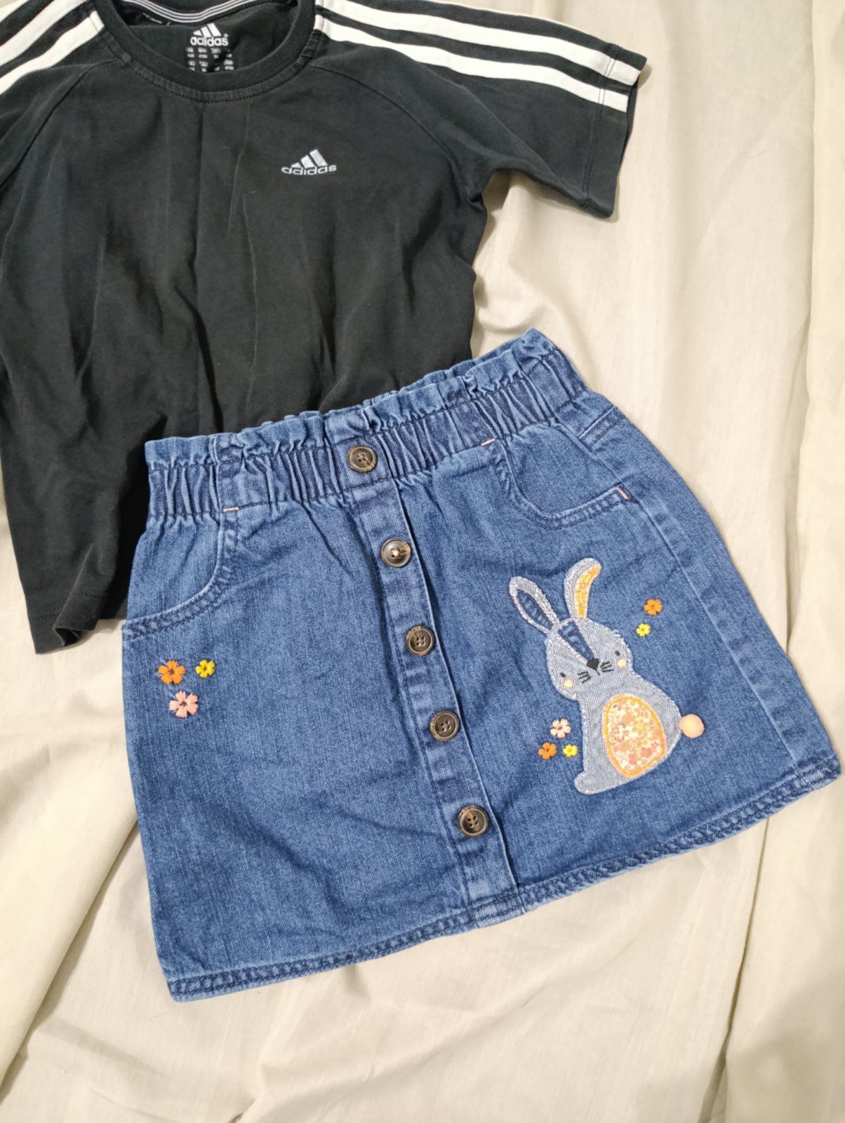 Krásna “tenisová” súprava Adidas- tričko a sukňokraťasky vo velkosti 104/110, kraťasy top stav, tričko nevyblednuté, bez žmolkov, aplikácia nepoškodená. Malá bodka vidí foto.