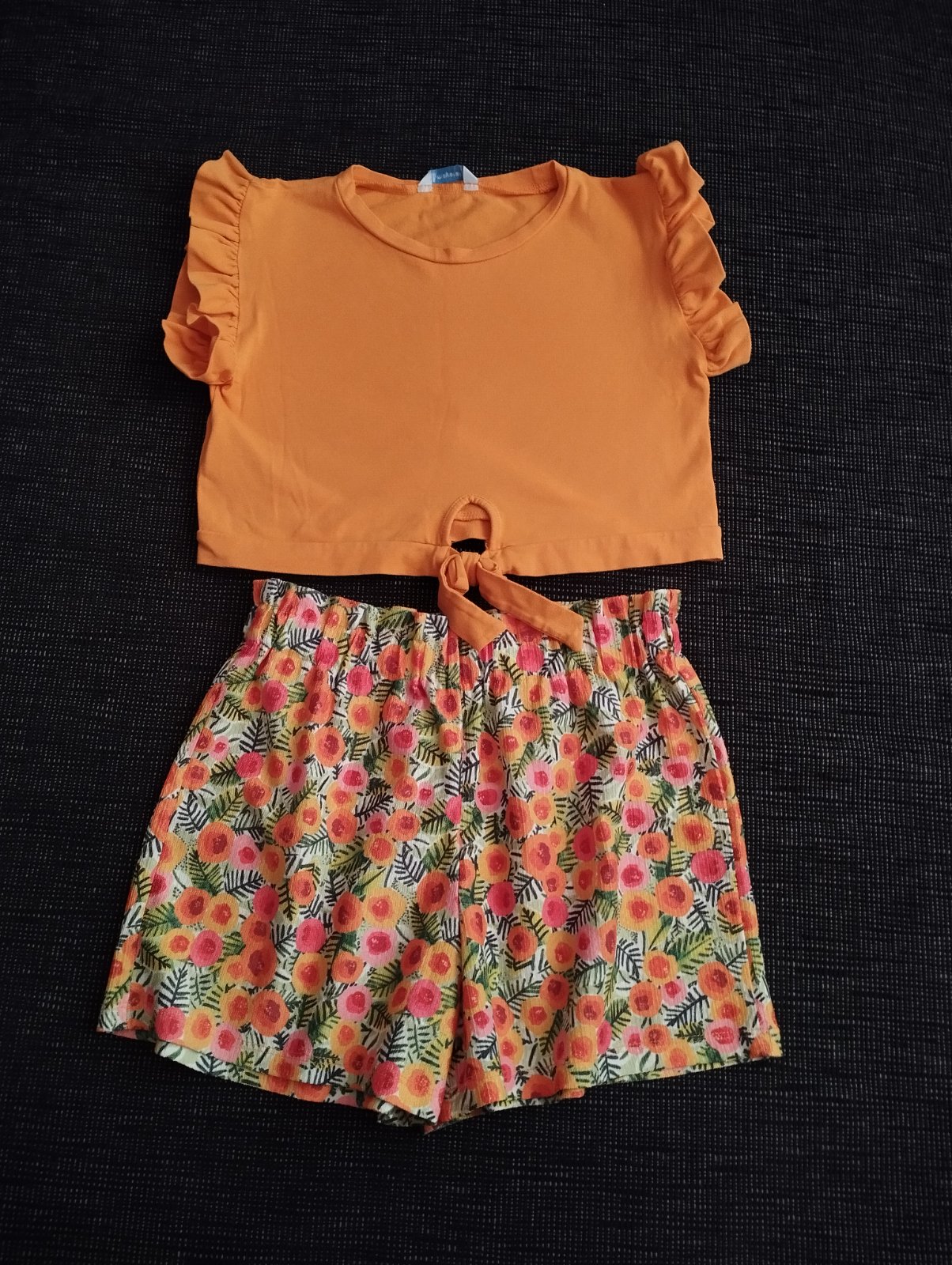 Dievčenské letná súprava oblečená max. 2x. TOP stav. Rozmery - viď foto. Na tričku 3D aplikácia. Nič nie je vyblednuté, len sa mi to nedá lepšie nafotiť : - )).