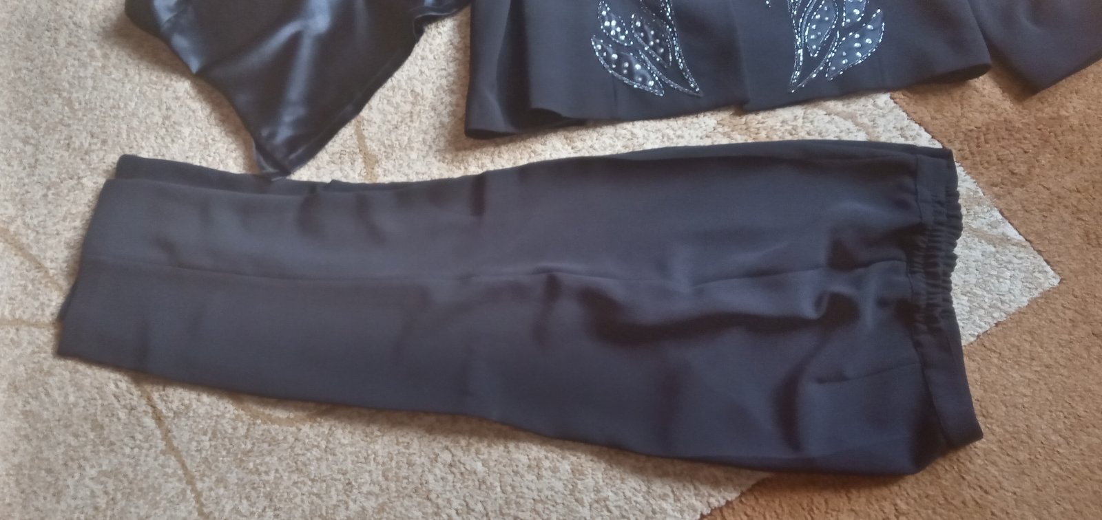 posuvam krasny kostym, ma 3ks, sukna sako a bluzka, je tmavomodrej farby.vpredu ma trblietavu ozdobu-vid foto, velkost odhadujem na xl, alebo 46 riadte sa rozmermy, sako -dlzka 68cm, ramena 43cm rukav 62 sirkap.p.56cm, bluzka- dlzka 62cm,sirkap.p.56cm nohavice-zapinanie na gombik aj zips a vzadu je gumickova cast, pas ma 2x45-49cm, dlzka je 103cm