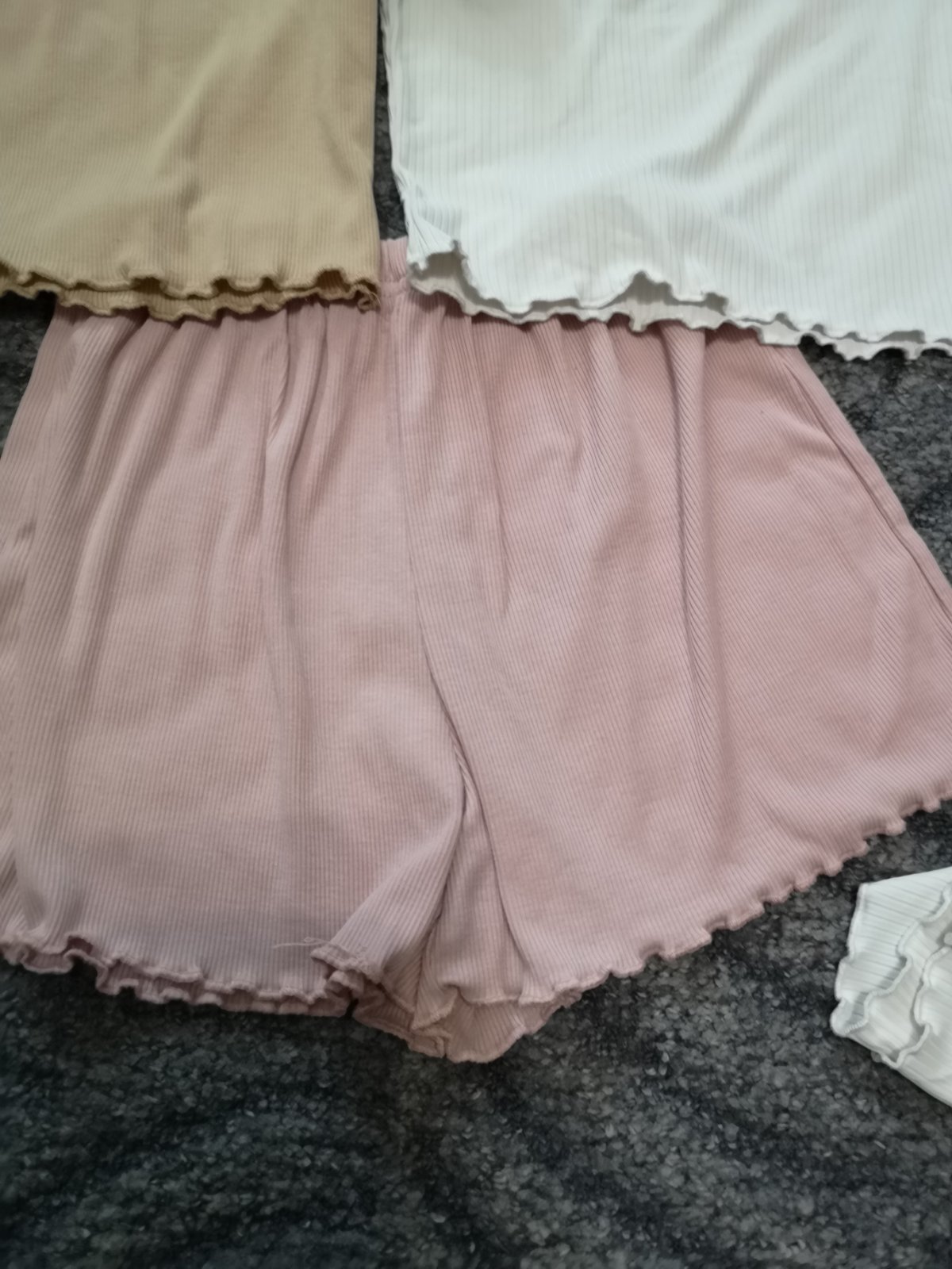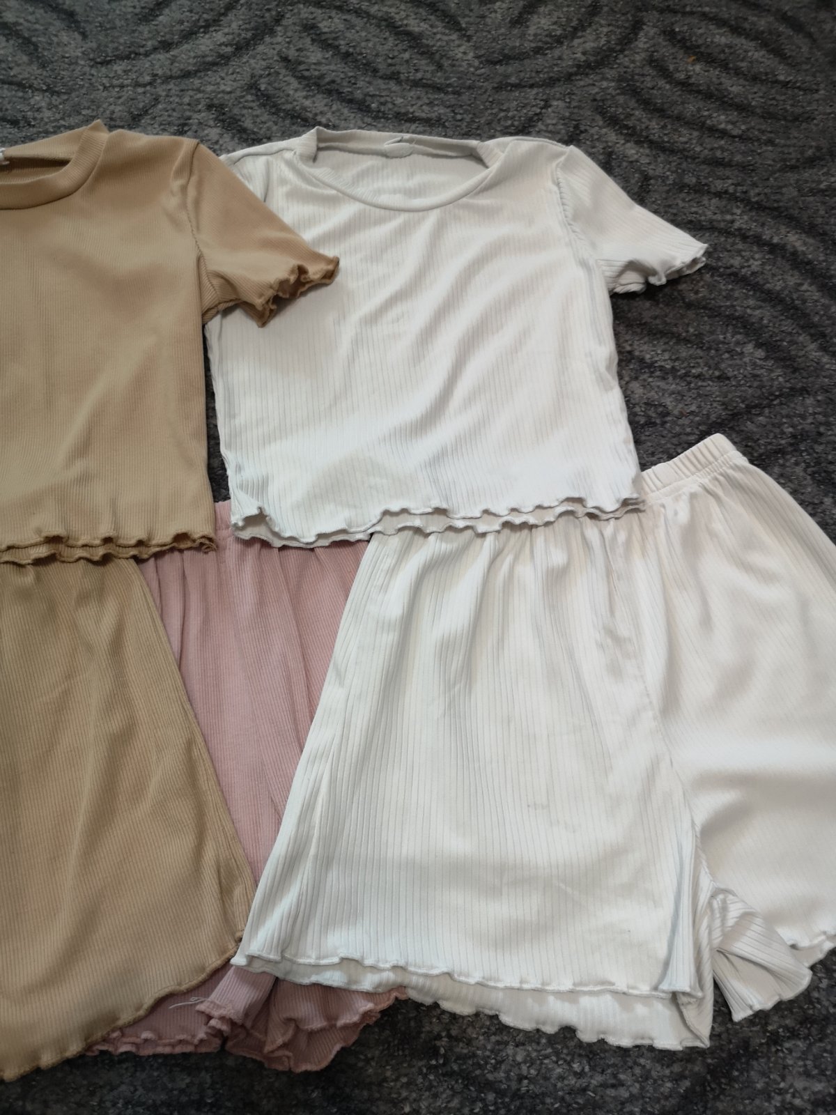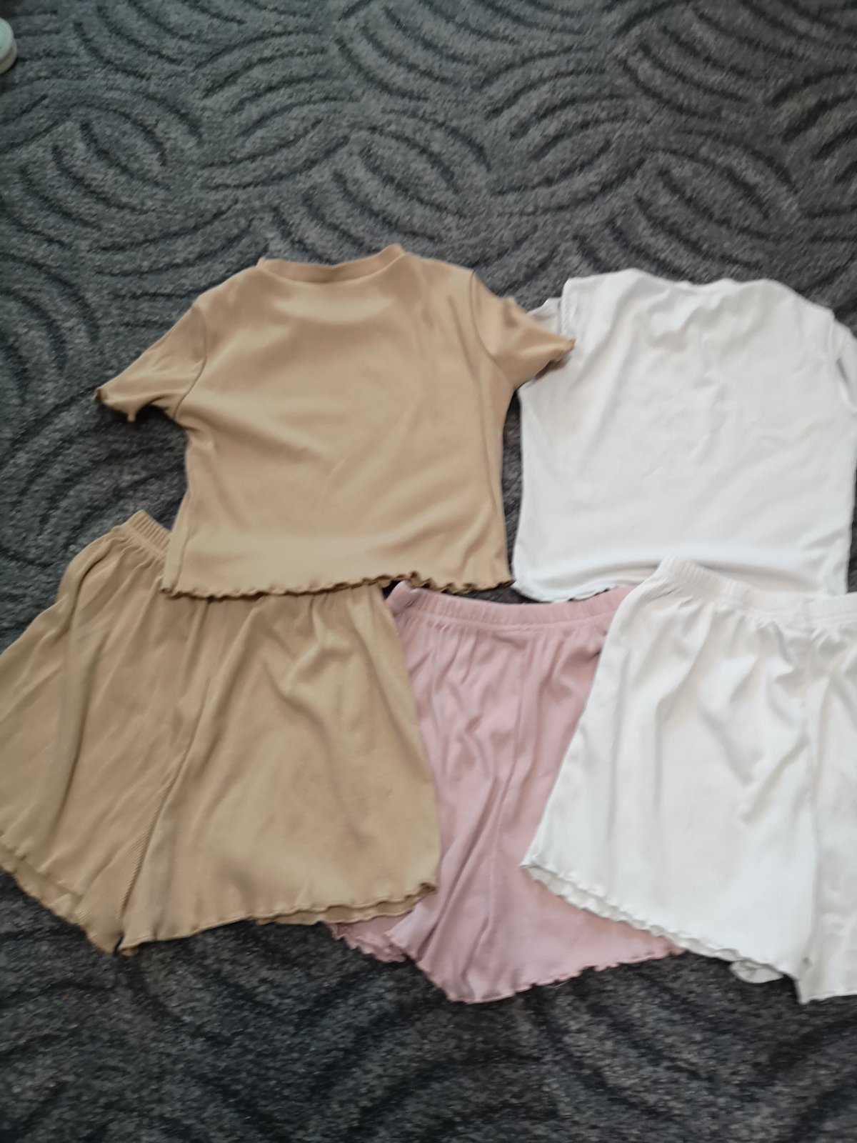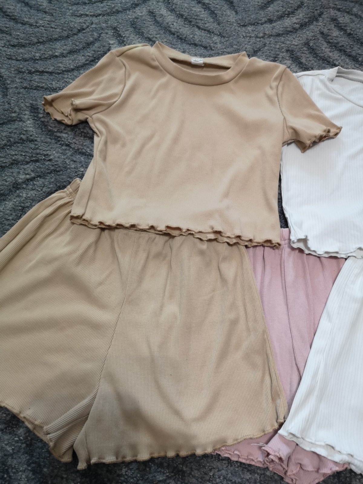 V dobrom stave, príjemný materiál, boli naše obľúbené čiže sa môže vyskytnúť dajaký nedostatok, ale stále pekné, kupované spolu ako set, žmolky nemajú, cena spolu za 3 kraťasy a 2 tričká