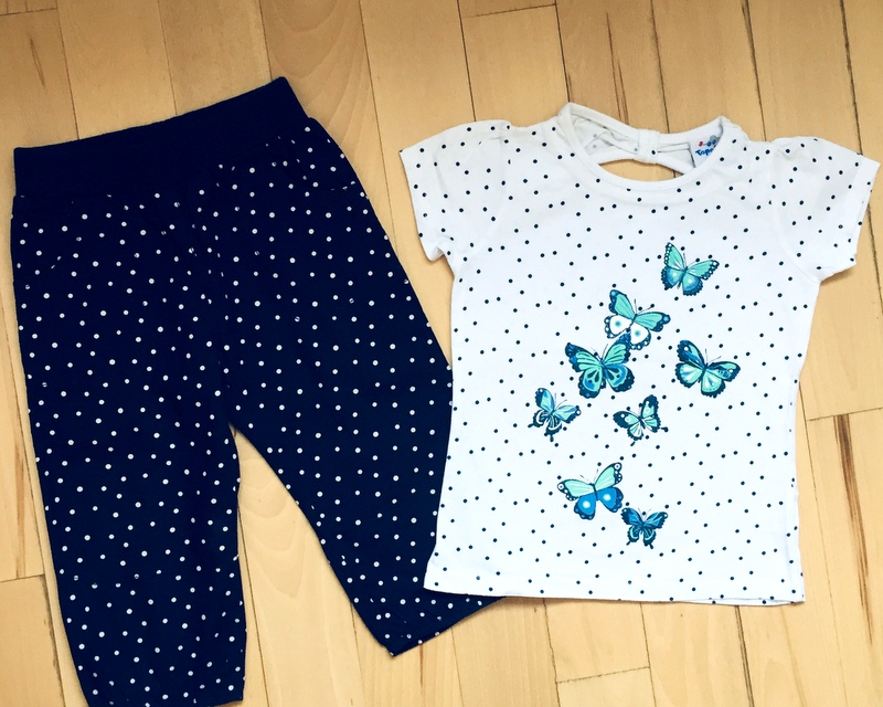 Bodkovaný kompletík vhodný pre dievčatko na 5-6 rôčkov. Kompletík modrých 3/4 nohavíc s bielymi bodkami a bieleho trička s modrými bodkami a motýlikmi, krásne to spolu ladí. Kompletík sme mali oblečený 1x, ako nový. Cena spolu.