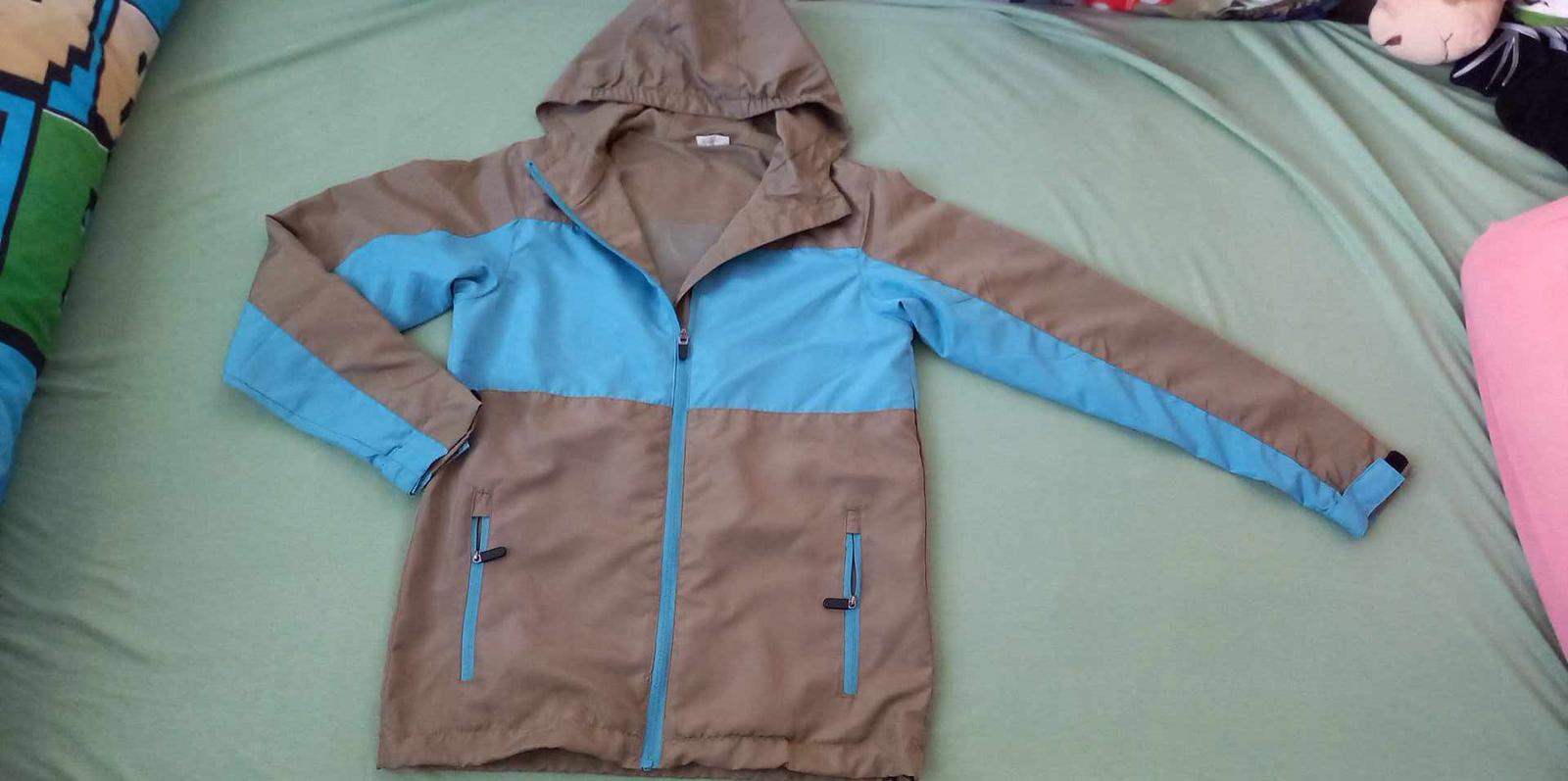 tenká vetrovka podšitá sieťkou, ,,Hip Hopps", veľkosť 146/152, rukáv 57 cm, pazuchy 2x 42 cm, dlžka vetrovky 61 cm, top stav + kaki športové nohavice ,,Hip&Hopps", dajú sa odopnúť zipsy a urobiť bermudy, veľkosť 146, v páse na bokoch guma, dlžka 89 cm, pás 2x 33 až 38 cm, top stav, cena spolu 15 €