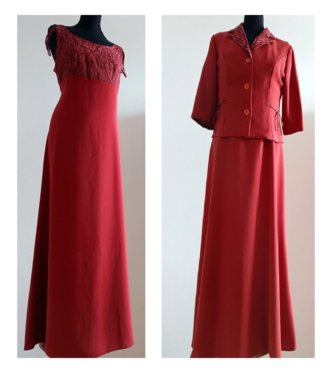 Kostým šaty+sako. Farba tehlovočervená. Šaty hruď 49, dĺžka 144, pás 43. Kabátik hruď 50, dĺžka 56.