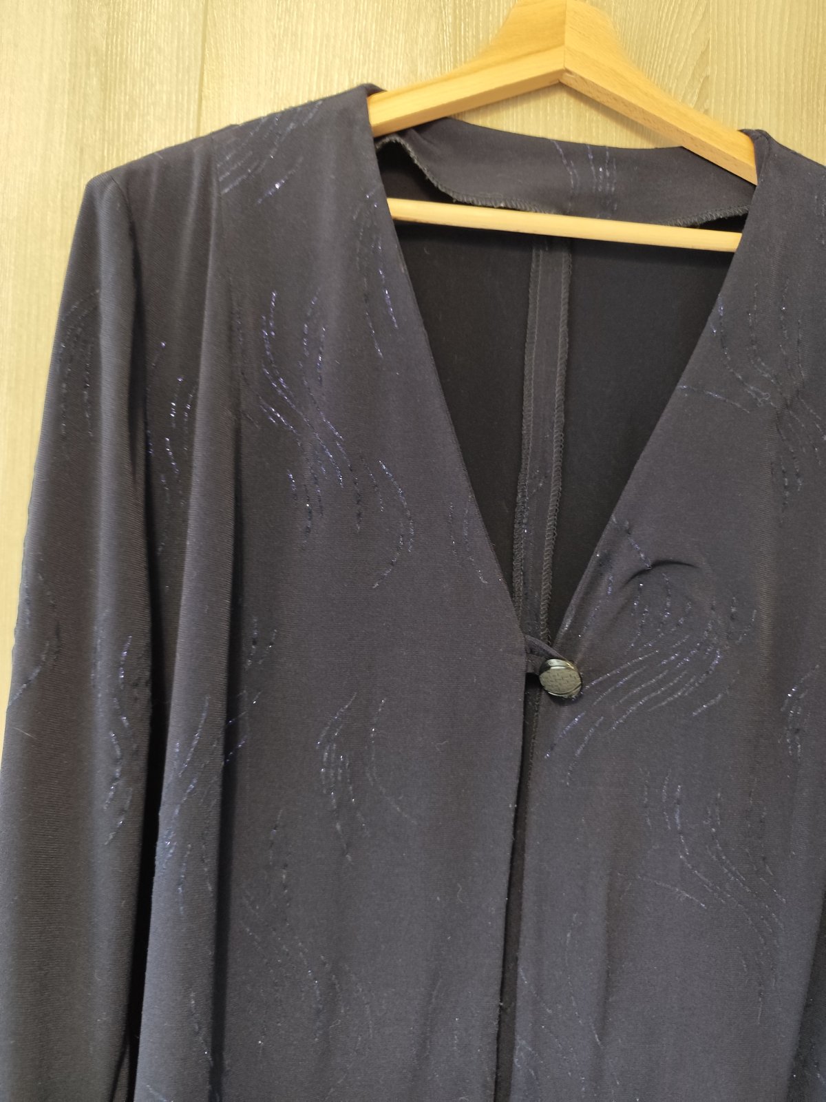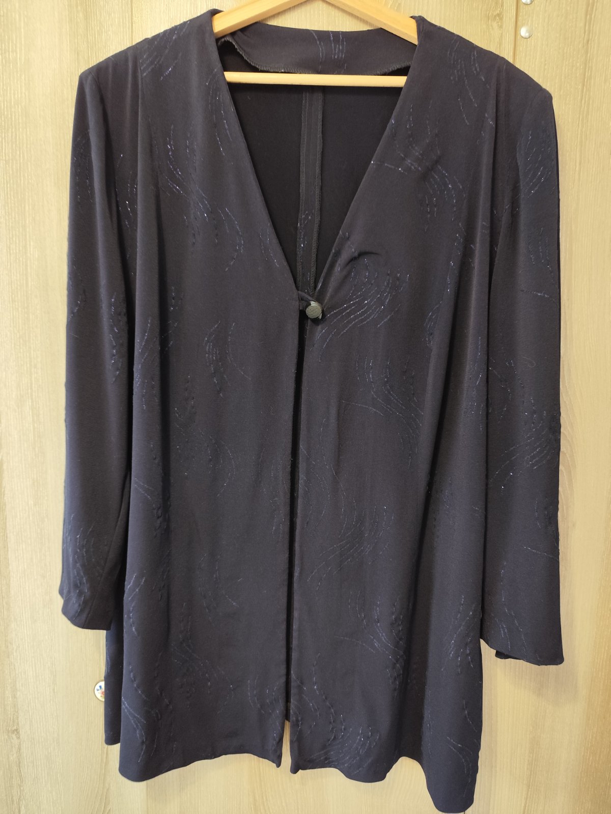 Min.niseny, pružný. Šírka sukne v páse 2 x 58, obvod bokov 2 x 76. Sako šírka v ramenách 49, v dĺžka 80
