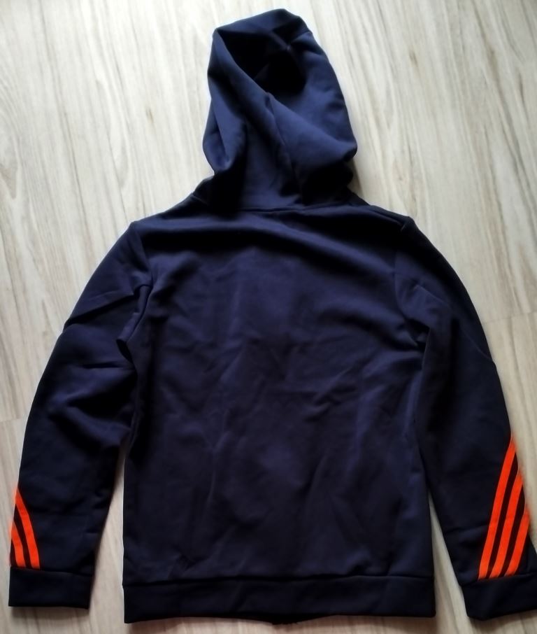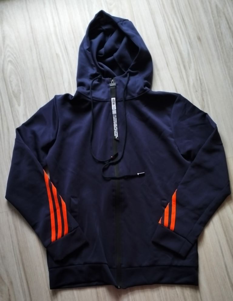 Súprava je tmavomodrá s oranžovými pásikmi.