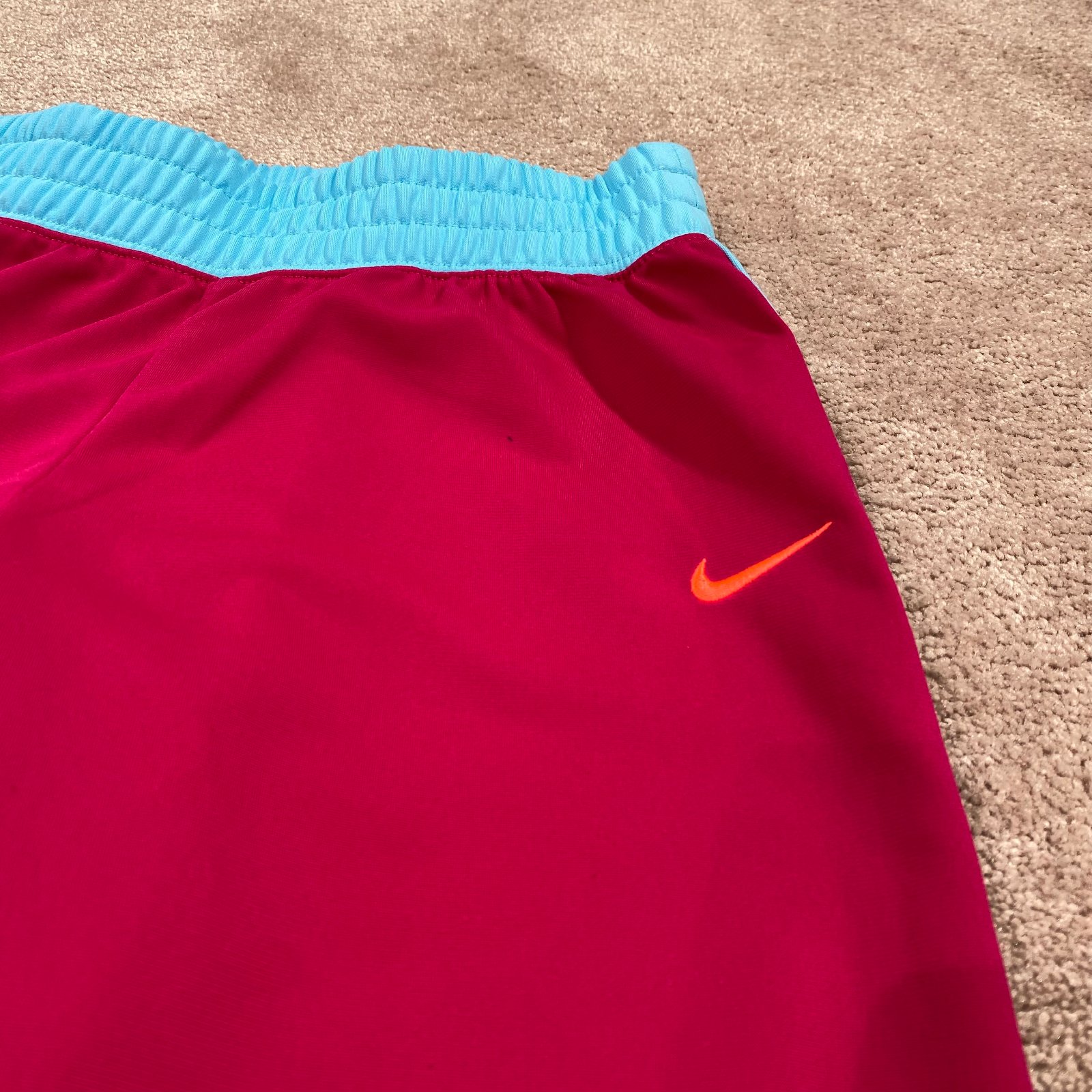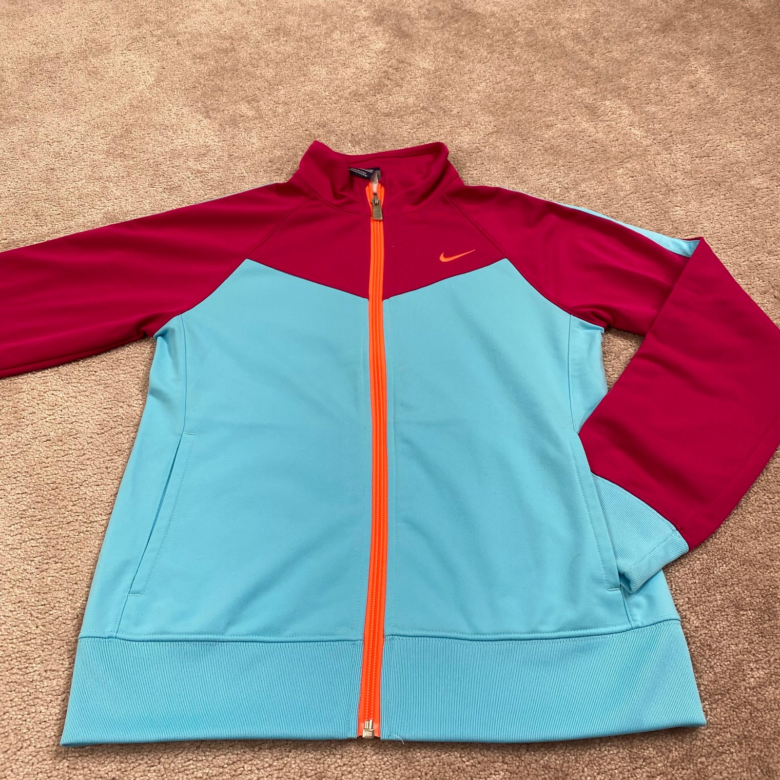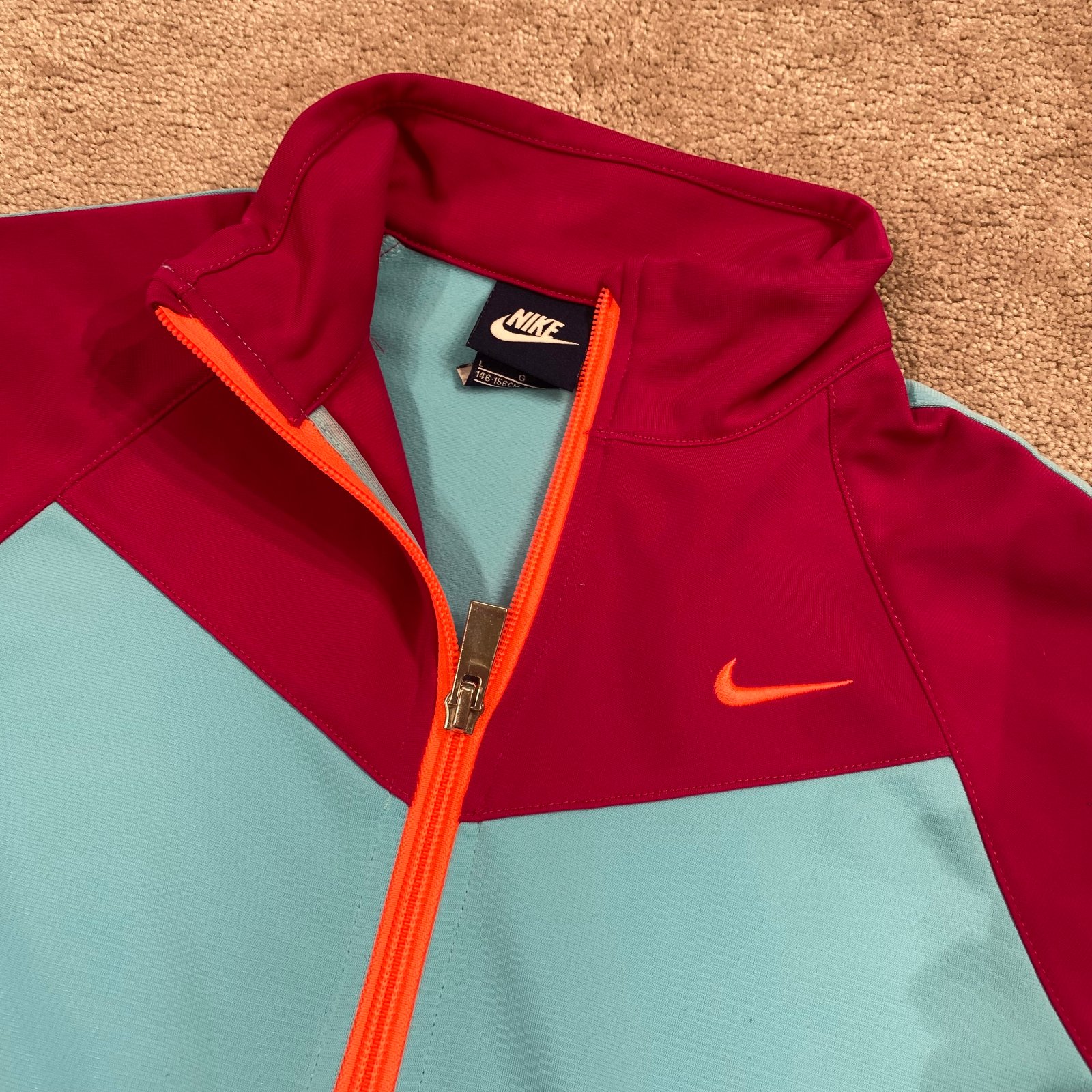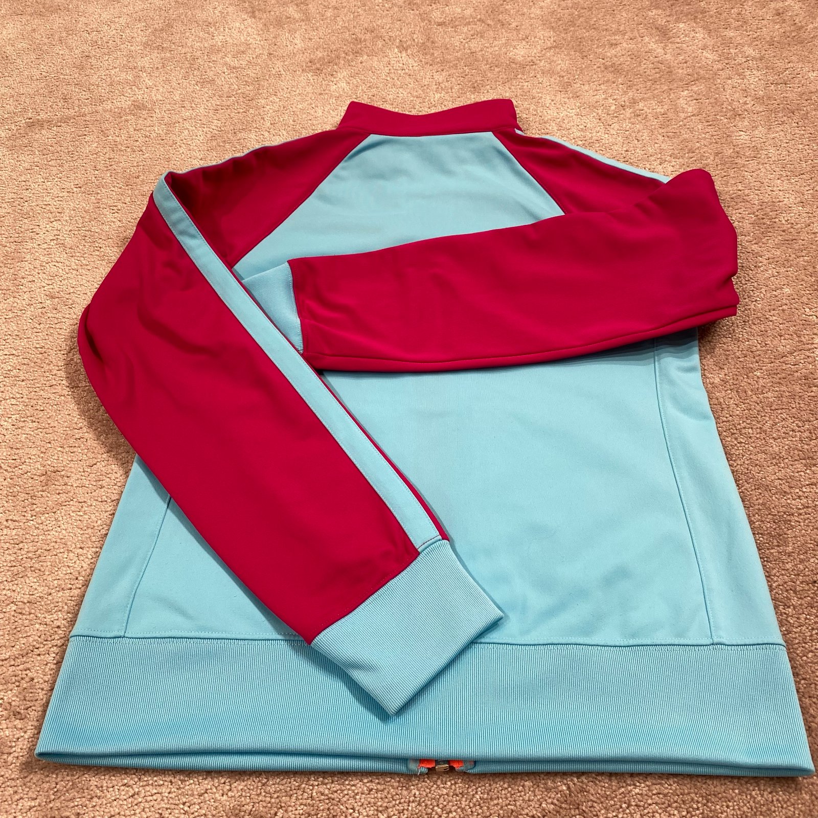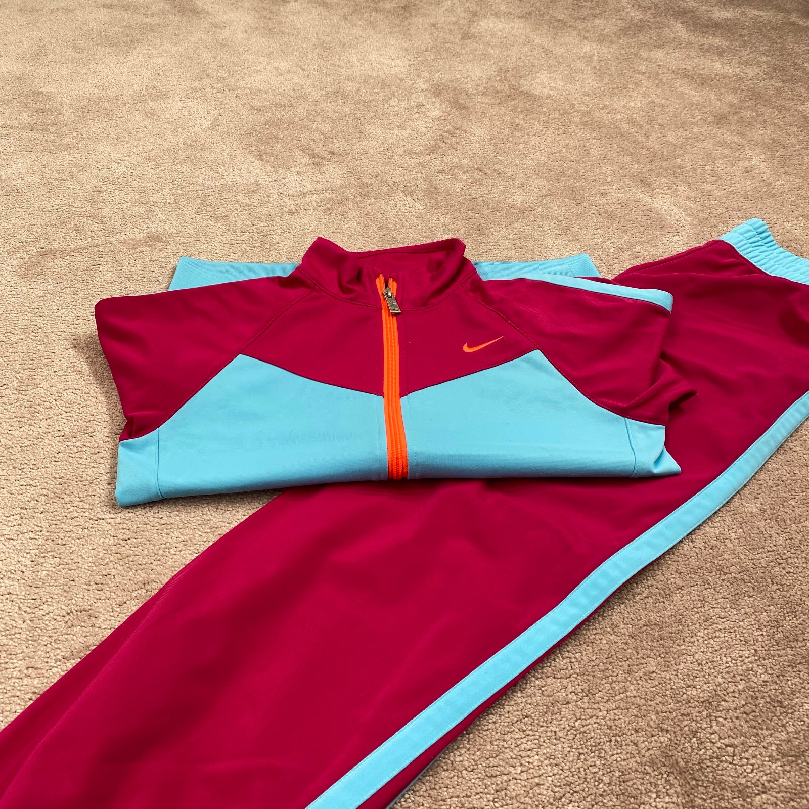 Cyklamenovo-tyrkysová športová súprava (100% polyester). Bunda na zips + bočné vrecká, dĺžka je 57 cm, šírka je 42cm, dĺžka rukáva od krku 67cm. Nohavice - pás aj spodok na gumu. Dĺžka je 90 cm, šírka pásu je 32cm. Veľkosť 146/152 v dobrom stave. Jediná chybička je na rukáve - viď foto - zľava už v cene