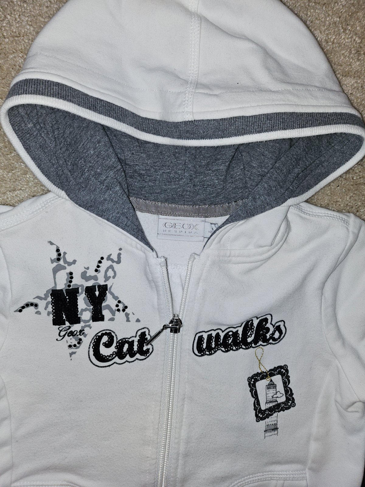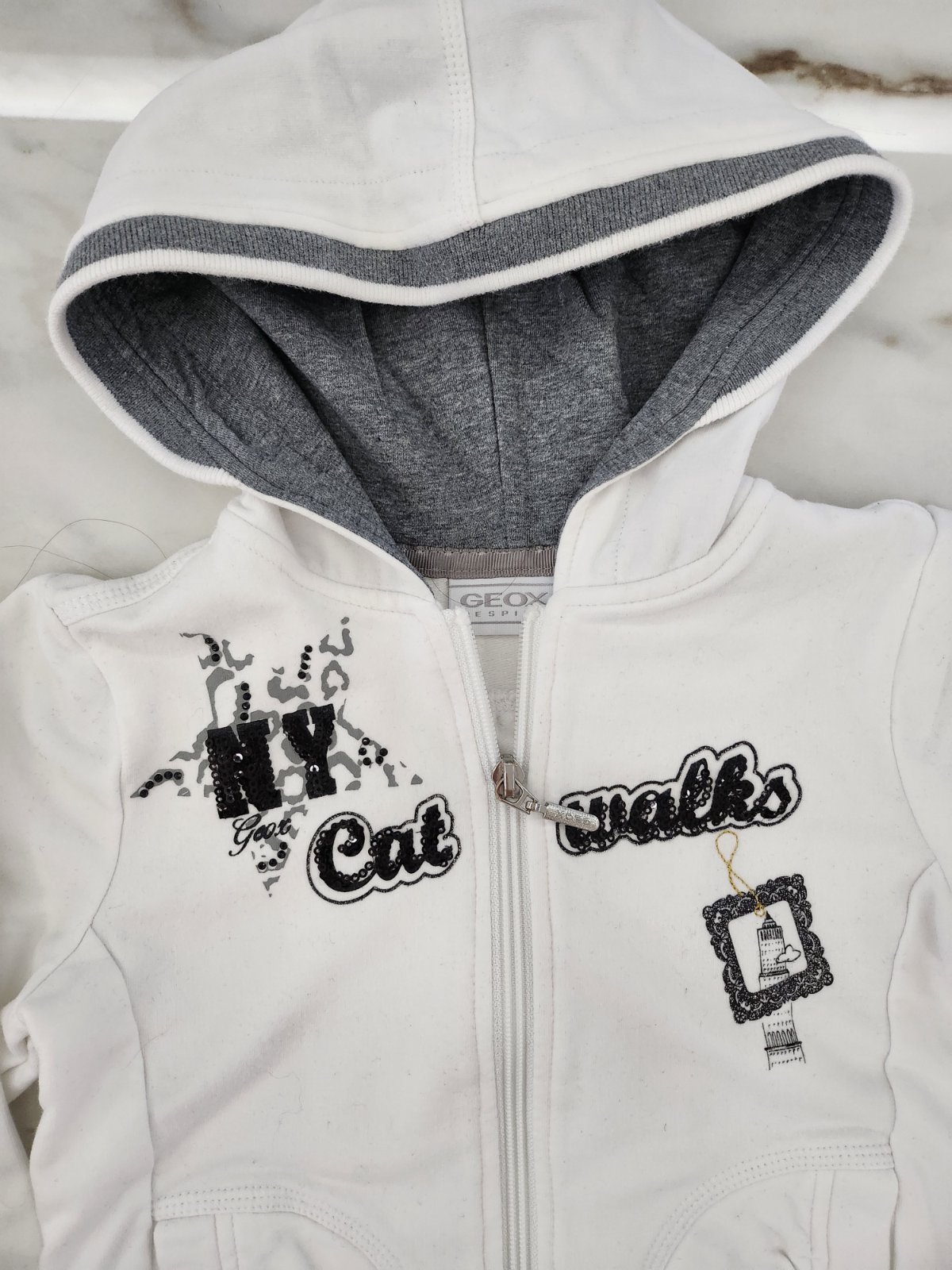 Tepláková súprava v dobrom nosením stave, veľkosť tak 98/104, mikina na zips s kapucňou a zozadu je predĺžená. Celková dĺžka mikiny spredu 37cm zo zadu 43,5cm, rukáv od ramena 35cm, obvod v páse 22...