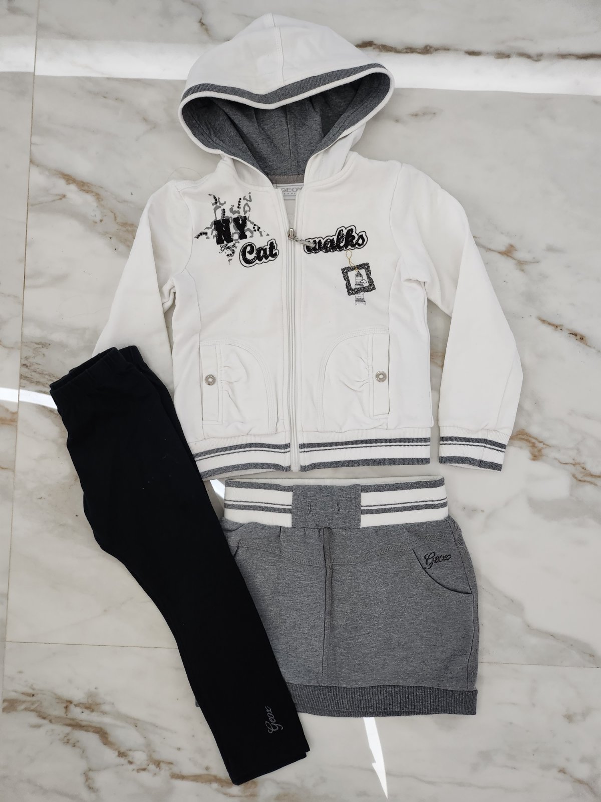 Biely set Benetton. Trucko 98, ale je vacsie skor 104, mikina 110. Dcera to nosila spolu. Je to rovnake dlzkou. Spolu 6e.