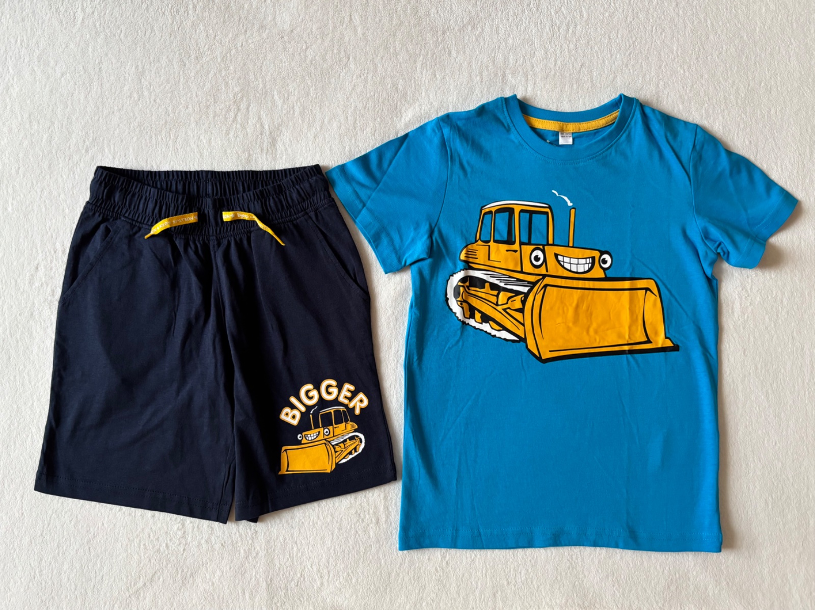 Tričko a košeľa vo výbornom, raz oblečenom stave. Veľkosť písaná 5 rokov, ale skôr zodpovedá veľkosti 116 až 122. Materiál je veľmi príjemná bavlna, set bol kúpený v zahraničí.