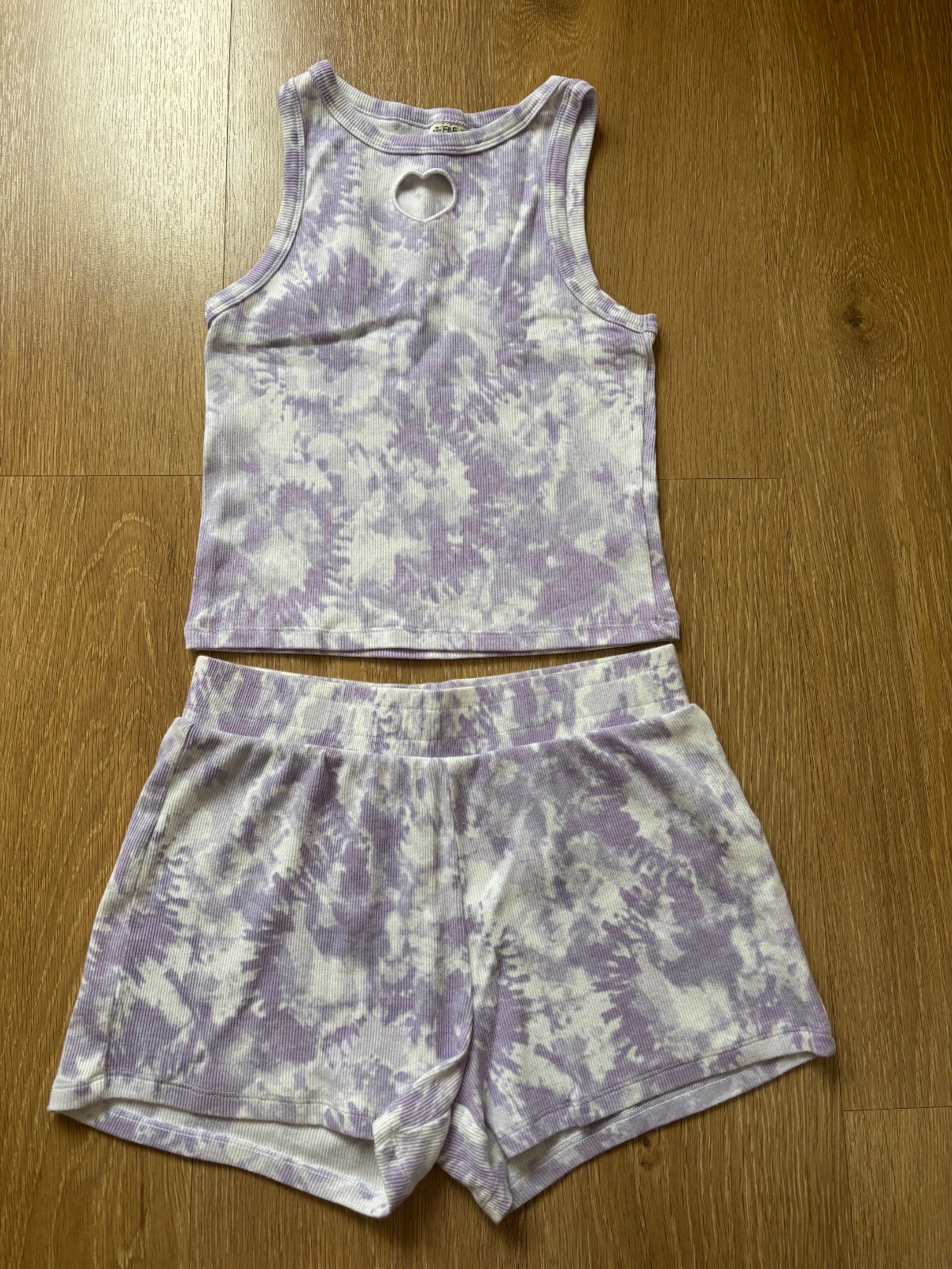 Predĺžené tričko s fialovou potlačou (nie žltou) a rozšírené nohavice bez patentu 95% bavlna 5% lykra rozmery dĺžka trička/dľzka nohavíc/pás 5-6- 44cm/62cm/29cm 7-8-49cm/70cm/28cm 9-10-52cm/81cm/...