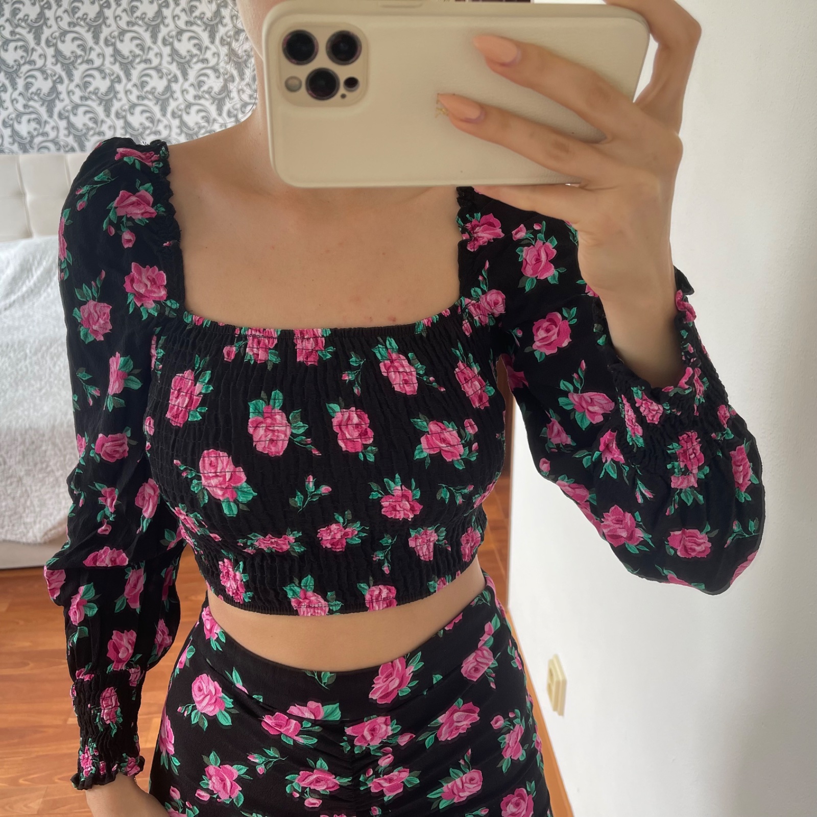 Predám krásny kvetinový crop top, veľkosť S a sukňu s výrezom, veľkosť M. Predávam spolu. Cena spolu 6 eur + pošta.