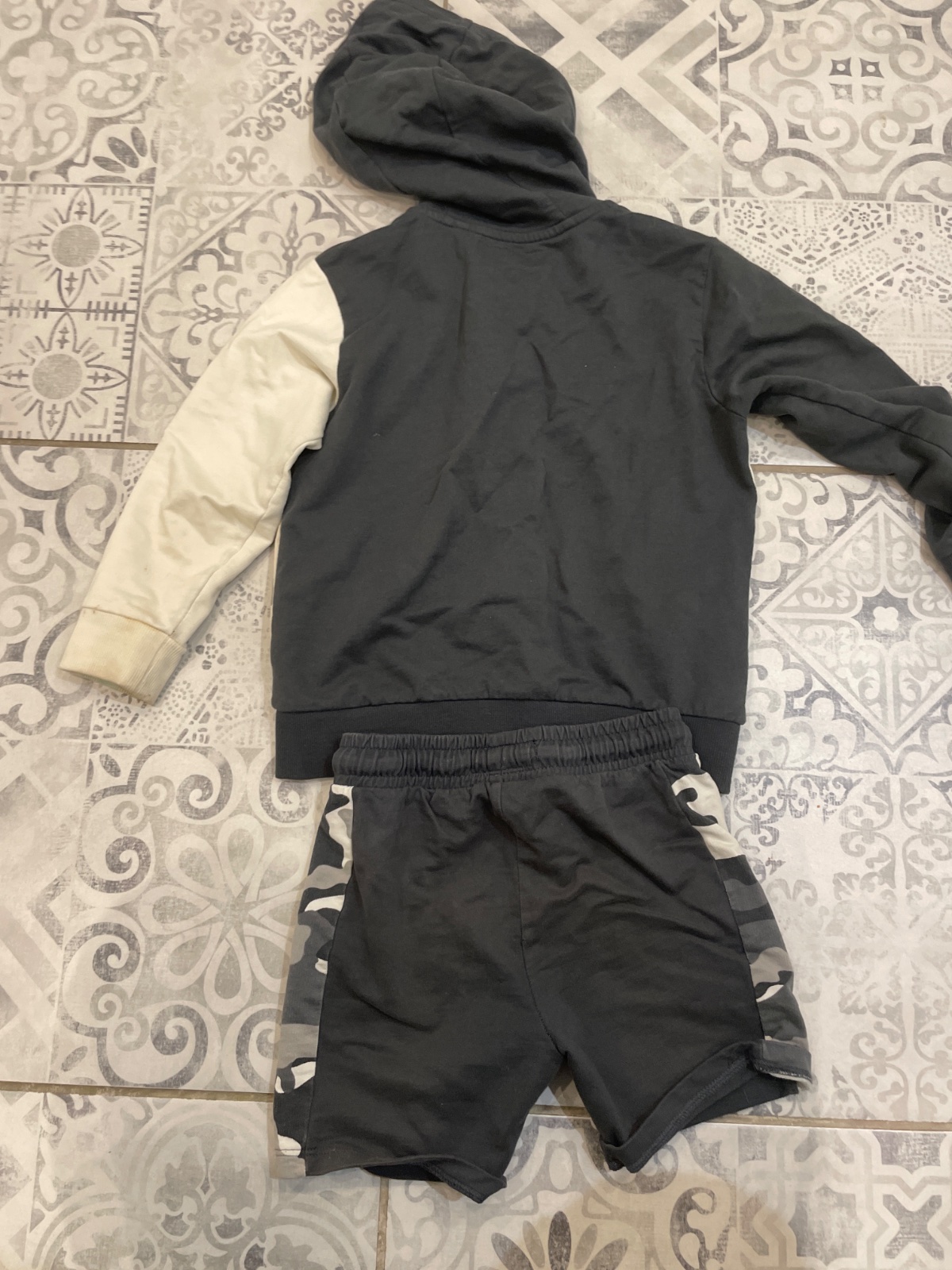 Kupovaná nová z next, syn nosil 2 sezóny, stav je dobrý, aj keď tá biela už nie je celkom biela, ale zohľadnené na cene. Je to tenší materiál, super na leto. Cena za súpravu.