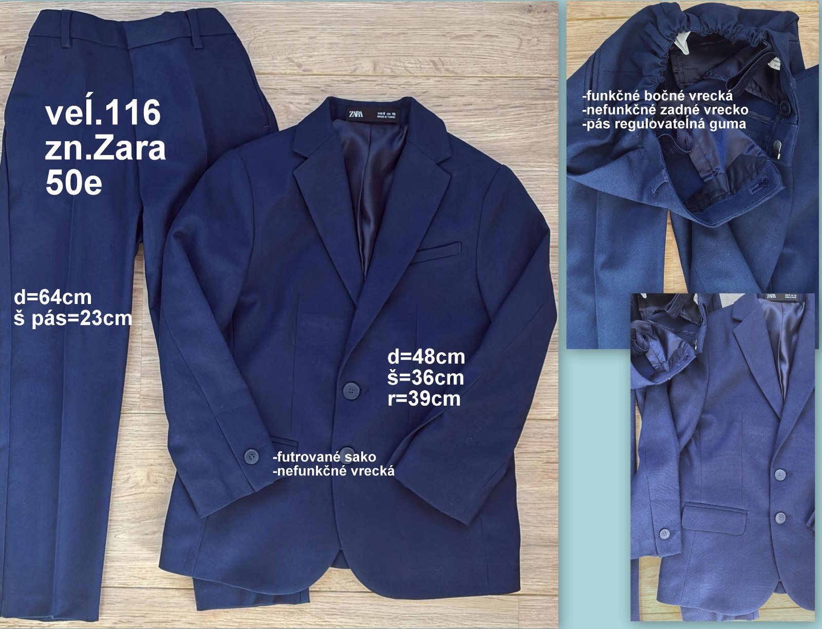 Predám chlapčenský tmavomodrý oblek veĺ.122, zn.Zara, sako: rozmery d=48cm, š=36cm, r=39cm, futrované, 2 nefunkčné dolné vrecká s klopou, 1 nefunkčné na prsiach, nohavice: d=64cm, š pás=23cm, regulovateĺná guma, zapínanie na široký háčik aj gombík (viď foto), 1x oblečený ako nový.