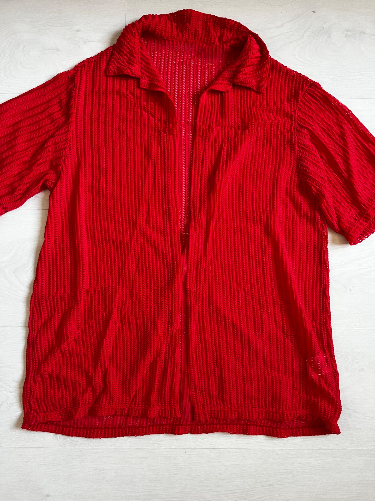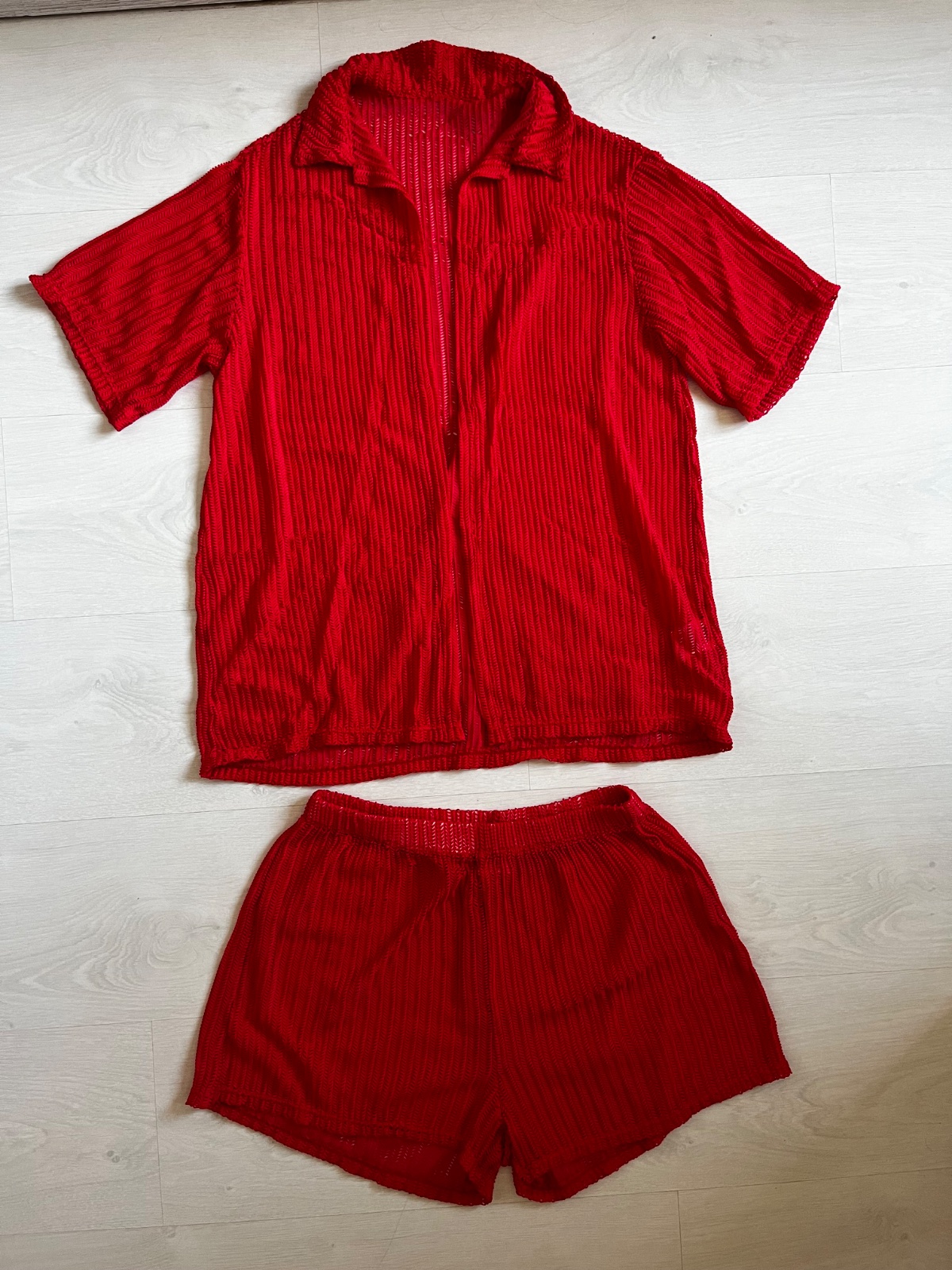 Novy set cervene nohavice a kratky top, uvedena velkost M, ale sadnu na S. Sirka v pase neroztiahnute 30 cm, v pase je guma takze sa prisposobia. Dlzka 110 cm. V galérii sú aj moje real fotky.