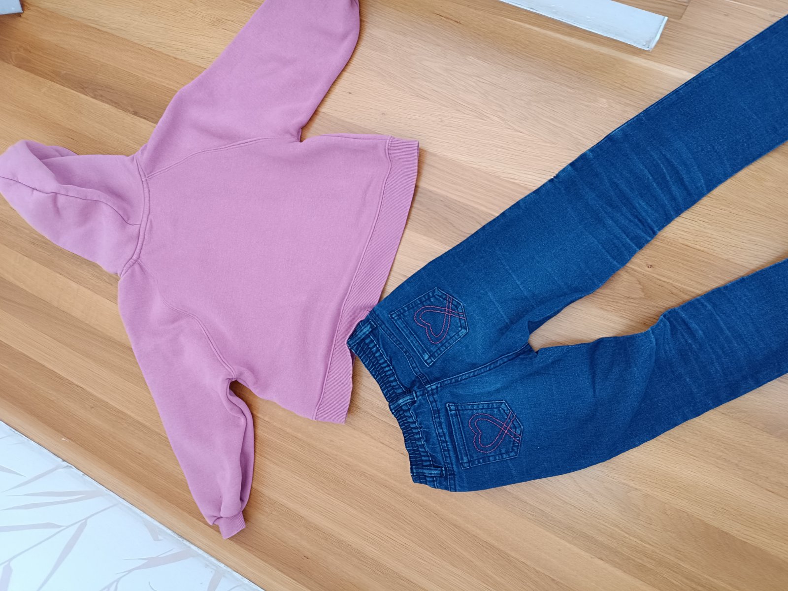 Moderný setík pre dievčatko. Mikina moderného strihu perfektne pasuje k nohaviciam, ktoré sú nastaviteľné v páse. V prípade záujmu viem pozrieť ešte viac oblečenia z tejto veľkosti a predať za rozumnú cenu ako balik