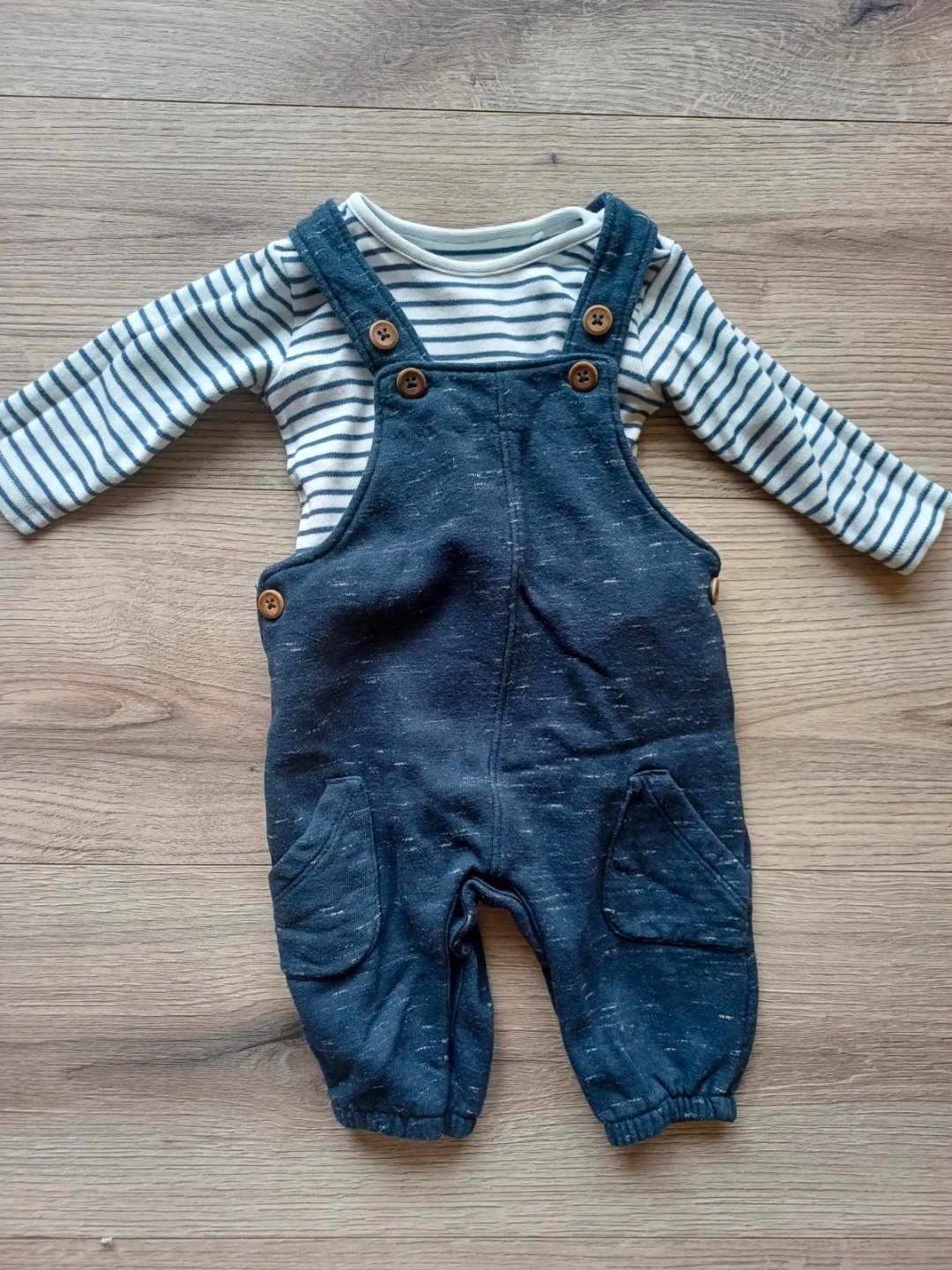 Krásny nový kompletík (nohavice na traky + tričko). V zime nám v ňom bolo chladno a teraz nám je malý. Veľkosť do 3 mesiacov.