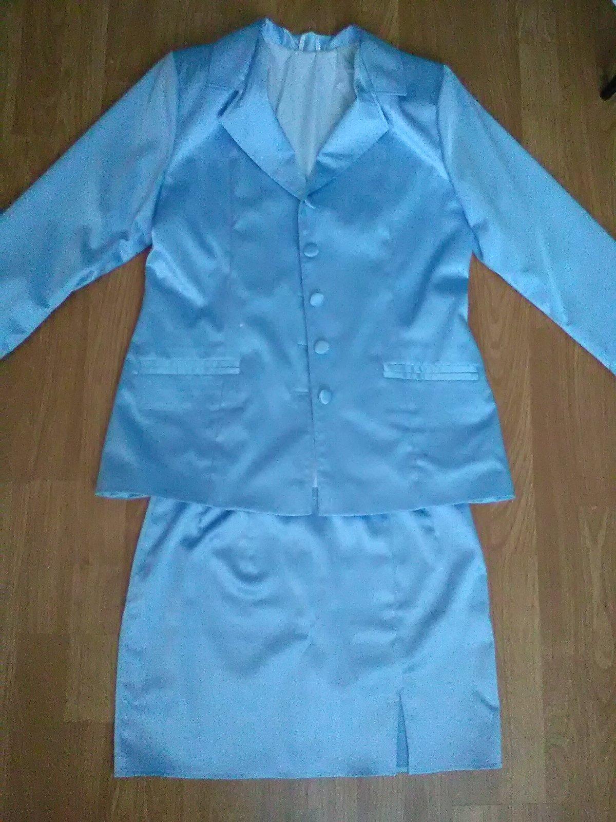 Bledomodrý dámsky kostým, klasický strih. pozostáva zo šiat, pekne obopinaju postavu a predlzeneho saka. Da sa pekne kombinovat aj s inymi farbami.