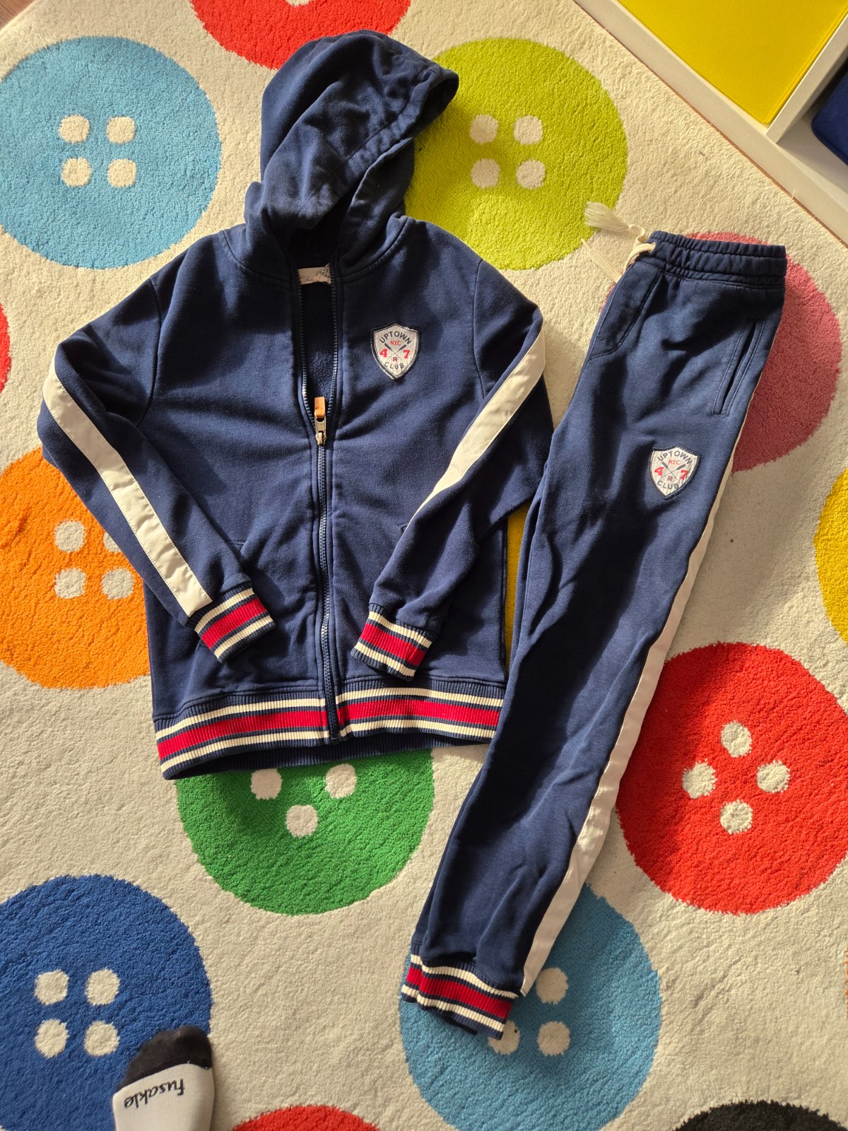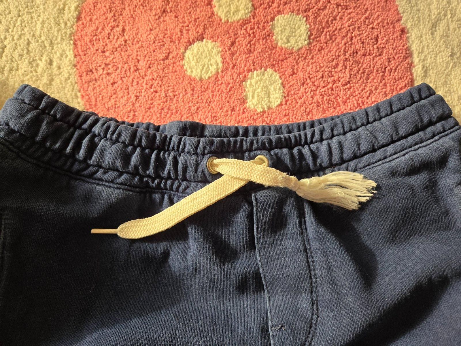 Nosena teplakova súprava v dobrom stave, iba na šnúrke na páse odpadla koncovka a je tam uzlík, pás je na gumu tak šnúrku sme ani nepotrebovali, je to dvojcislo 134/140.