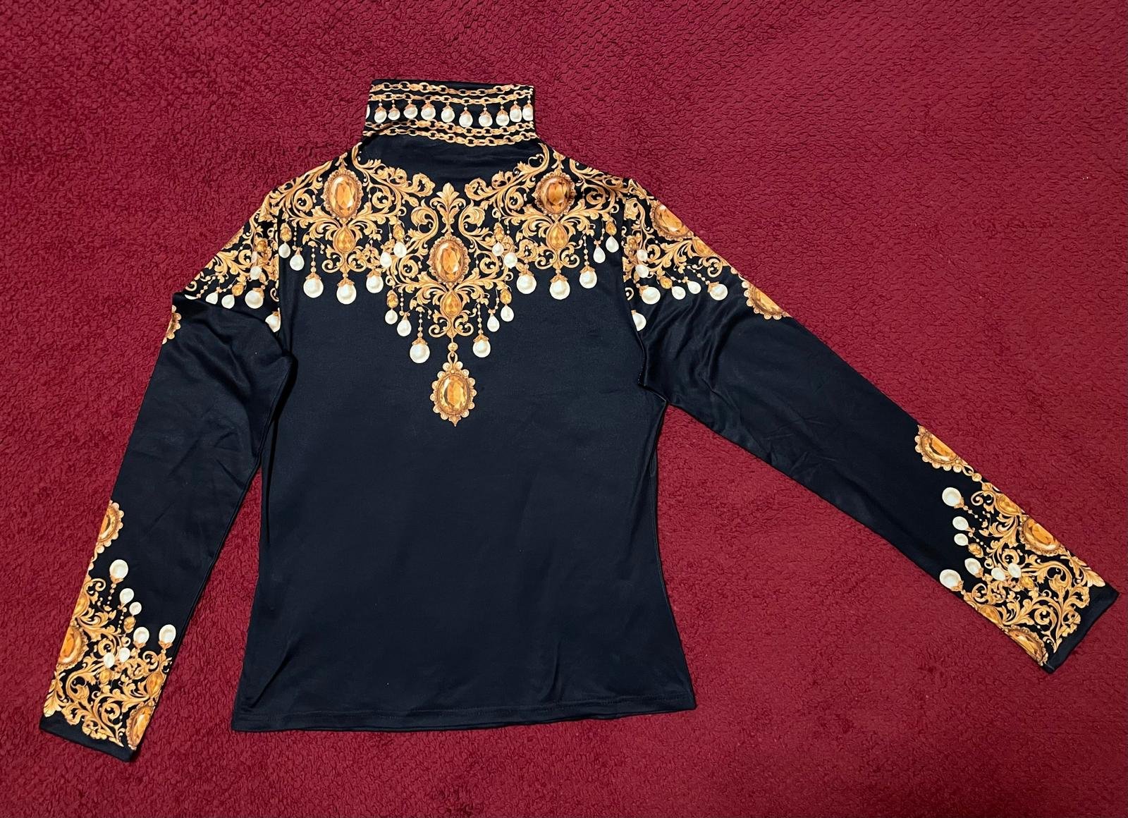 Set : tričko s zlato hnedá sukňa v. S nové tričko sme objednali v.L, aj na štítku je v.L, no je strašné malé, ako S. Cez prsia je namerané 46 cm.. cena 12€. Sukňa bola objednana v. XL, tiež je malá. Pás v kľude je 80 cm cena 8€. Alebo spolu za 15 EUR. Bolo to kupované samostatne, nie ako súprava . + Poštovné