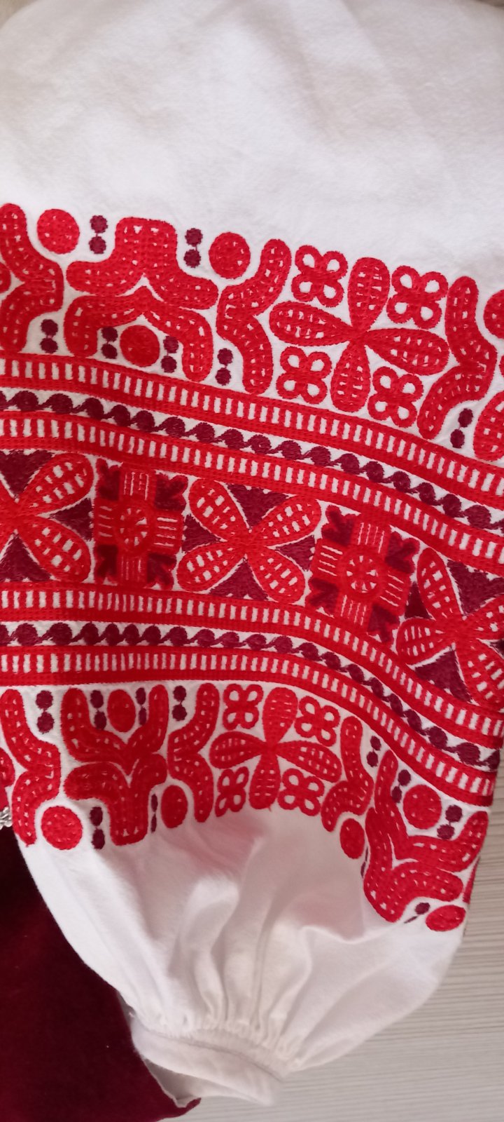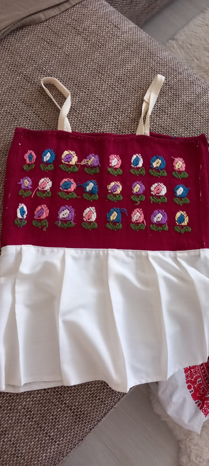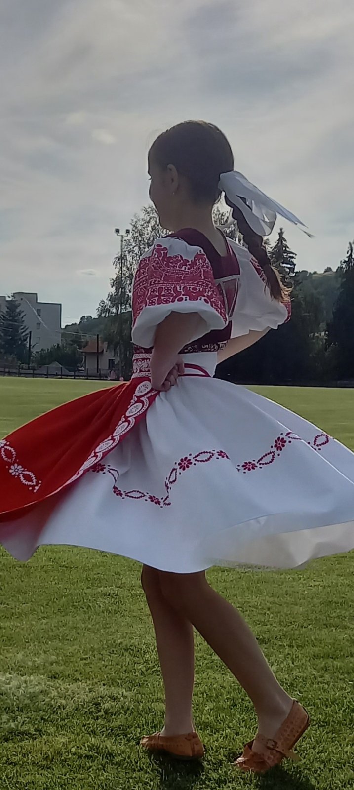 Krásny kroj, komplet na cca 10 ročné dievča, stánka, ľajblík nositeľný dlhšie, krásne červené oplecko, vyšívané strojom, staroverský vzor, nositeľné dlhšie, široká bohato riasená sukňa so zásterou. Cena s poštou doporučenou 1 trieda.