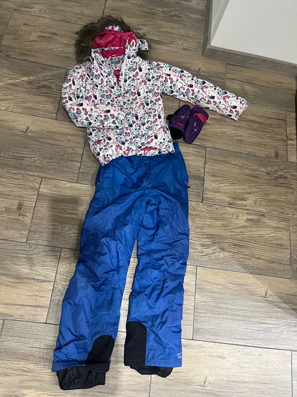 Krasna suprava na lyžovanie vhodna po velkost 164, nohavice lidl Crivit bundicka Lewro s vnurornym zapinanim a vreckom, kapucňa odnimatelna..v cene aj rukavice