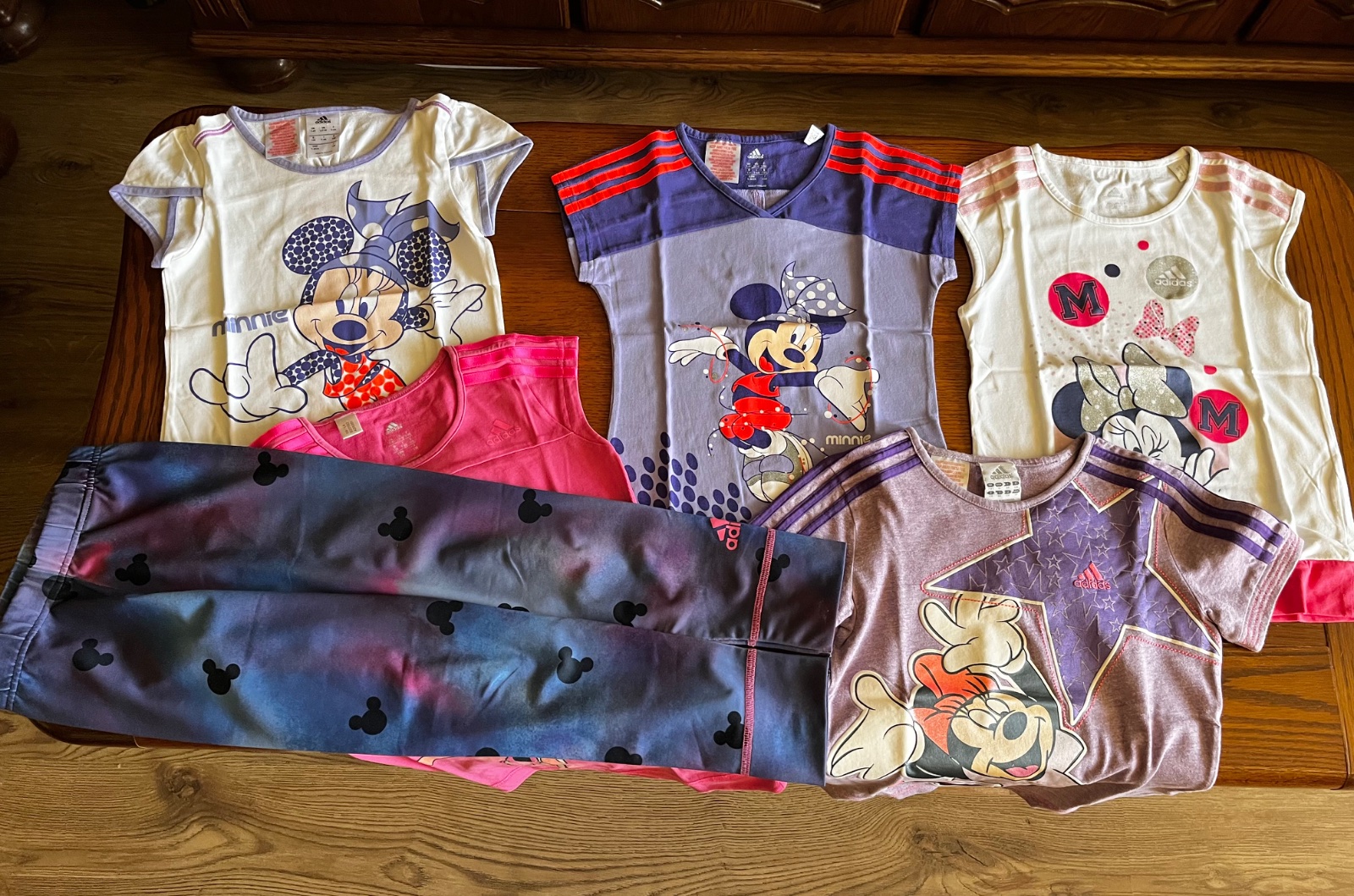 Súpravka sa perfektne hodí s ďalšími tričkami Adidas kolekcia Minnie Mouse z ponuky nášho bazárika (viď fotky k inzerátu). Môžete si variabilne kombinovať rôzne verzie outfitu.