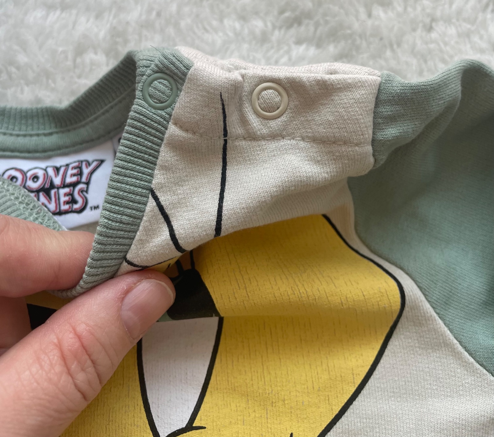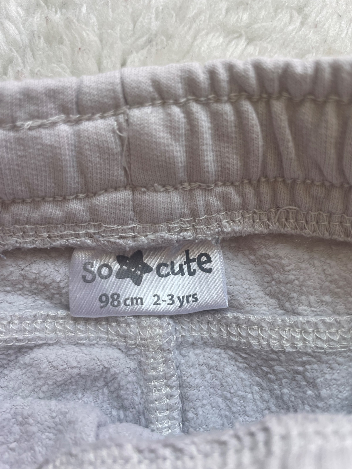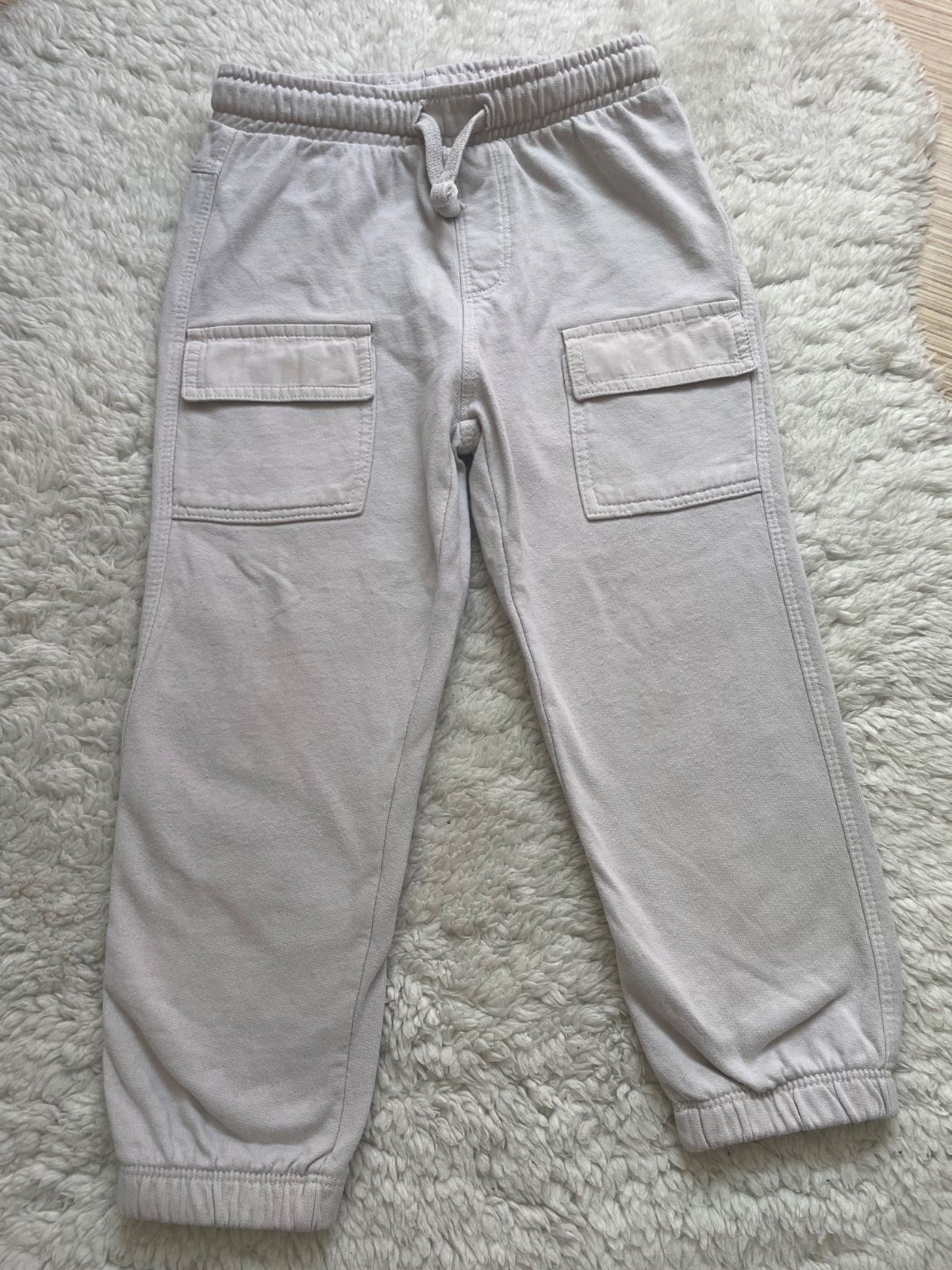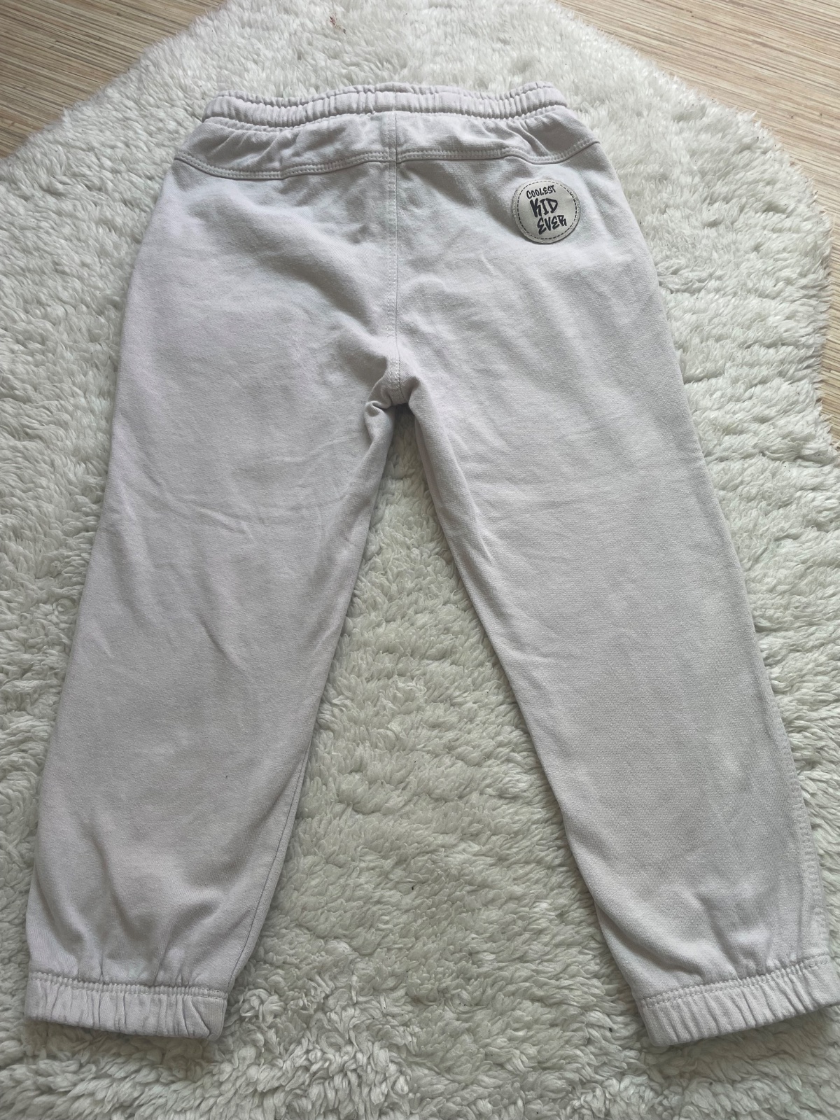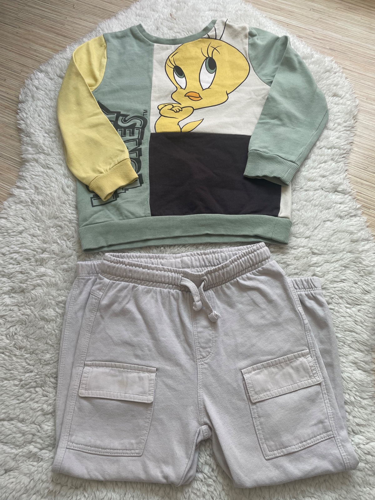 Bavlnena suprava kremovych teplakov na gumu a snurku v pase, predne kapsacove vrecka, zn. Pepco, k tomu sme nosili farebnu mikinku s postavickou Tweety zn. Looney Tunes. Mikina ma 2 cvocky pri krku, je bez flakov, postavicka je jemne popraskana. Teplaciky su viac nosene, kolienka su predratejsie, este nie do dierok, vsimla som si fliacik na vrecku a 1 cm rozparanie nitky.