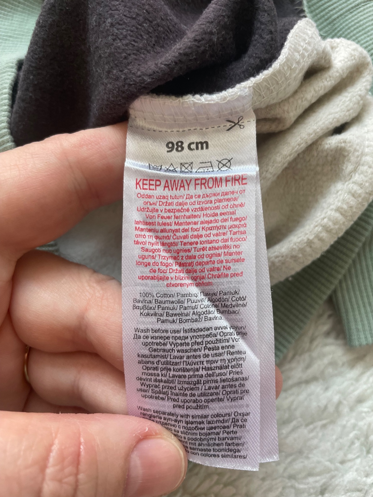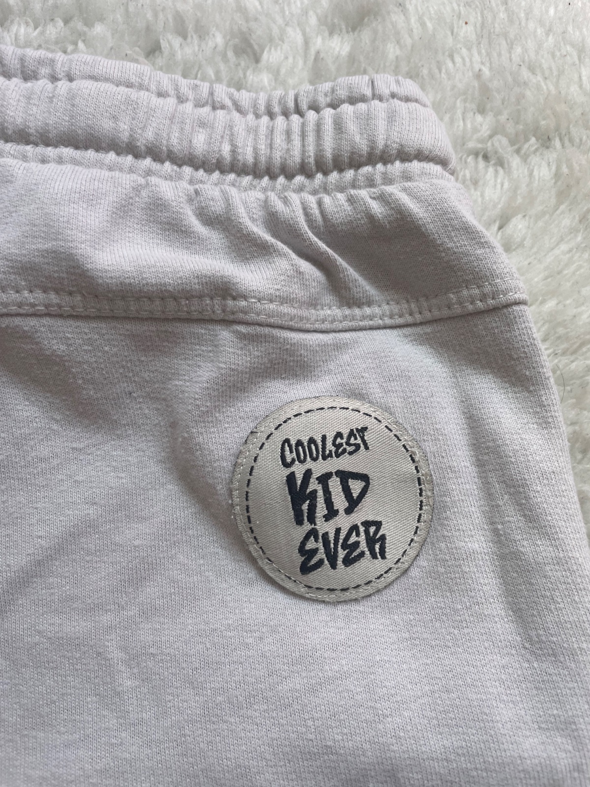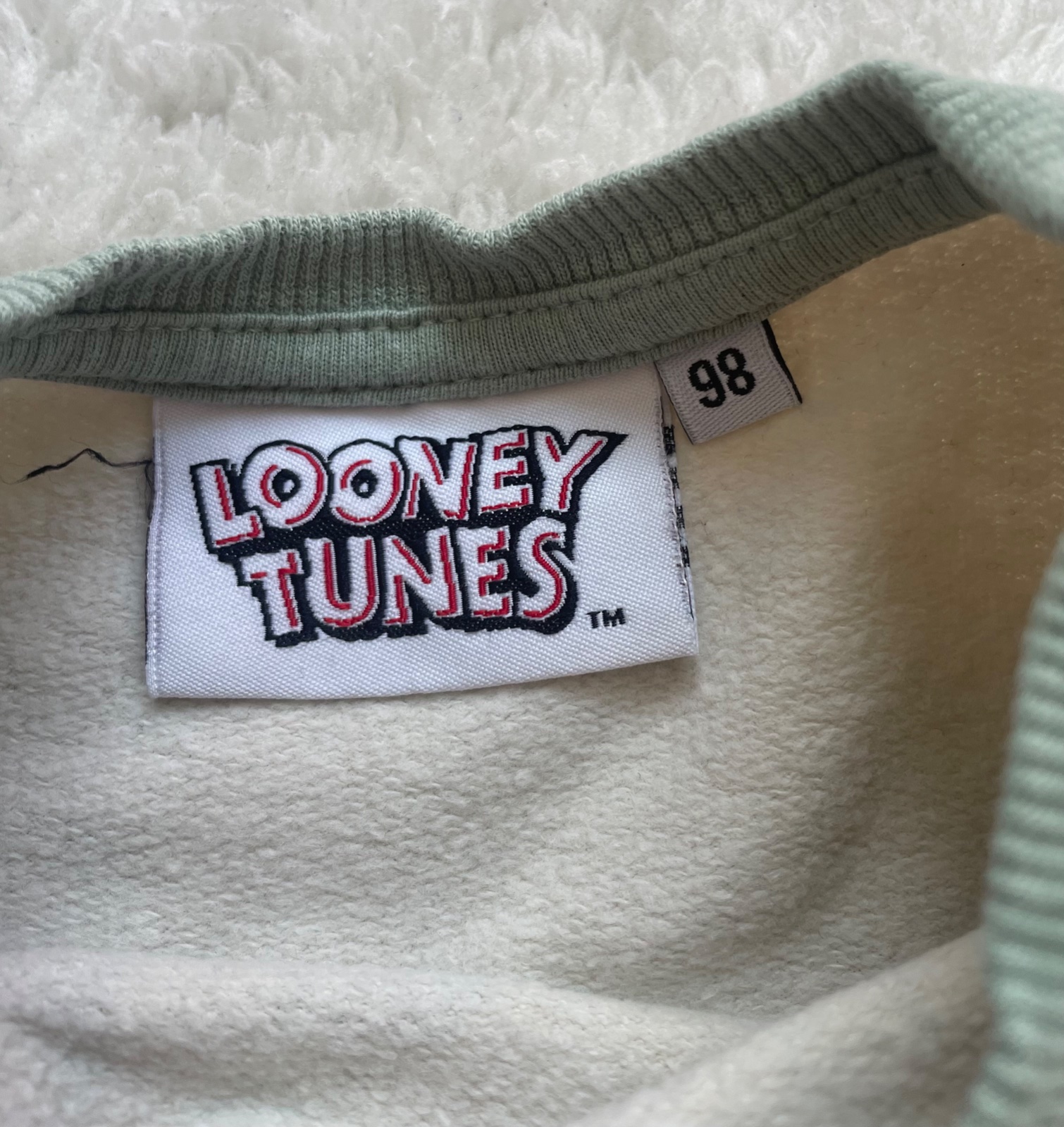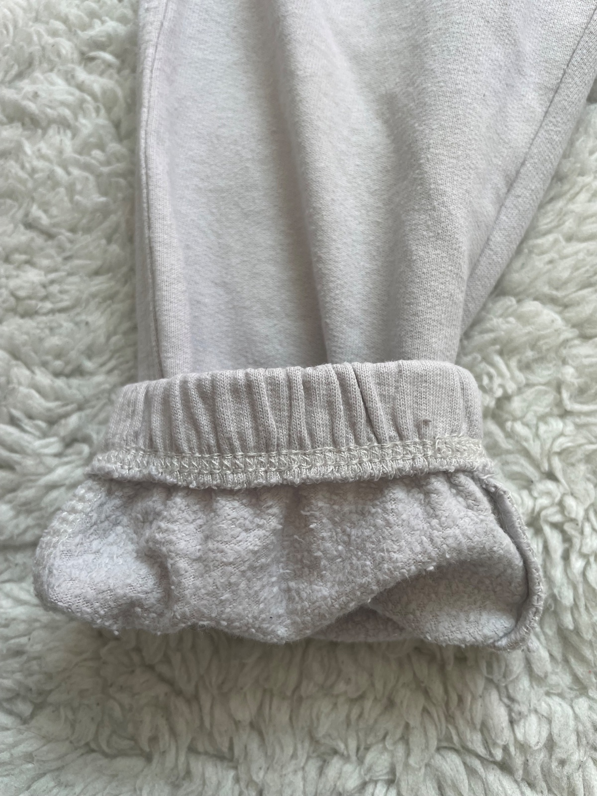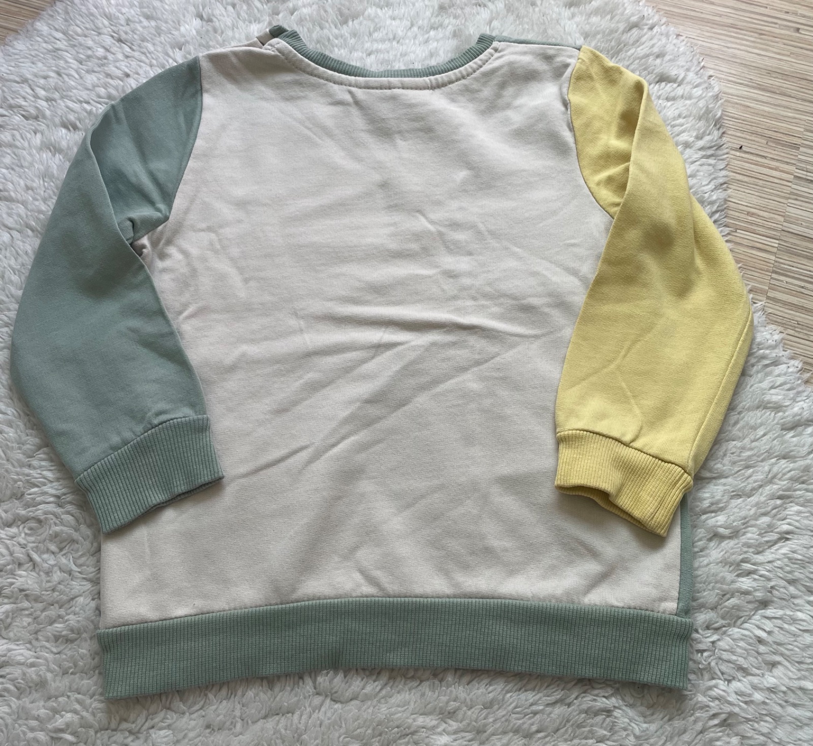 Bavlnena suprava kremovych teplakov na gumu a snurku v pase, predne kapsacove vrecka, zn. Pepco, k tomu sme nosili farebnu mikinku s postavickou Tweety zn. Looney Tunes. Mikina ma 2 cvocky pri krku, je bez flakov, postavicka je jemne popraskana. Teplaciky su viac nosene, kolienka su predratejsie, este nie do dierok, vsimla som si fliacik na vrecku a 1 cm rozparanie nitky.