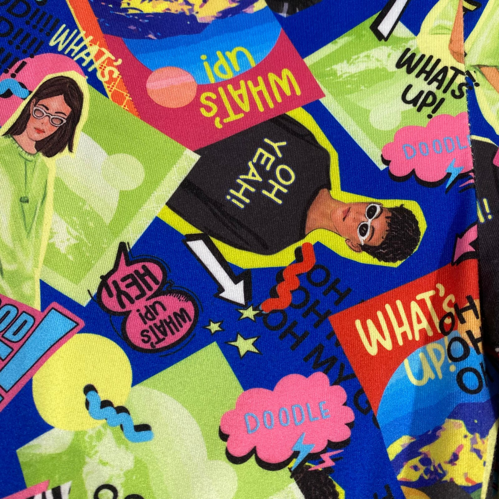 Módna súprava v neónovej farbe. Tenká mikina s kapucňou, s čiernym nápisom. Dĺžka je 66cm, šírka je 52cm, dĺžka rukáva 46cm. Rôznofarebné obrázkové legíny, príjemného materiálu, dĺžka je 89cm, šírka je 30-40cm. V dobrom stave.