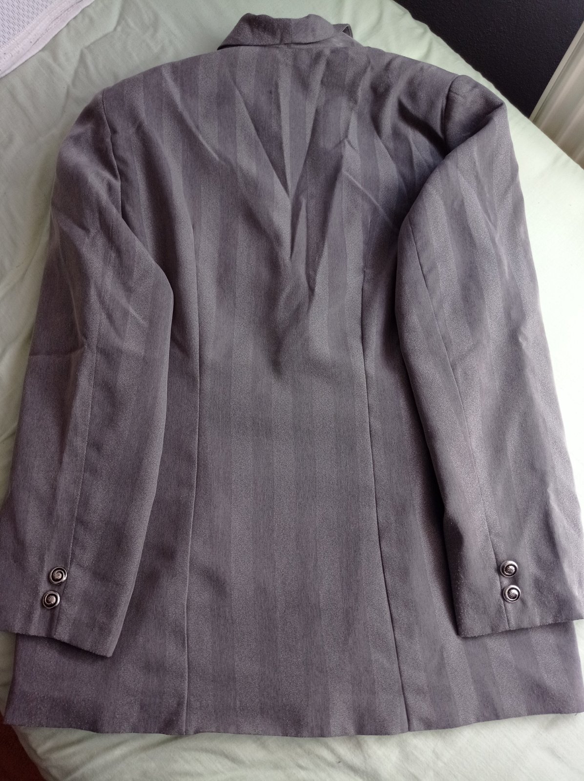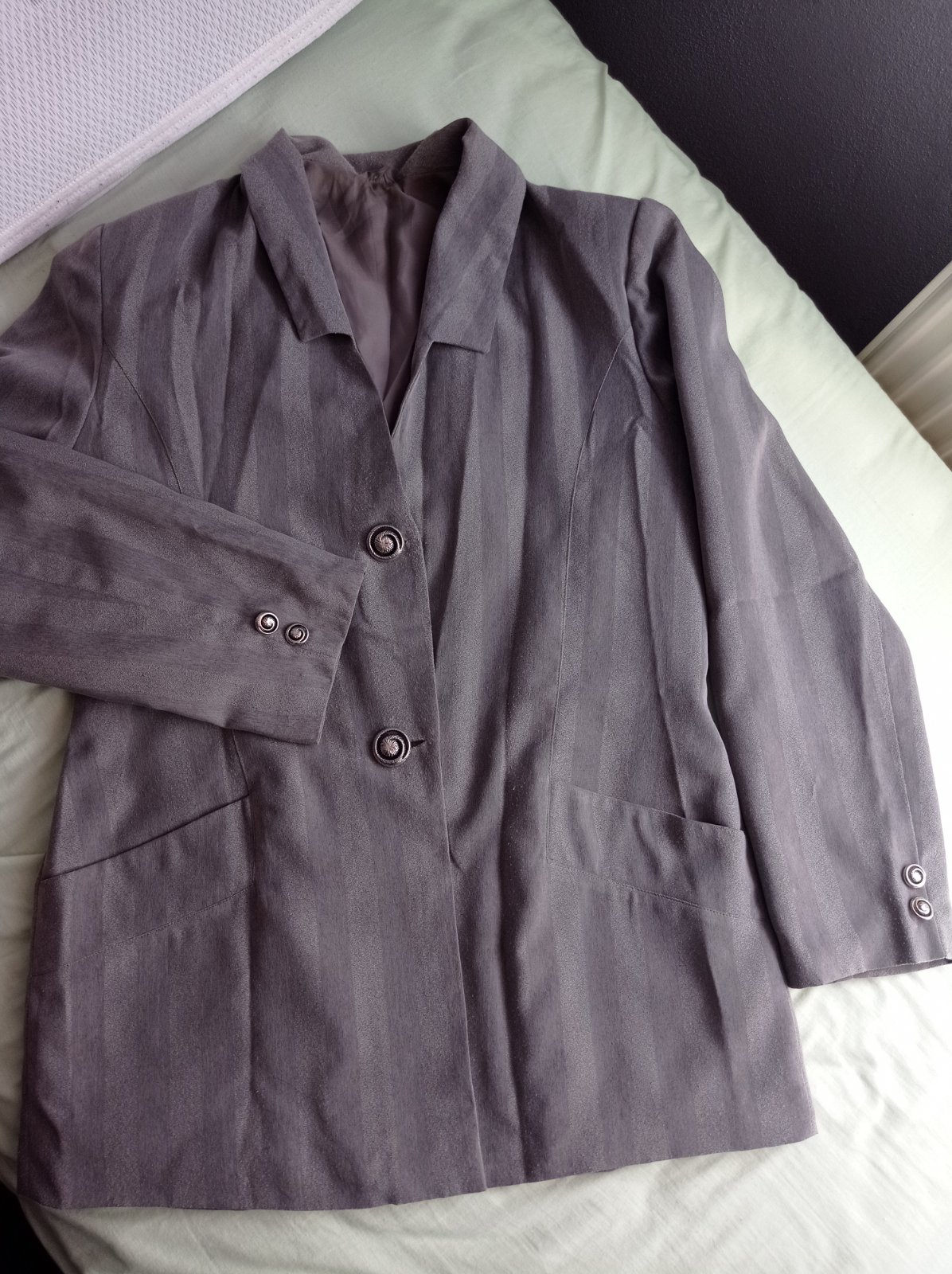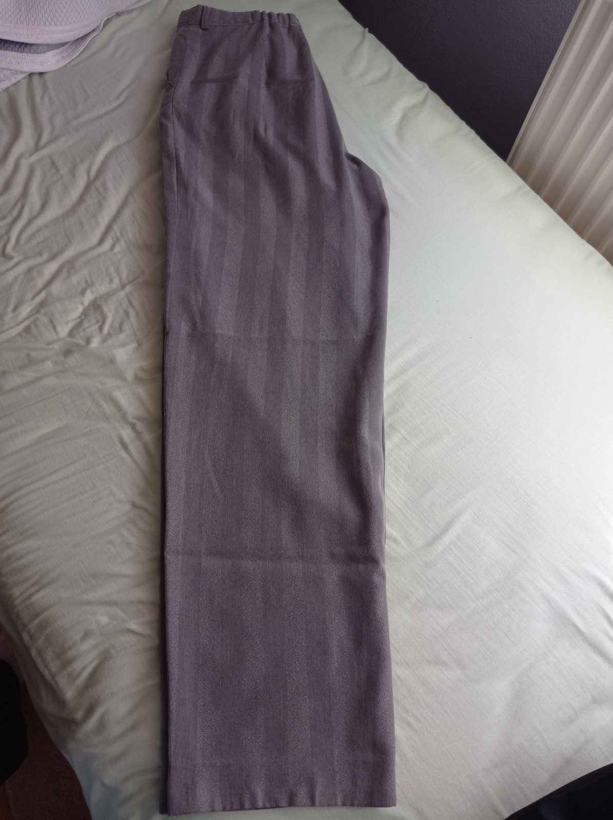 Predám tento trojkusový kostým veľkosti +- 42, v super stave, len pokrčený popri sťahovaní sa. Sako je s podšívkou a hlbokými vačkami, meria 81cm na dĺžku, 54cm na šírku v oblasti podpazušia, rukávy 46cm od podpazušia a 64cm od ramena. Sukňa je 50cm dlhá, pás +-41cm, v malej časti je v páse guma, ale treba ju tam novú - viz foto. Nohavice sú dlhé 112cm, pás +- 42cm, opäť sčasti vzadu je na gumu, ktorú tam treba novú.