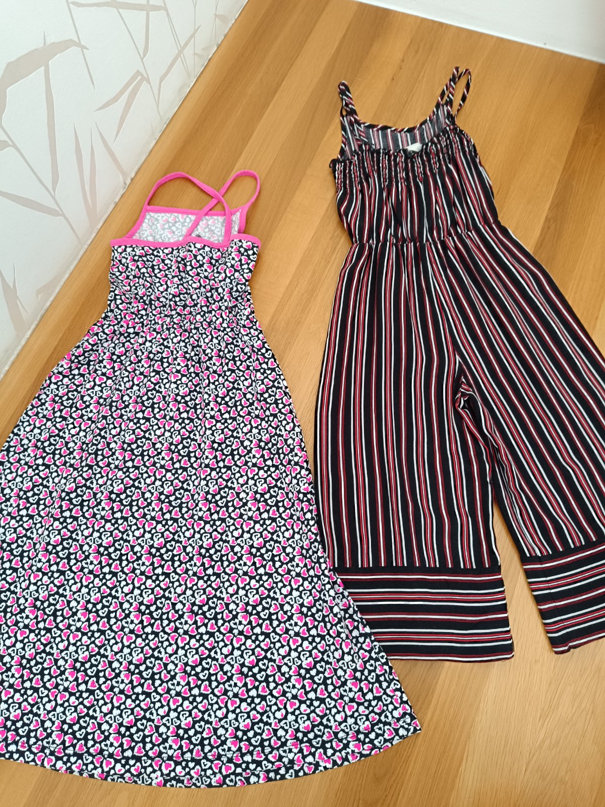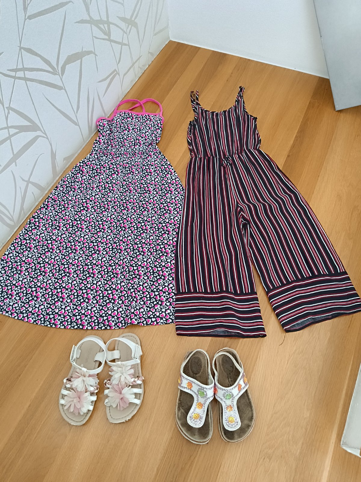 Setík letného oblečenia. Overal aj dlhšie šaty veľmi príjemný vzdušný materiál. Bez poškodenia . Topánočky nosené viac-ako bonus za symbolickú cenu. Na fotkách ešte nečistené